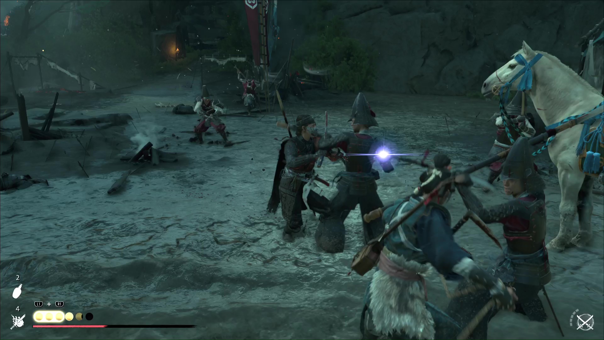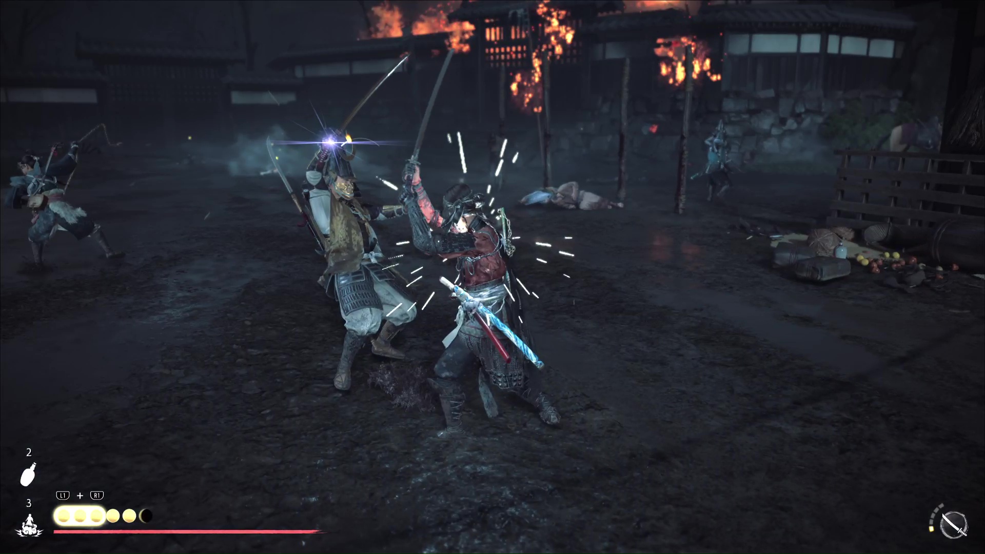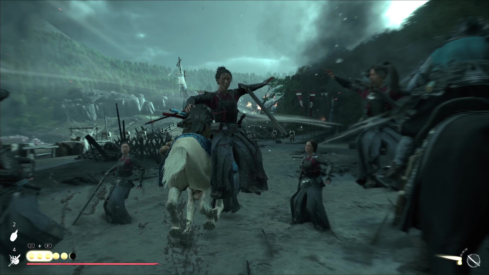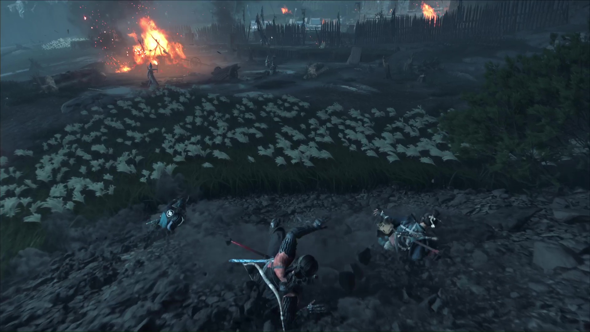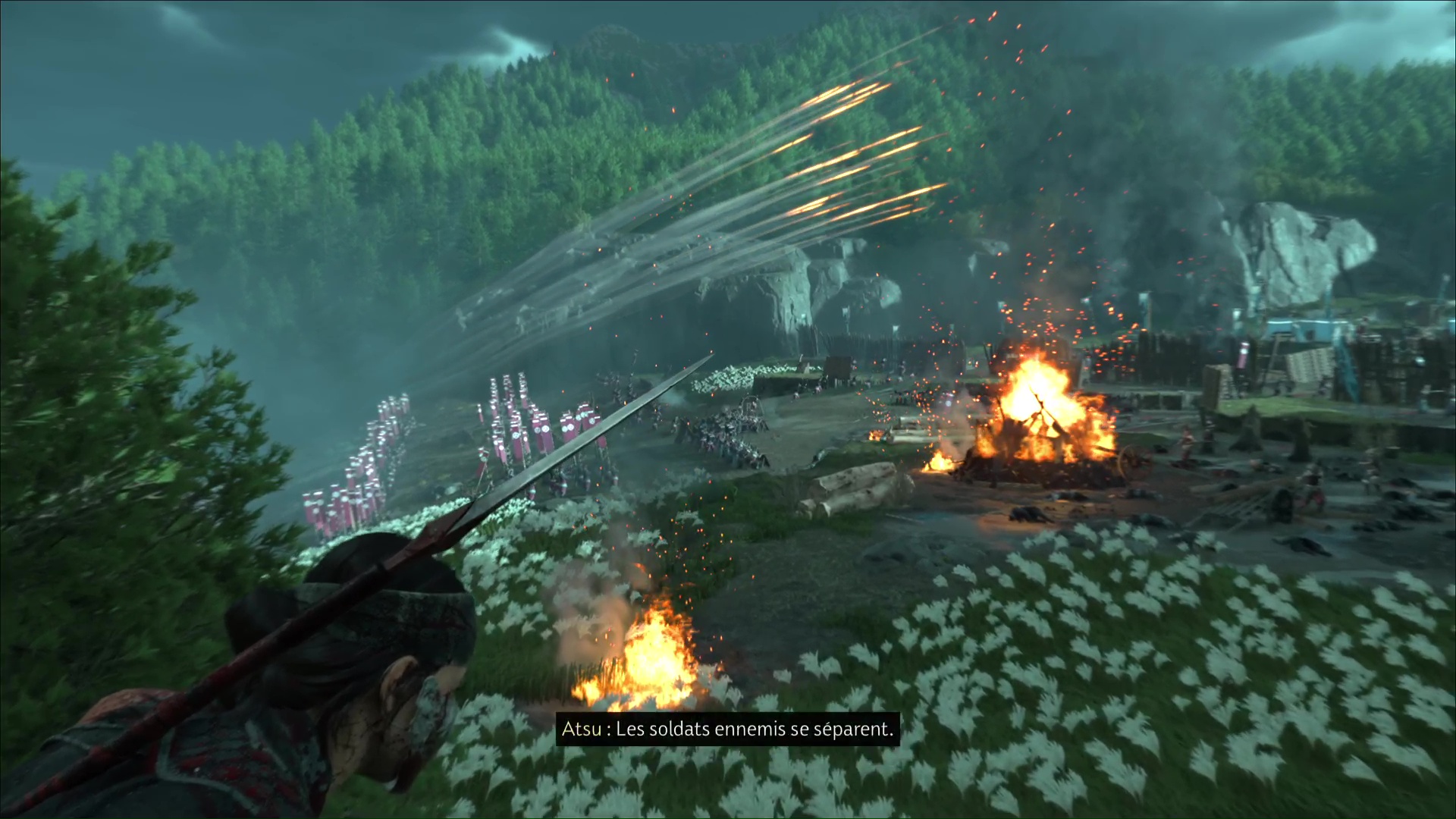 Sans plus attendre, vous partez à cheval pour essayer de rejoindre Jubei. Vous traversez un village incendié au bout duquel Atsu retrouve son frère, en tenue de combat.