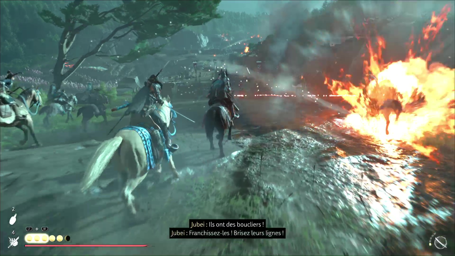 Jubei sonne ensuite la charge mais les défenses de Saito font tomber des samouraïs les uns après les autres. Quand vous approchez du barrage de tireur, lancez une charge avec votre cheval.