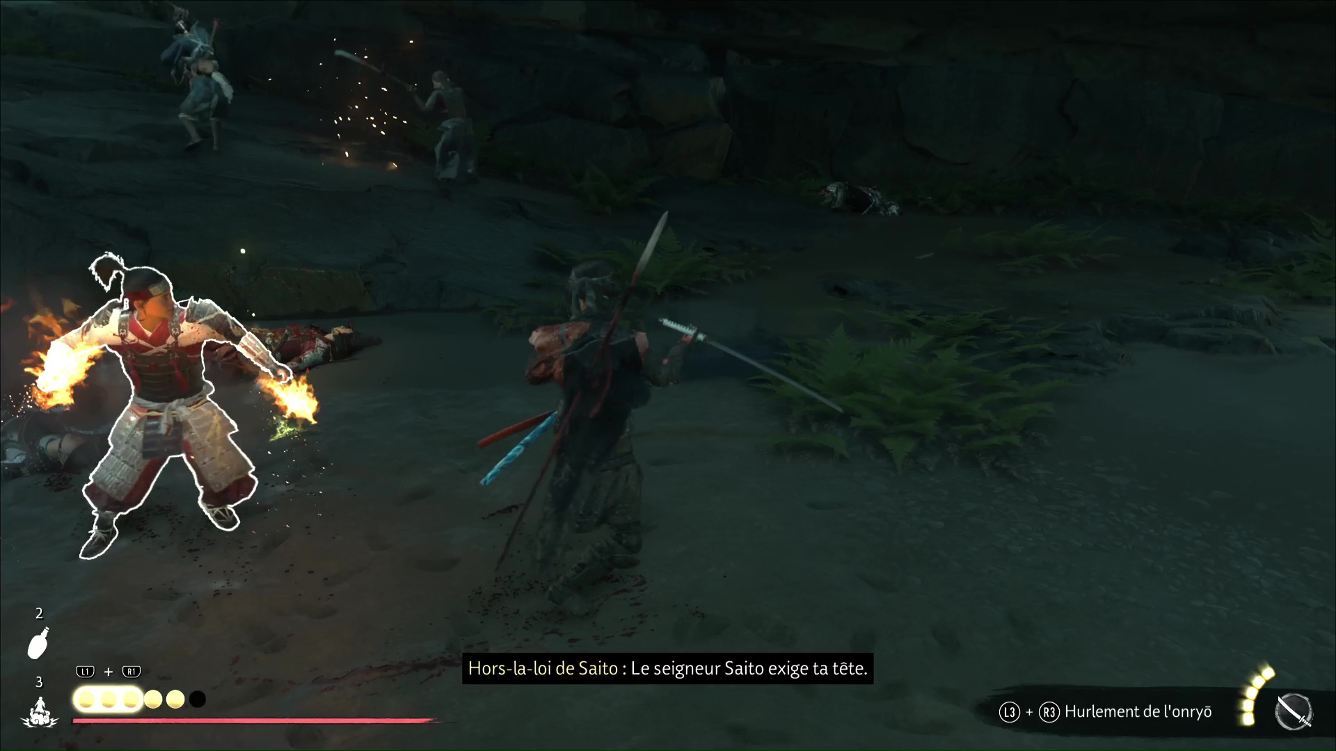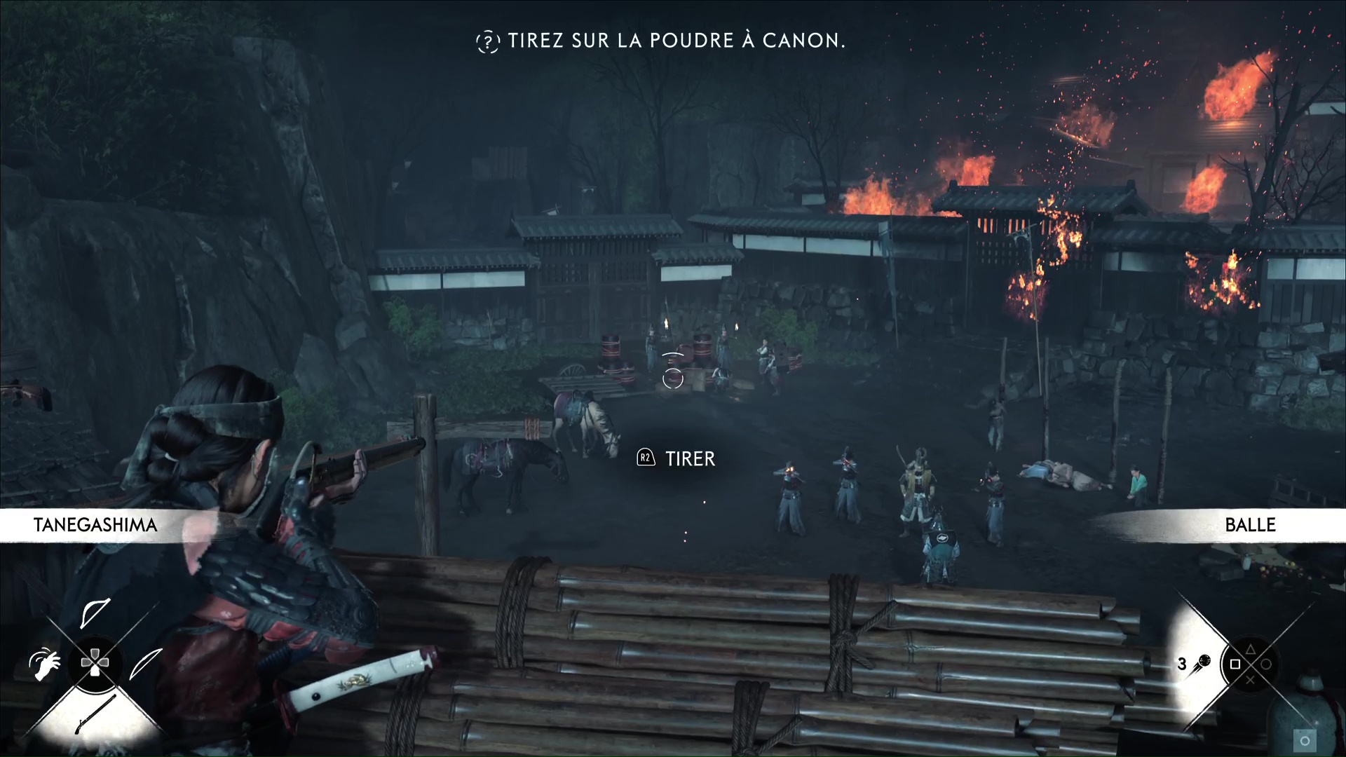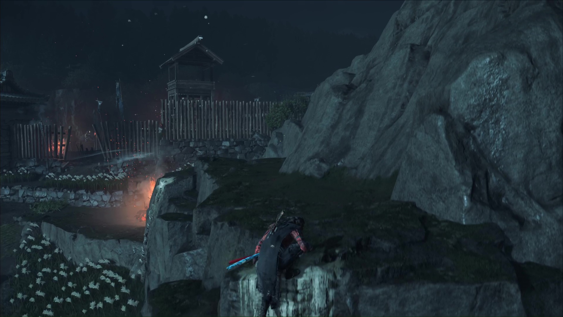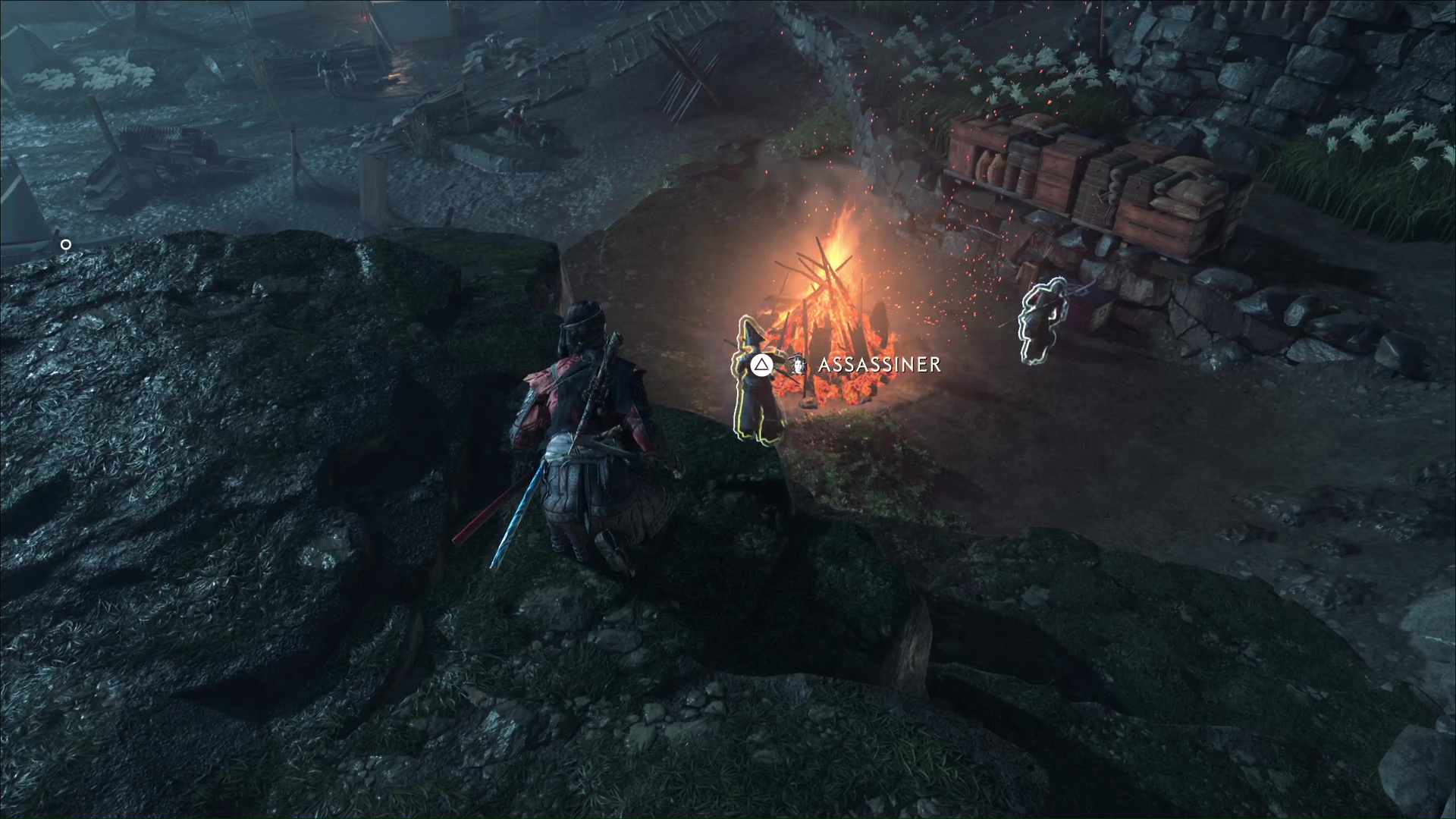 De l’autre côté, longez la droite de la zone pour débarquer au pied d’une paroi rocheuse. Escaladez-la pour à la fois progresser incognito et avoir un visu confortable sur le camp. Un peu plus loin, assassinez deux soldats près d’un grand feu, grâce à Oyuki.