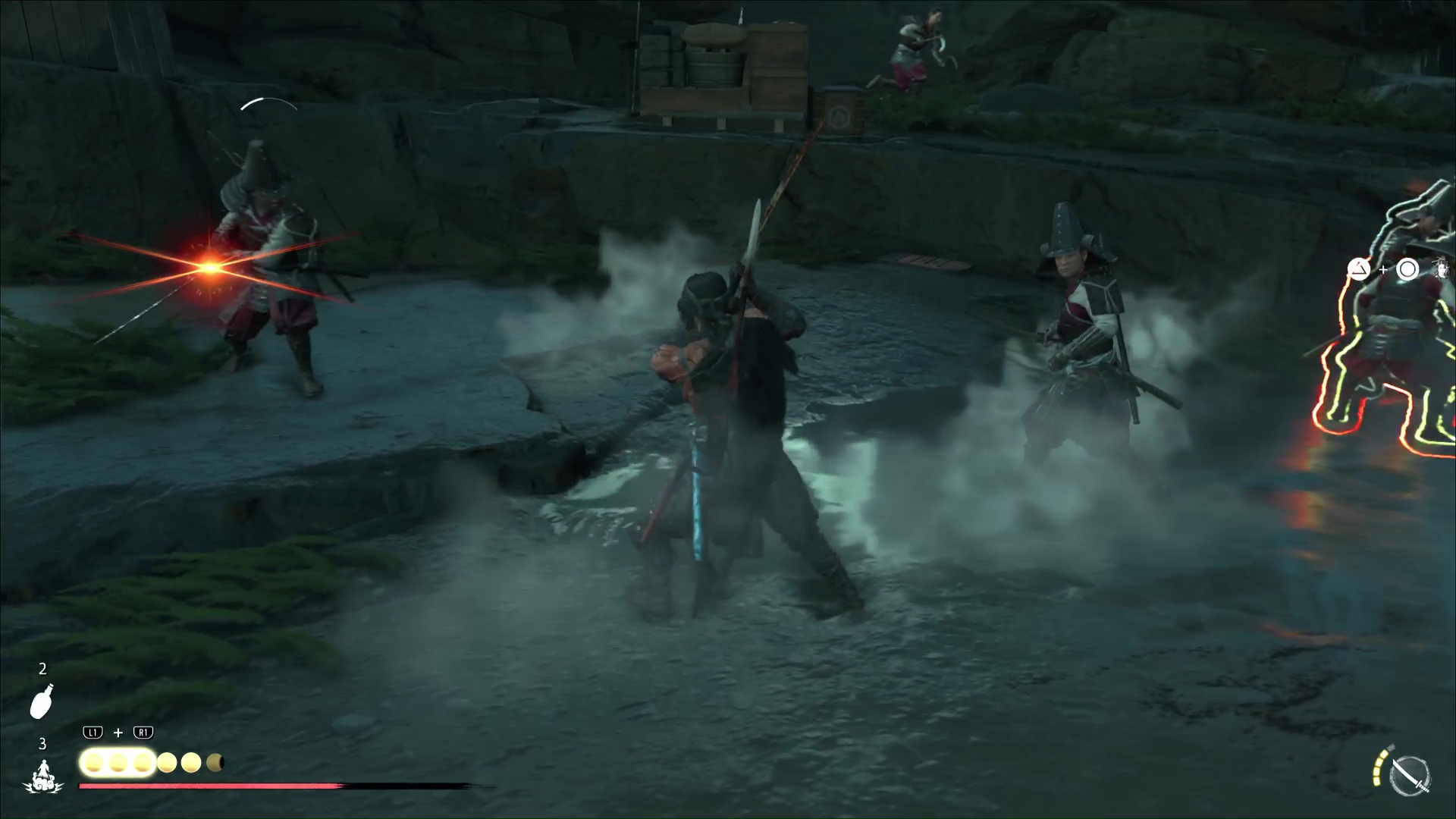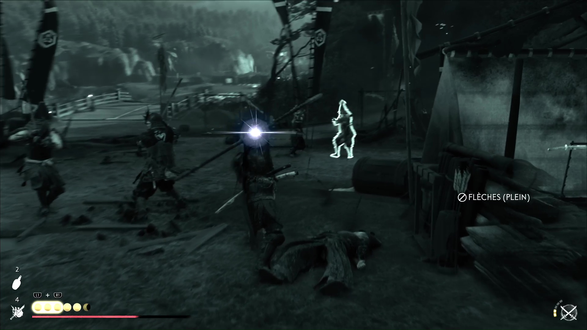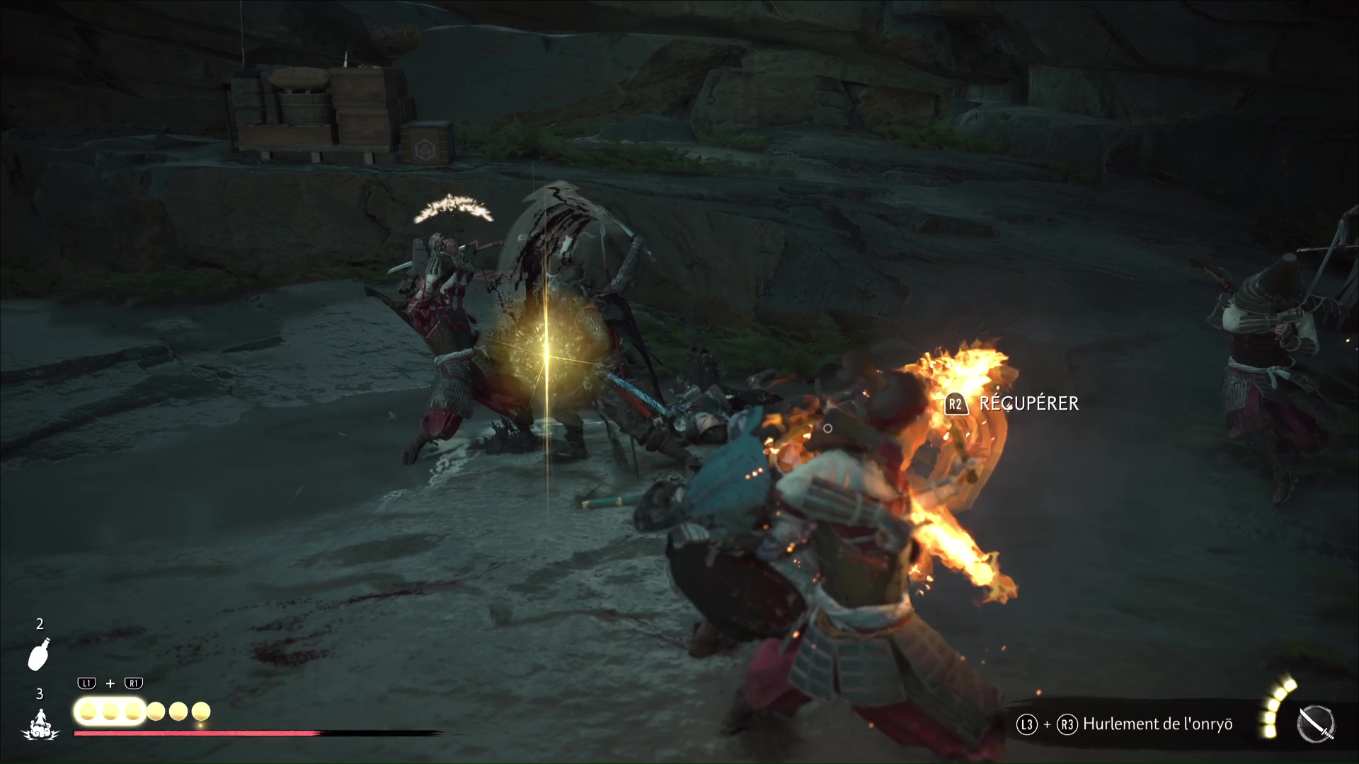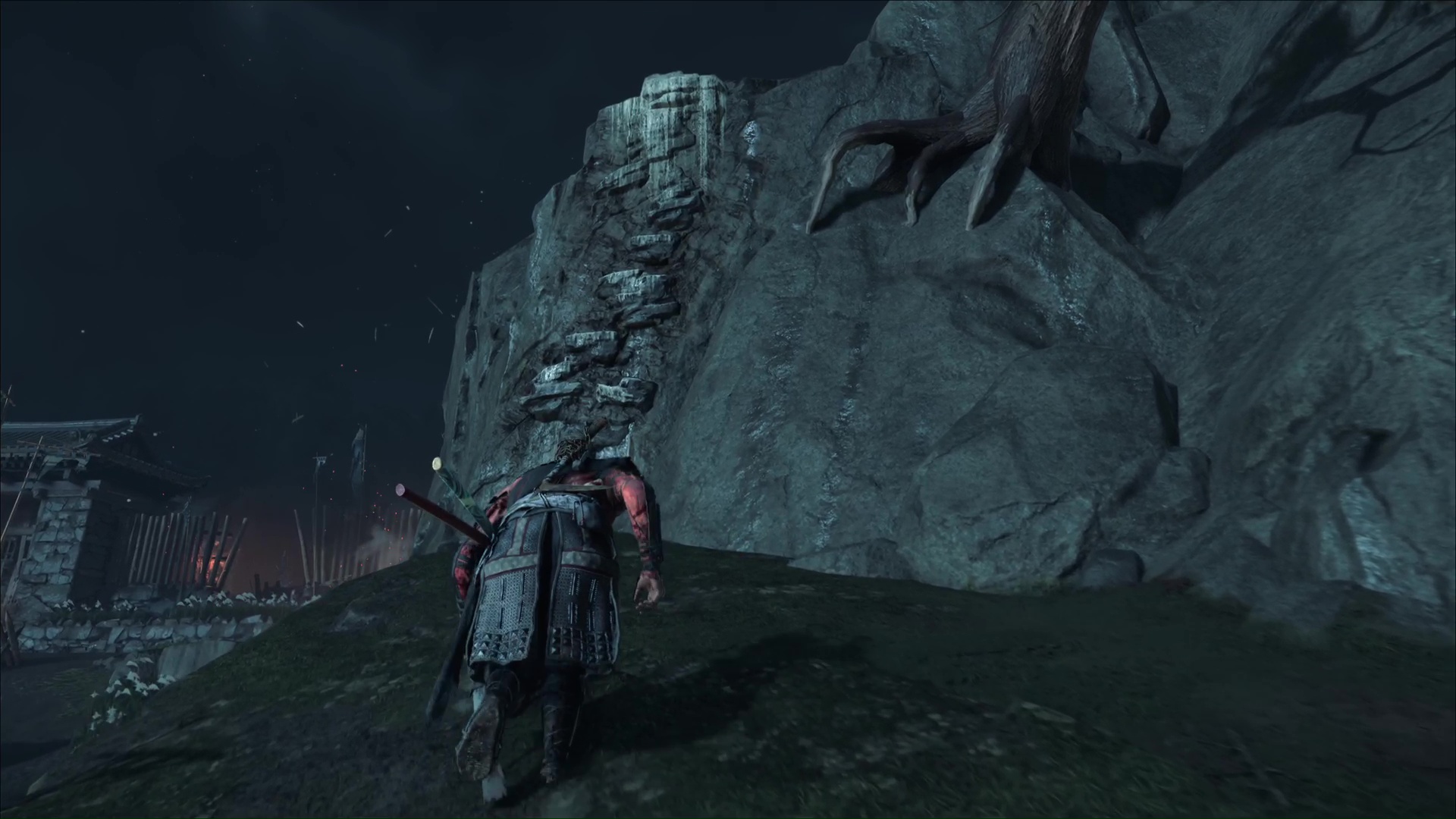 De l’autre côté, longez la droite de la zone pour débarquer au pied d’une paroi rocheuse. Escaladez-la pour à la fois progresser incognito et avoir un visu confortable sur le camp. Un peu plus loin, assassinez deux soldats près d’un grand feu, grâce à Oyuki.