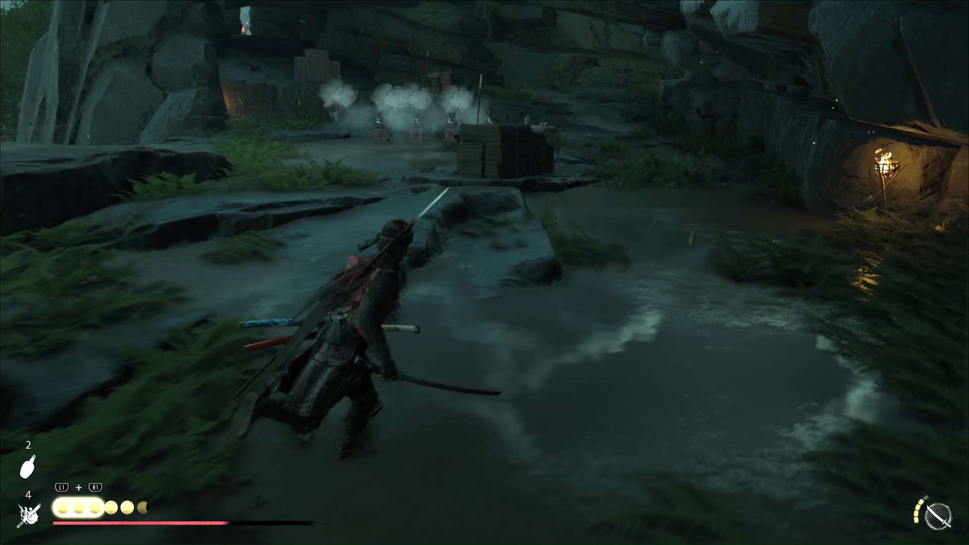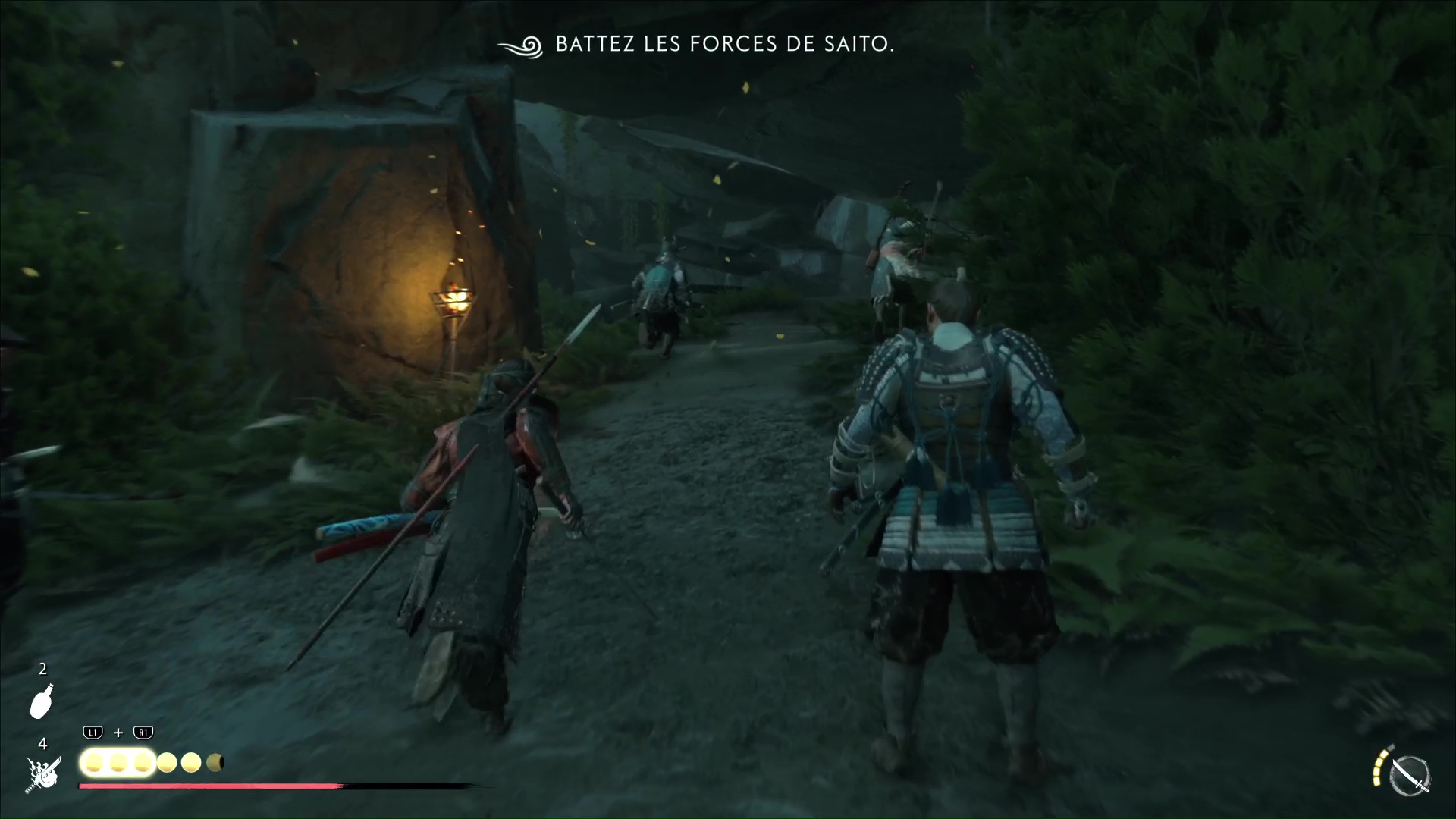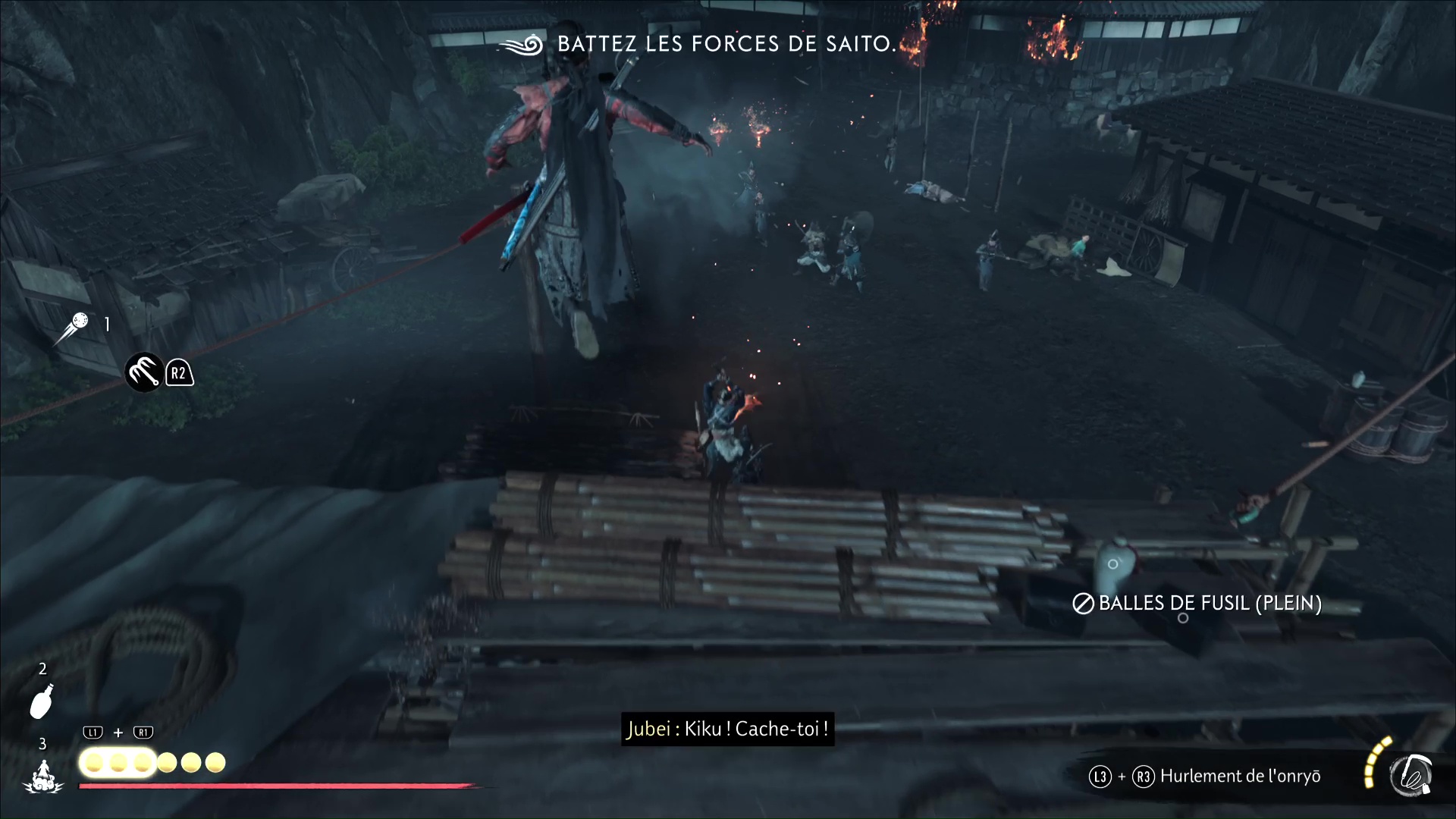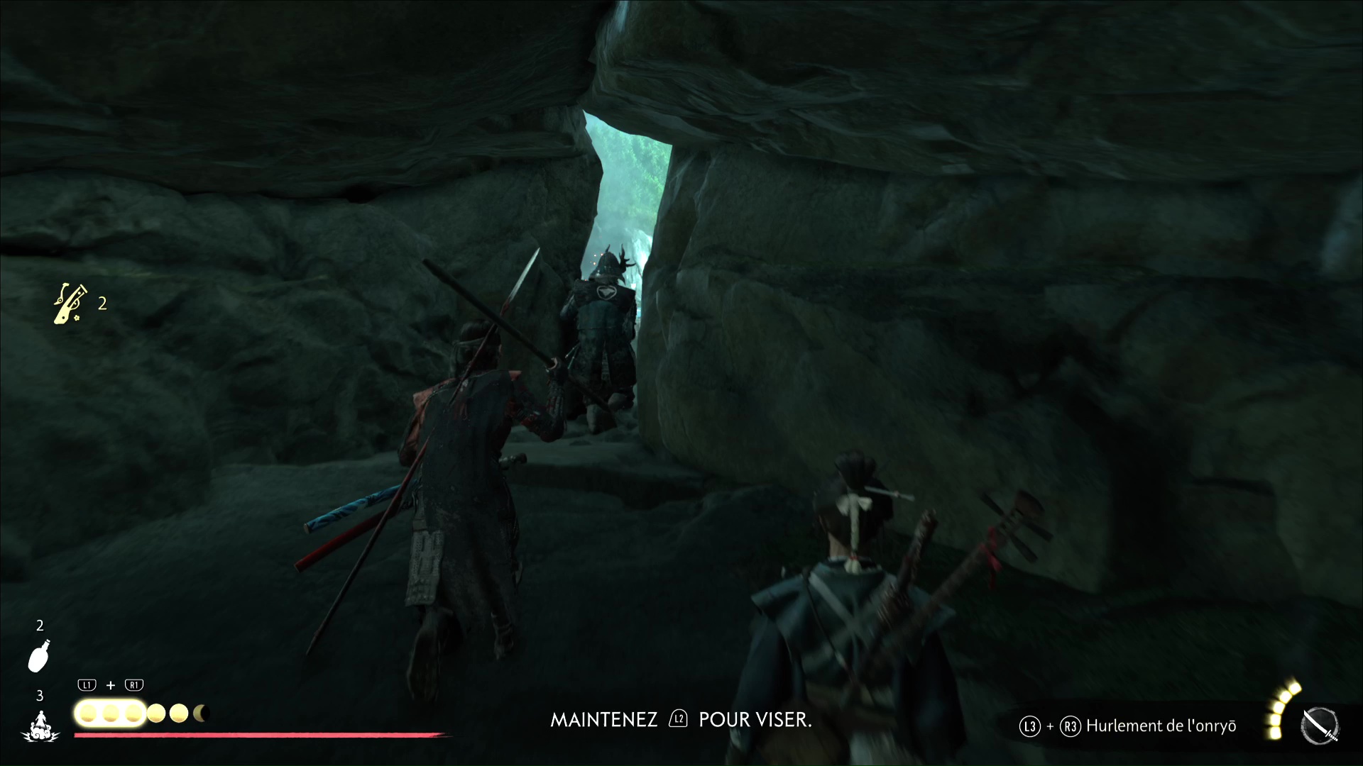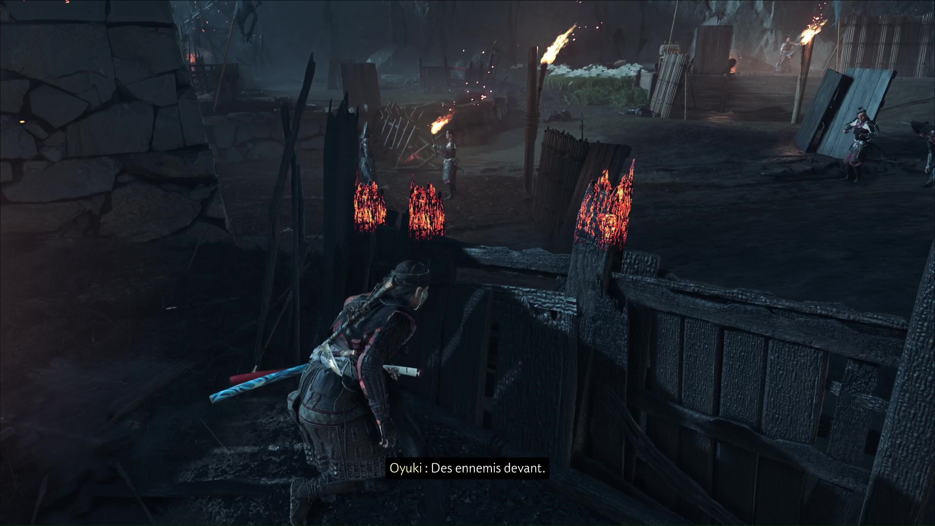 Faites quelques pas pour avoir, à votre portée, deux ennemis à éliminer simultanément, grâce à votre kusarigama et Oyuki. Longez ensuite le bout de la zaone pour arriver devant une petite ouverture, dans la barrière.