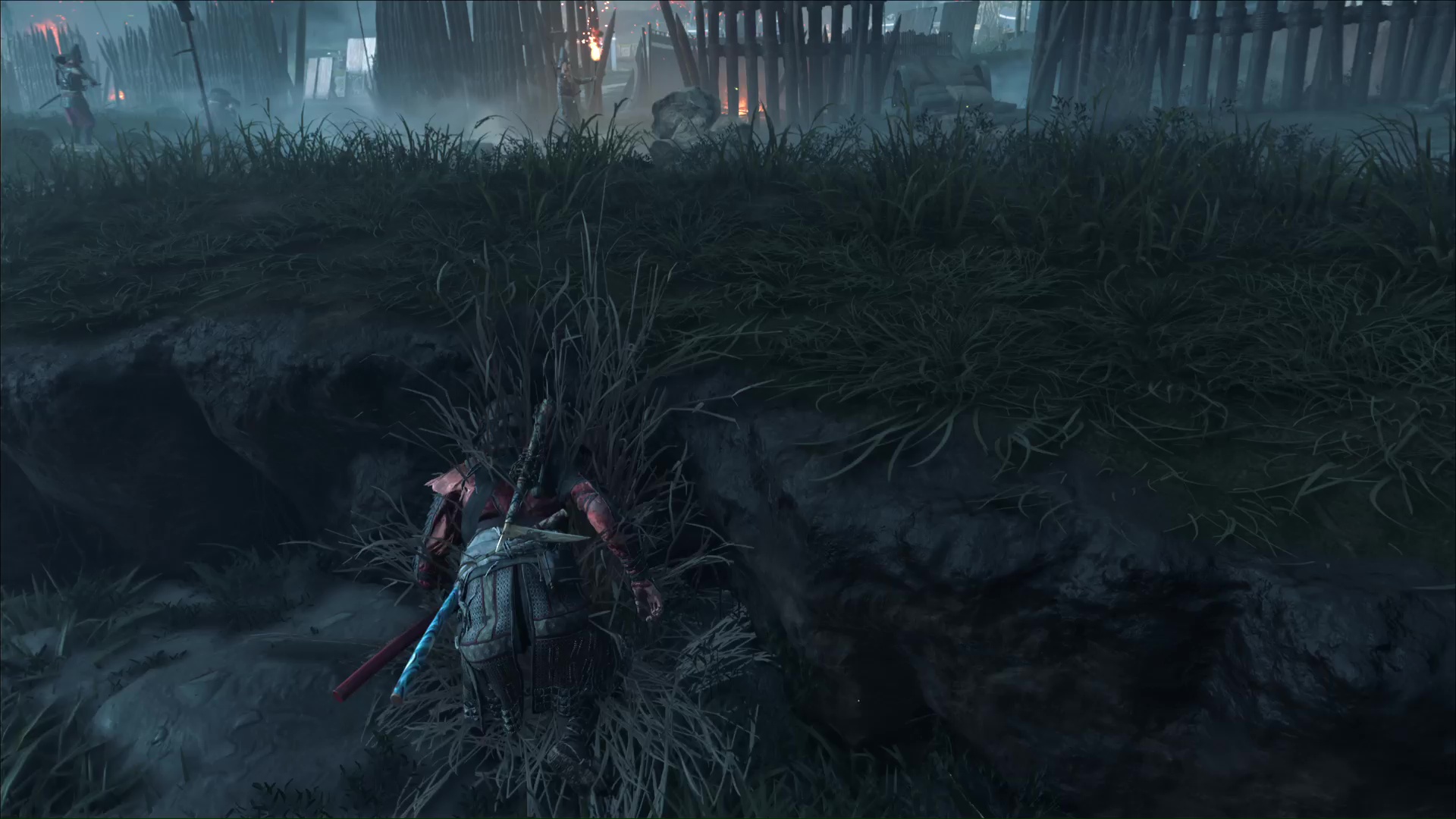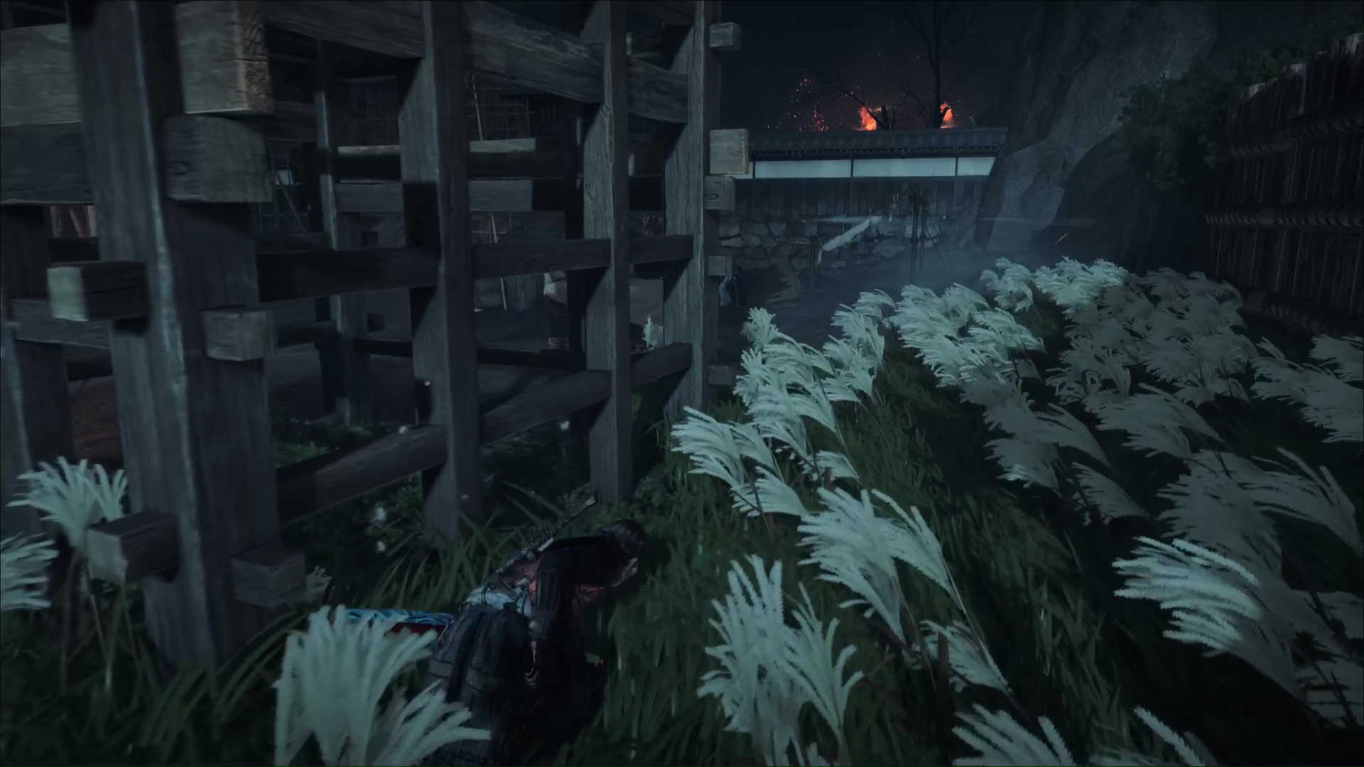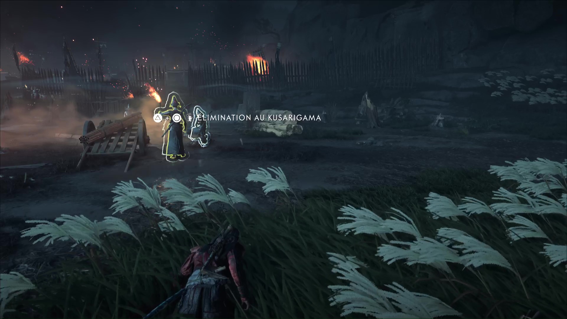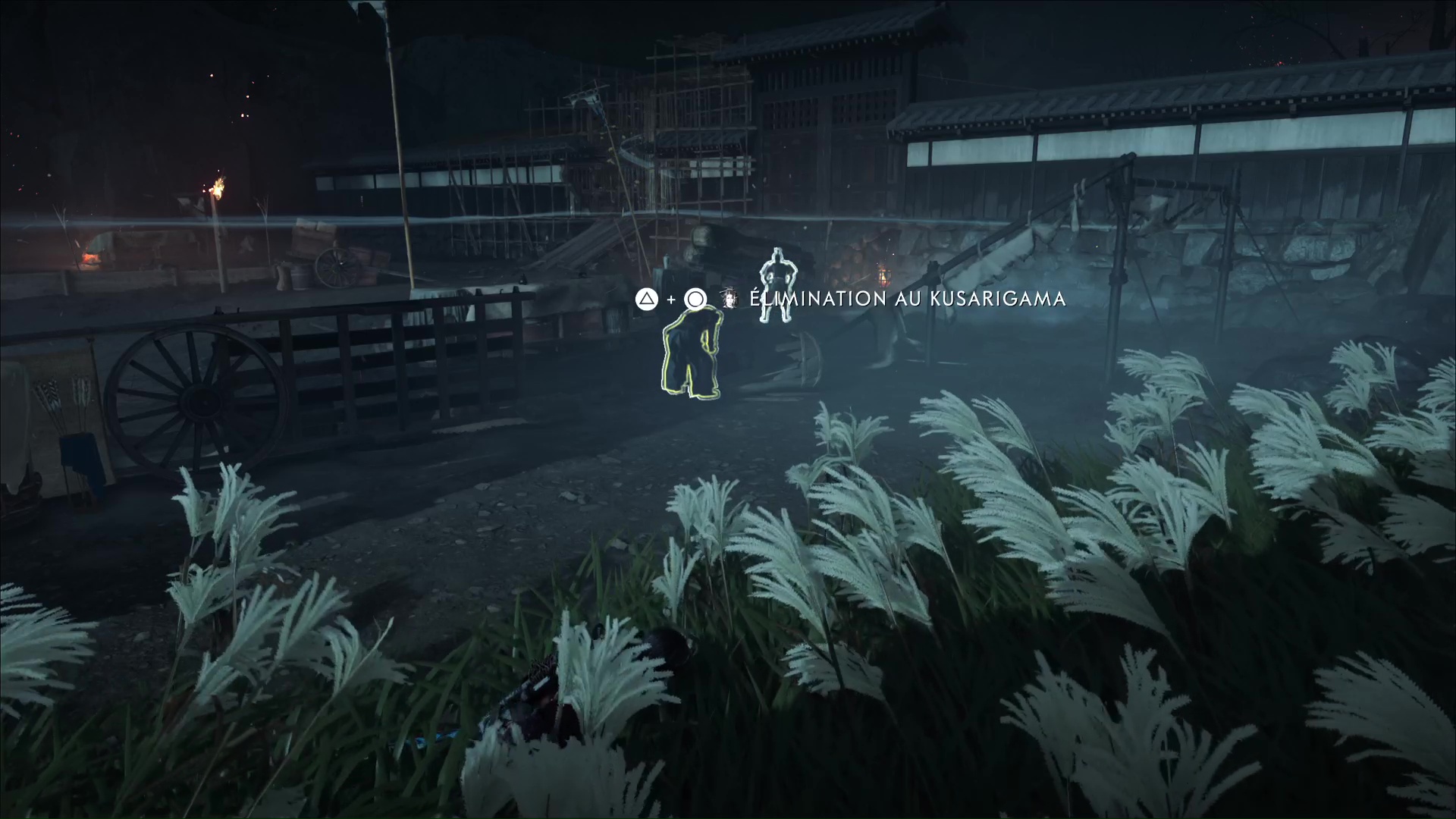 Une fois la nuit tombée, vous êtes prêt à avancer. Glissez la pente devant vous et profitez d’être caché par les hautes herbes. Notez qu’il est possible d’atteindre votre objectif sans alerter qui que ce soit. Commencez par éliminer au kusarigama, si vous l’avez, les deux soldats devant vous, grâce à l’aide d’Oyuki.