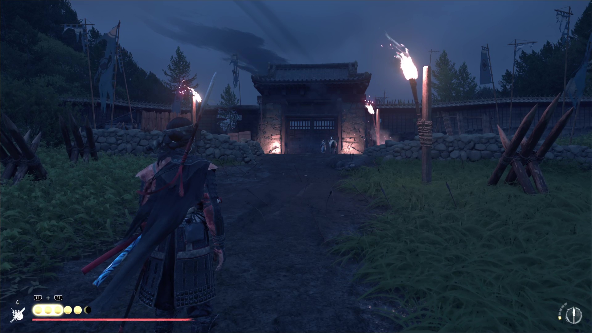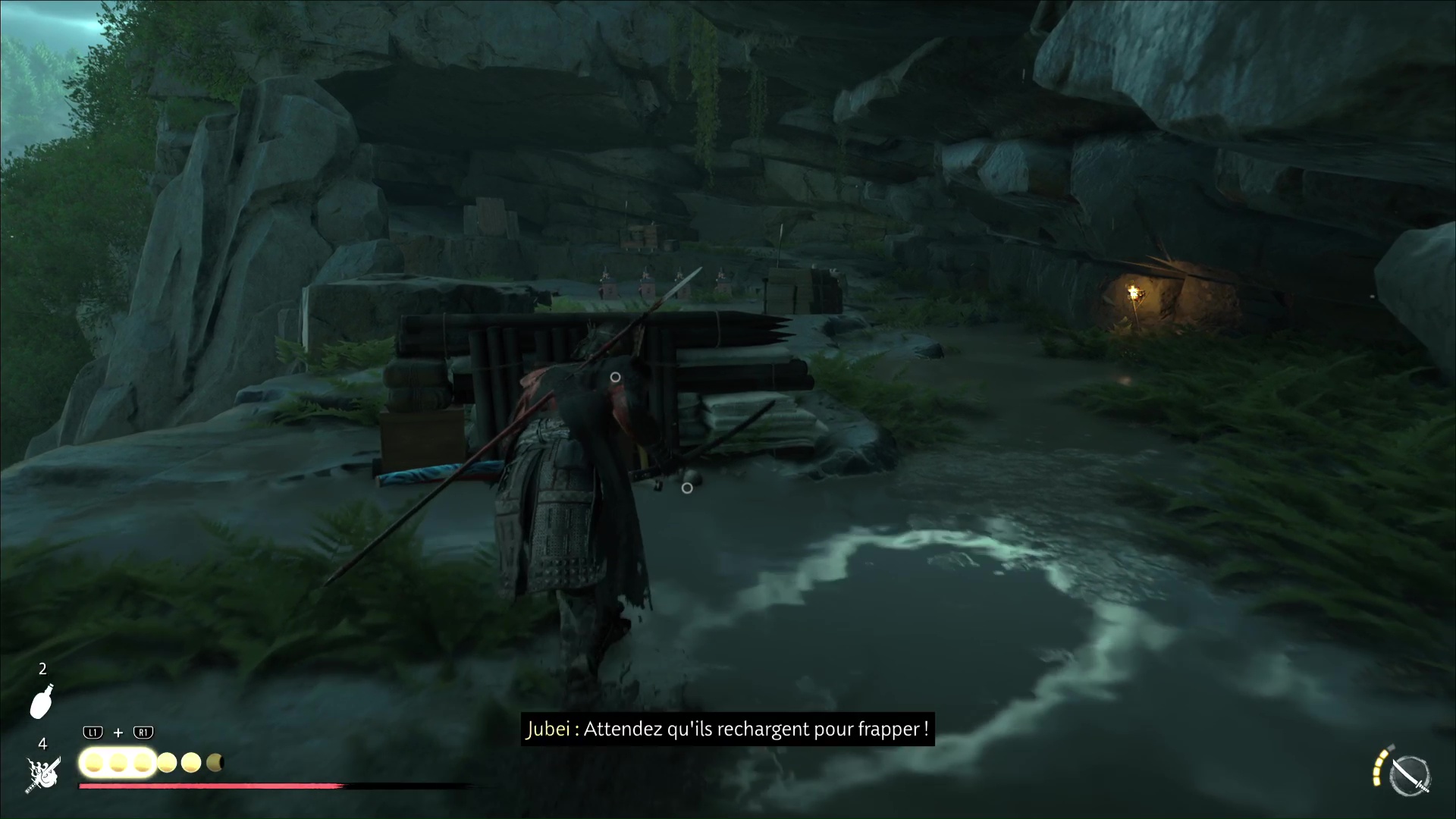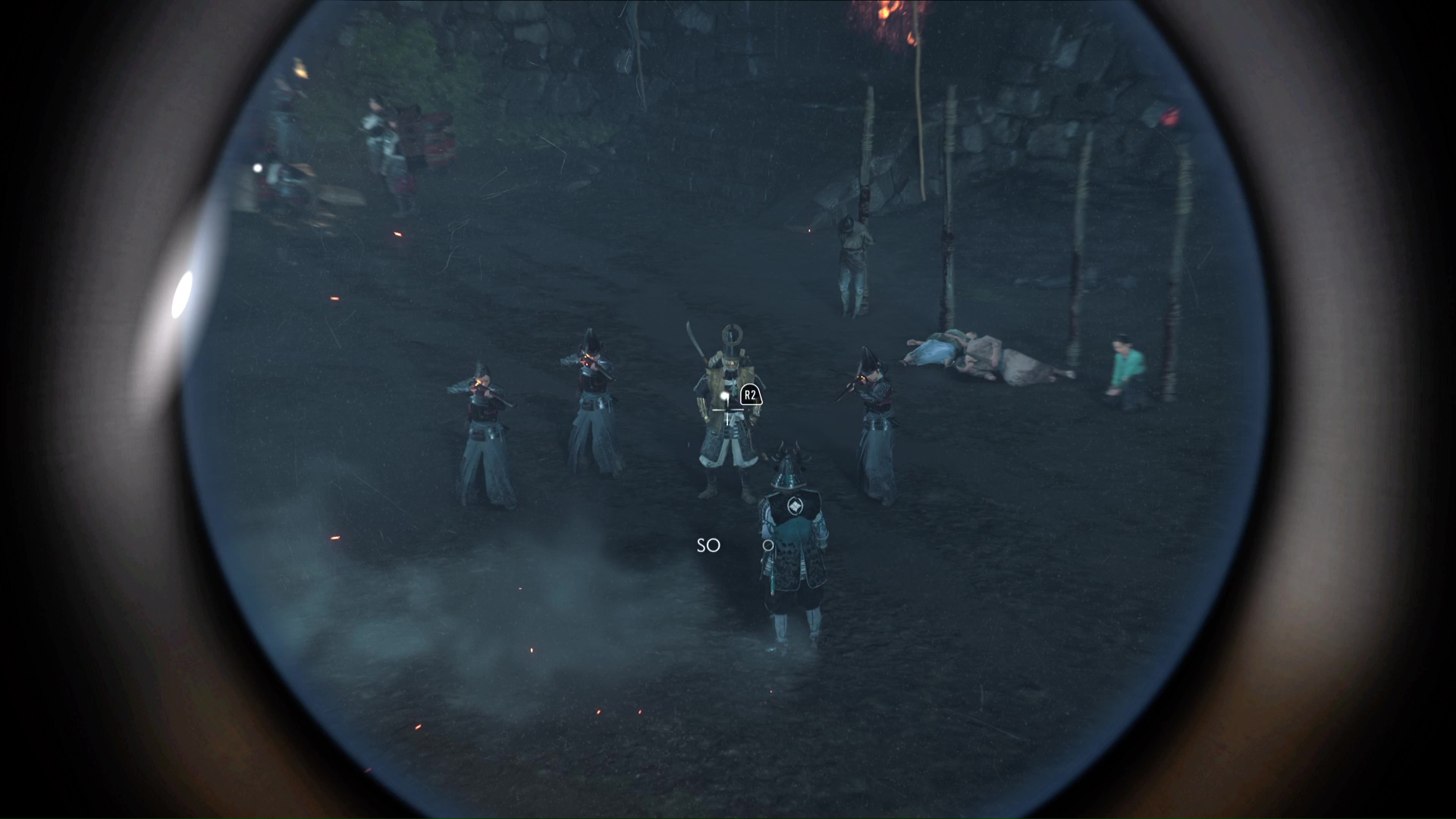 Une fois la nuit tombée, vous êtes prêt à avancer. Glissez la pente devant vous et profitez d’être caché par les hautes herbes. Notez qu’il est possible d’atteindre votre objectif sans alerter qui que ce soit. Commencez par éliminer au kusarigama, si vous l’avez, les deux soldats devant vous, grâce à l’aide d’Oyuki.