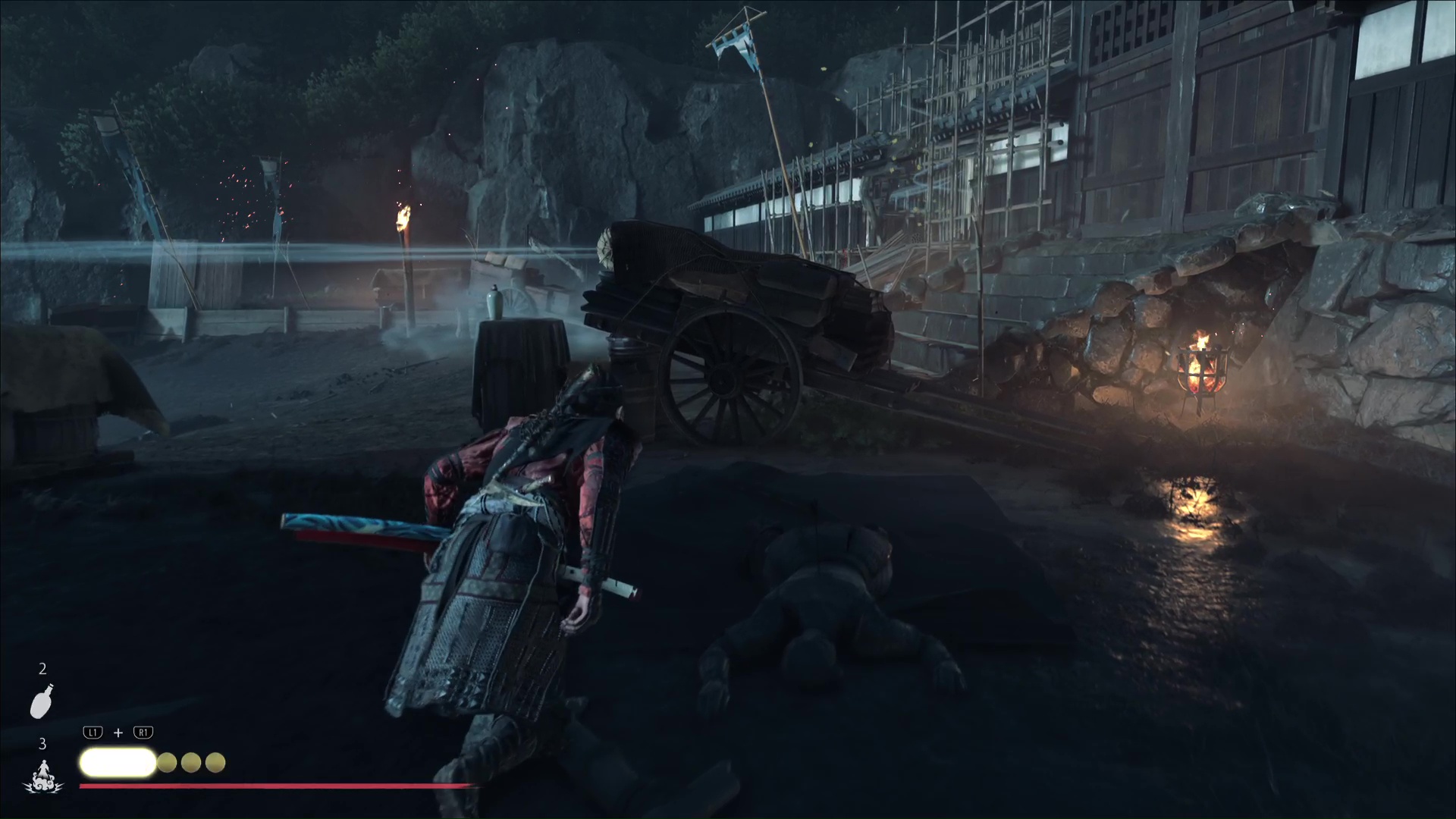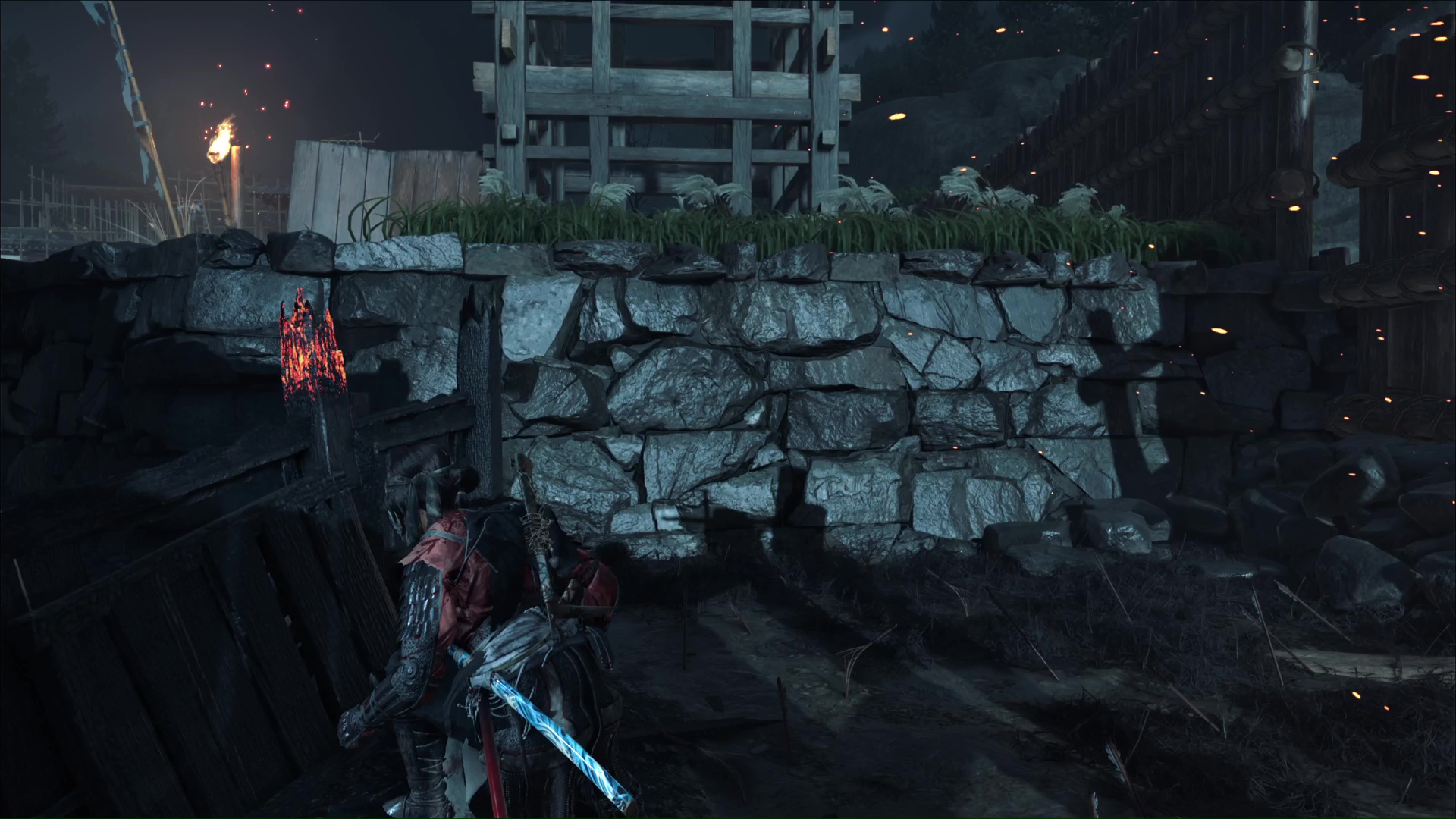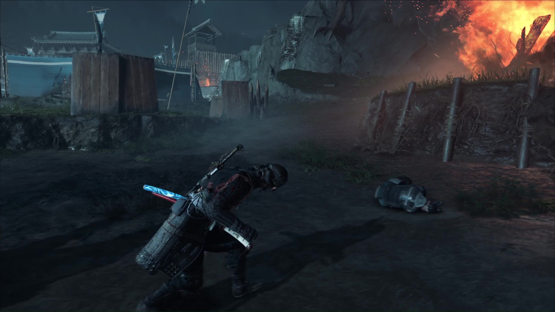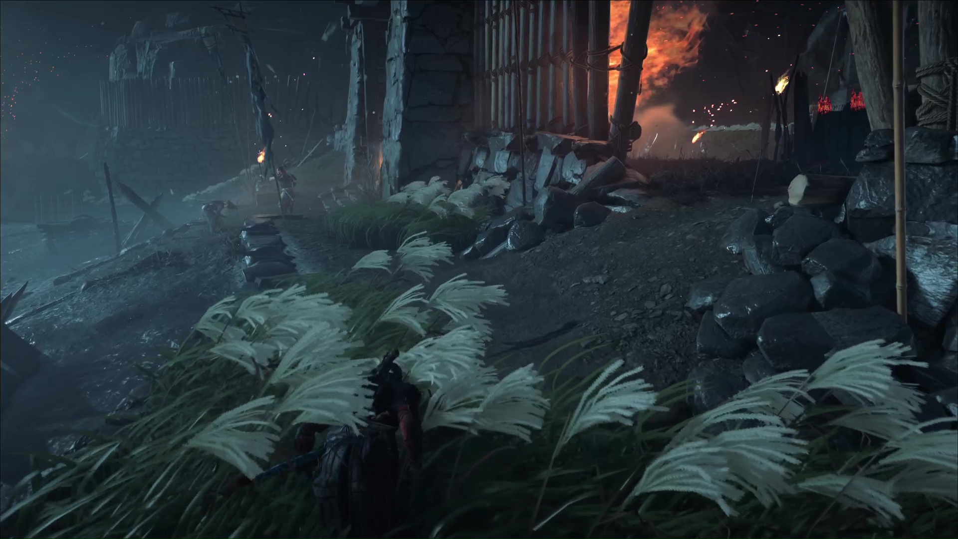 Une fois la nuit tombée, vous êtes prêt à avancer. Glissez la pente devant vous et profitez d’être caché par les hautes herbes. Notez qu’il est possible d’atteindre votre objectif sans alerter qui que ce soit. Commencez par éliminer au kusarigama, si vous l’avez, les deux soldats devant vous, grâce à l’aide d’Oyuki.