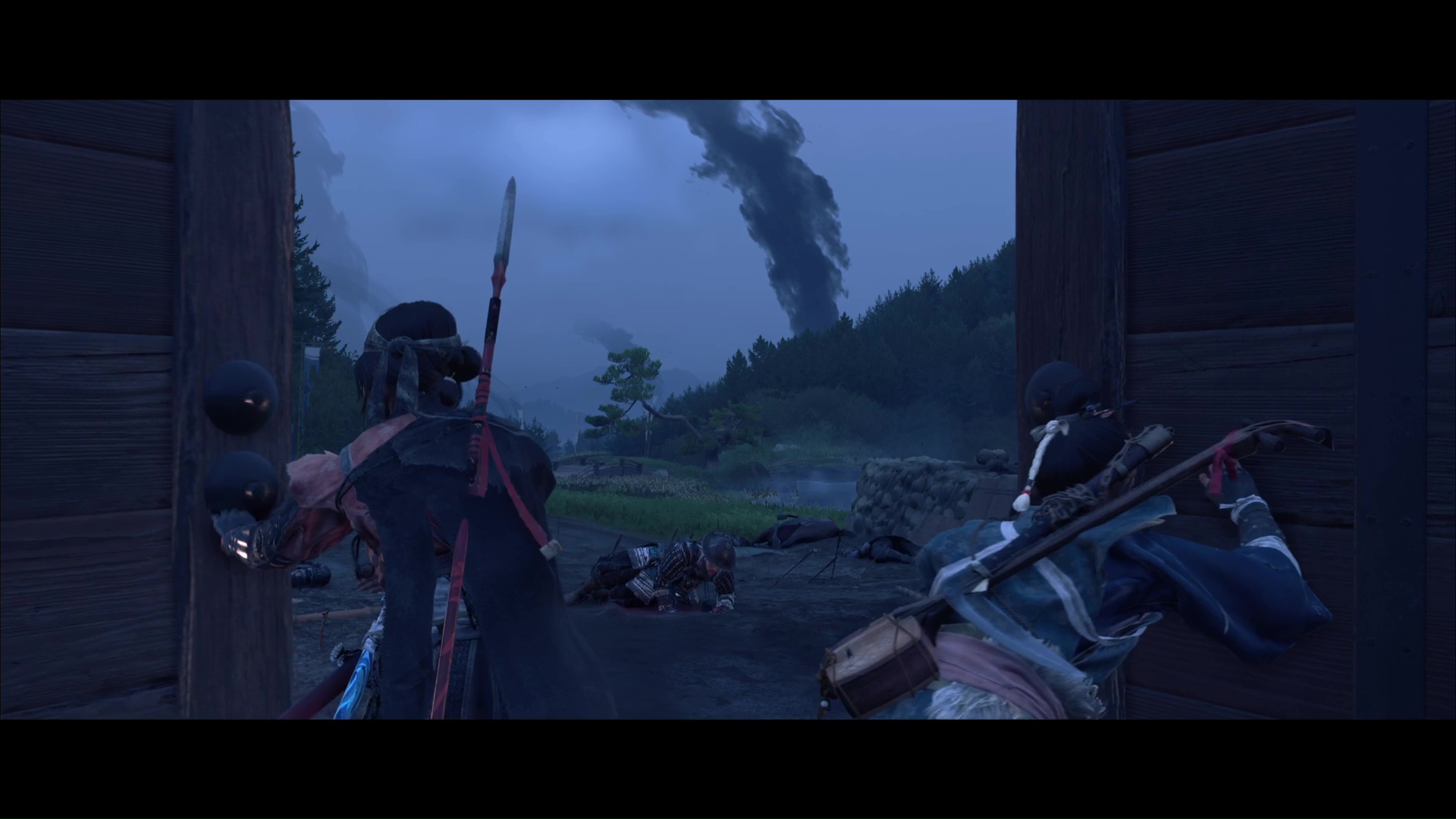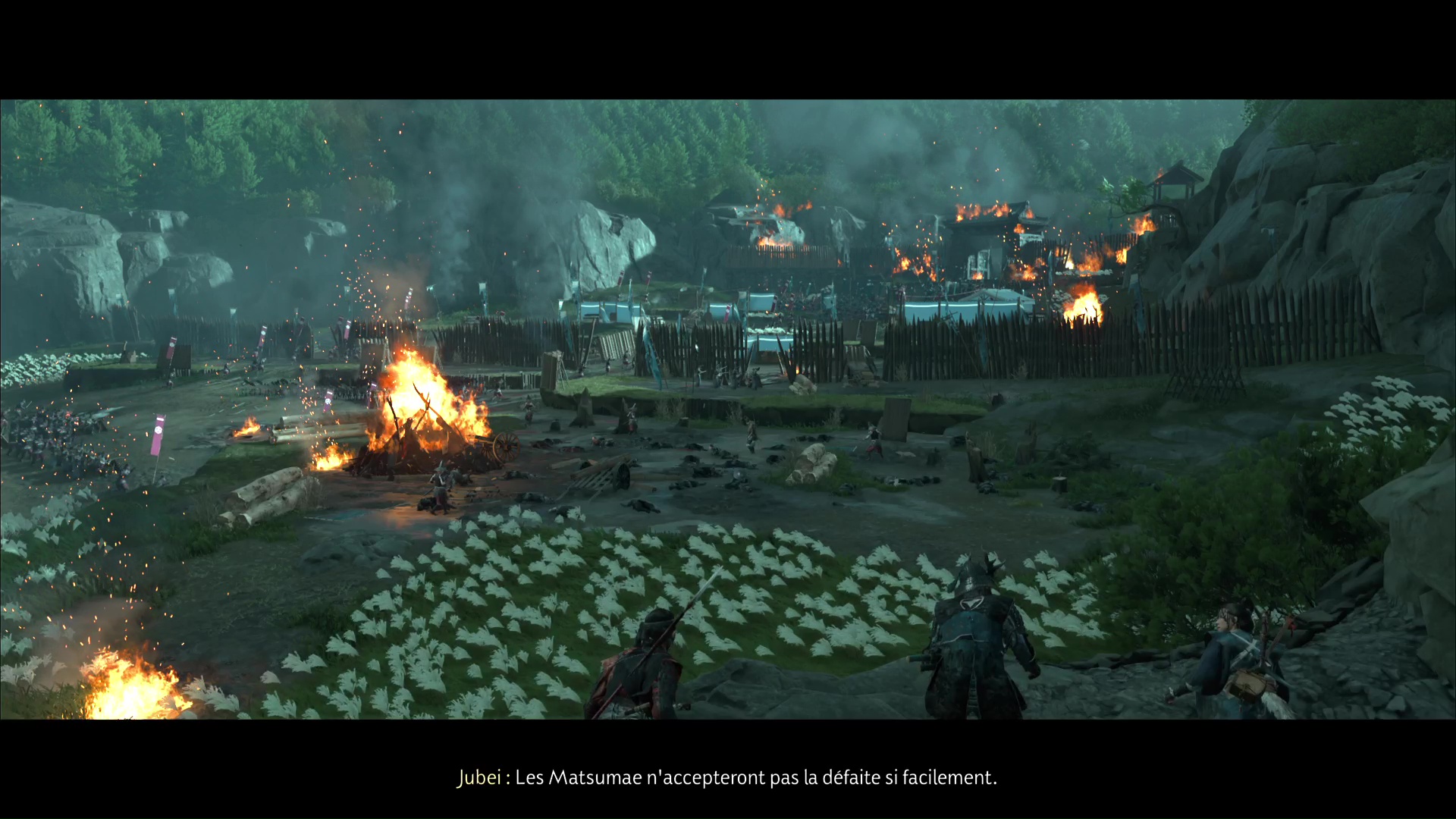 Malgré une bataille mal engagée, Jubei ne veut pas abandonner. Il demande à Atsu comment procéder. Observez le champ de bataille en regardant la porte du camp tout en haut de celui-ci, désormais franchie par les forces ennemies. Plus bas, observez ensuite les corps des Matsumae.
