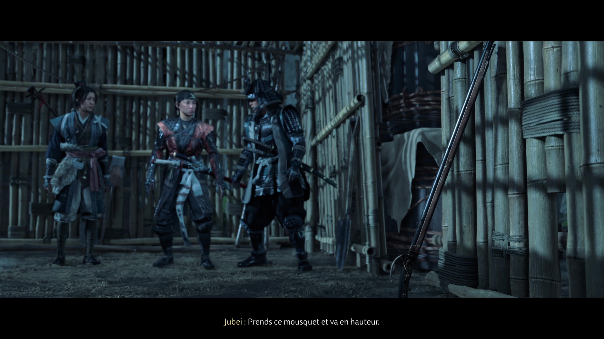 Passez à travers pour déclencher une cinématique. Les soldats de Saito sont prêts à exécuter des civils. Jubei ne peut pas laisser faire ça, et demande à Atsu de prendre un mousquet et de le couvrir. Vous obtenez alors le tanegashima.