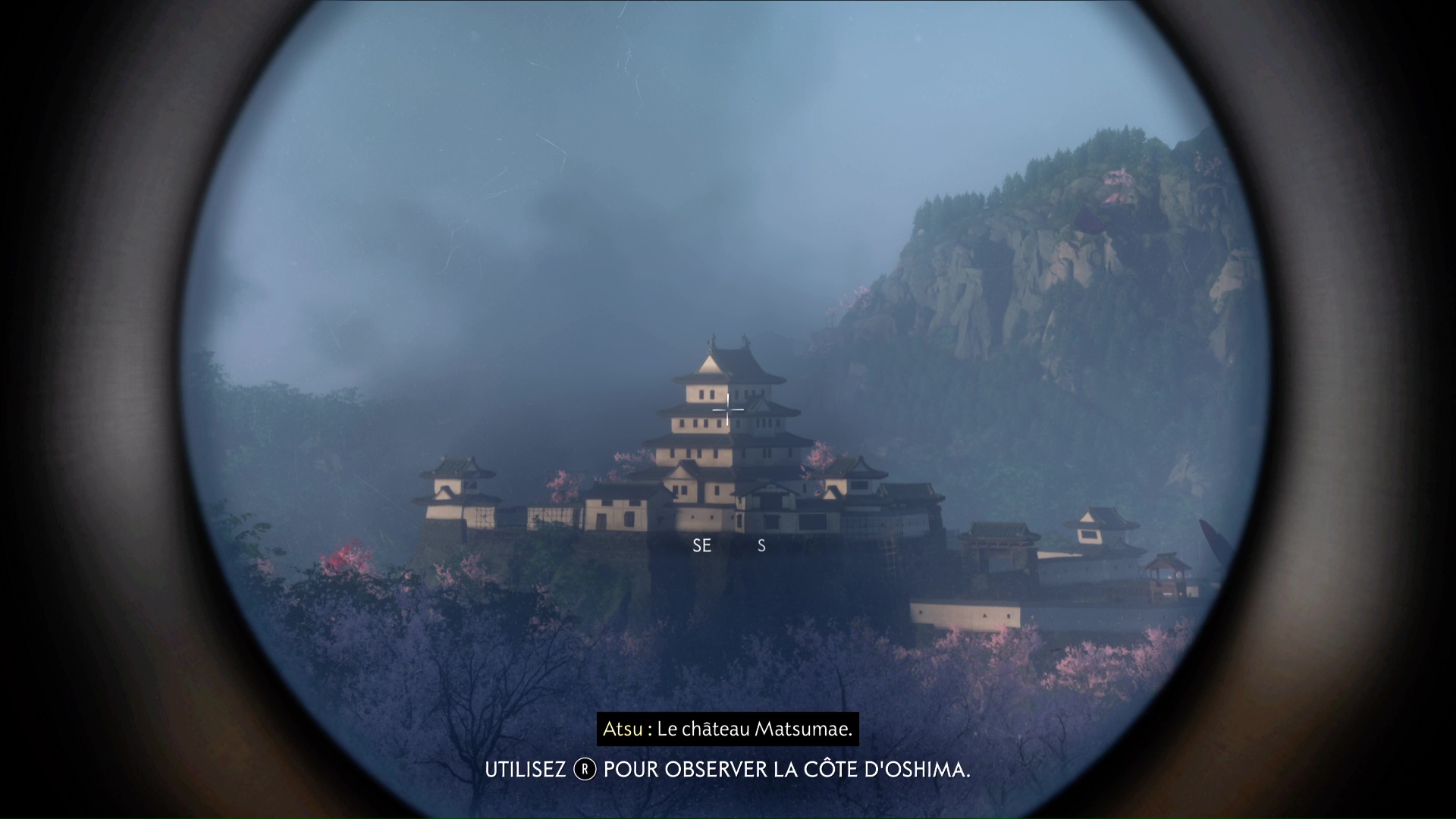 Sortez la longue-vue et observez vers le sud pour localiser le port de Benten. Tournez légèrement vers la gauche pour voir le château Matsumae.