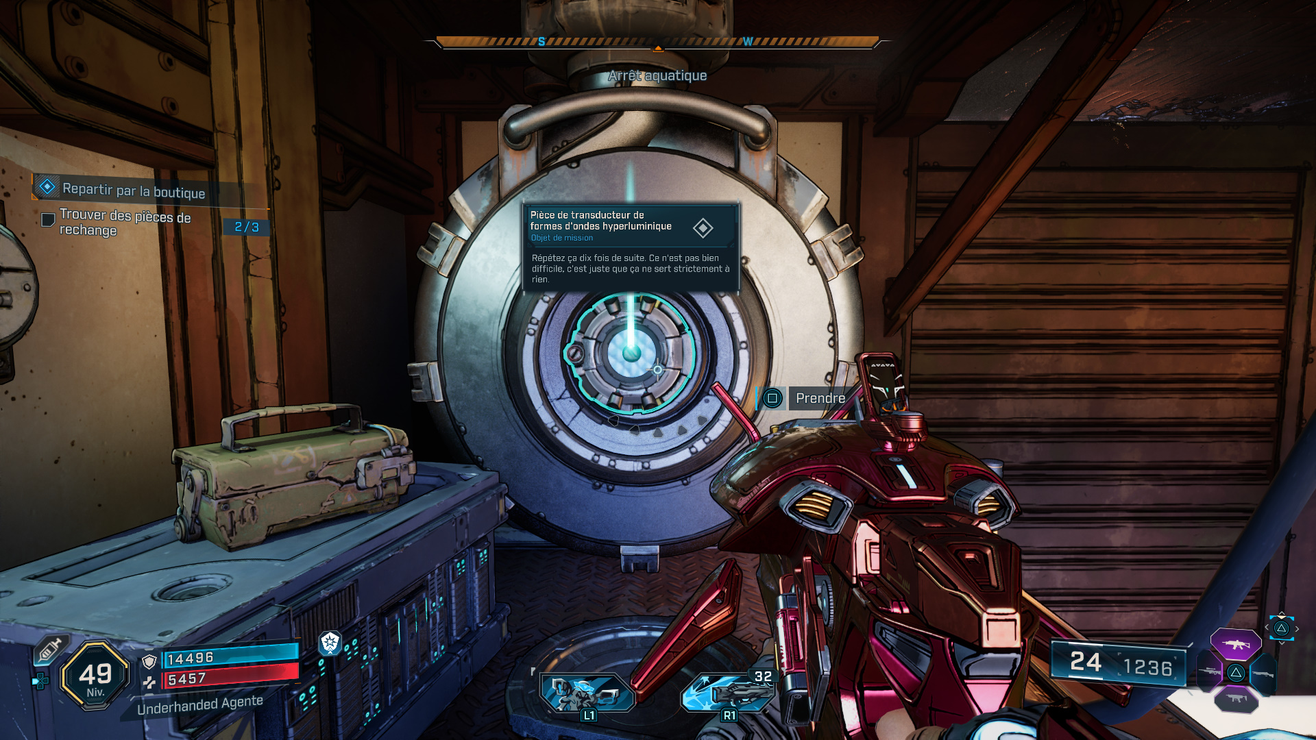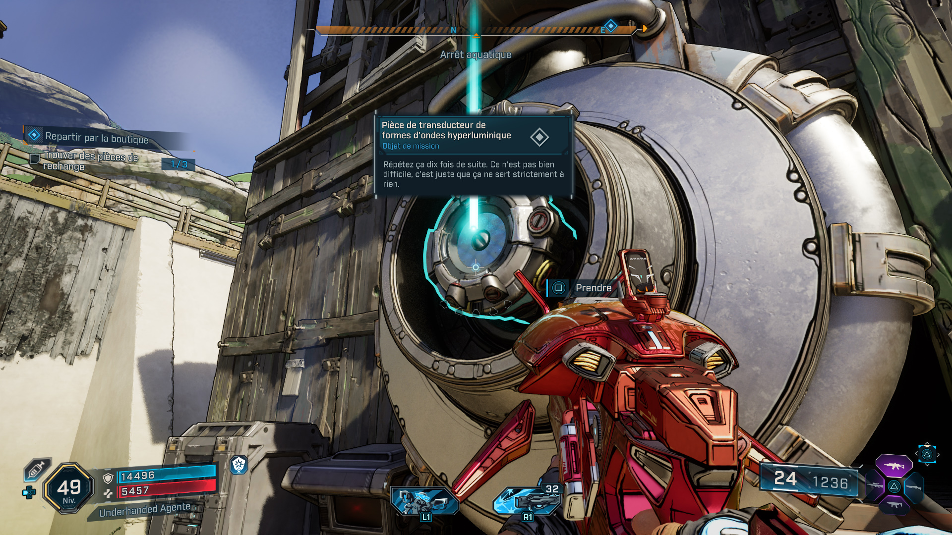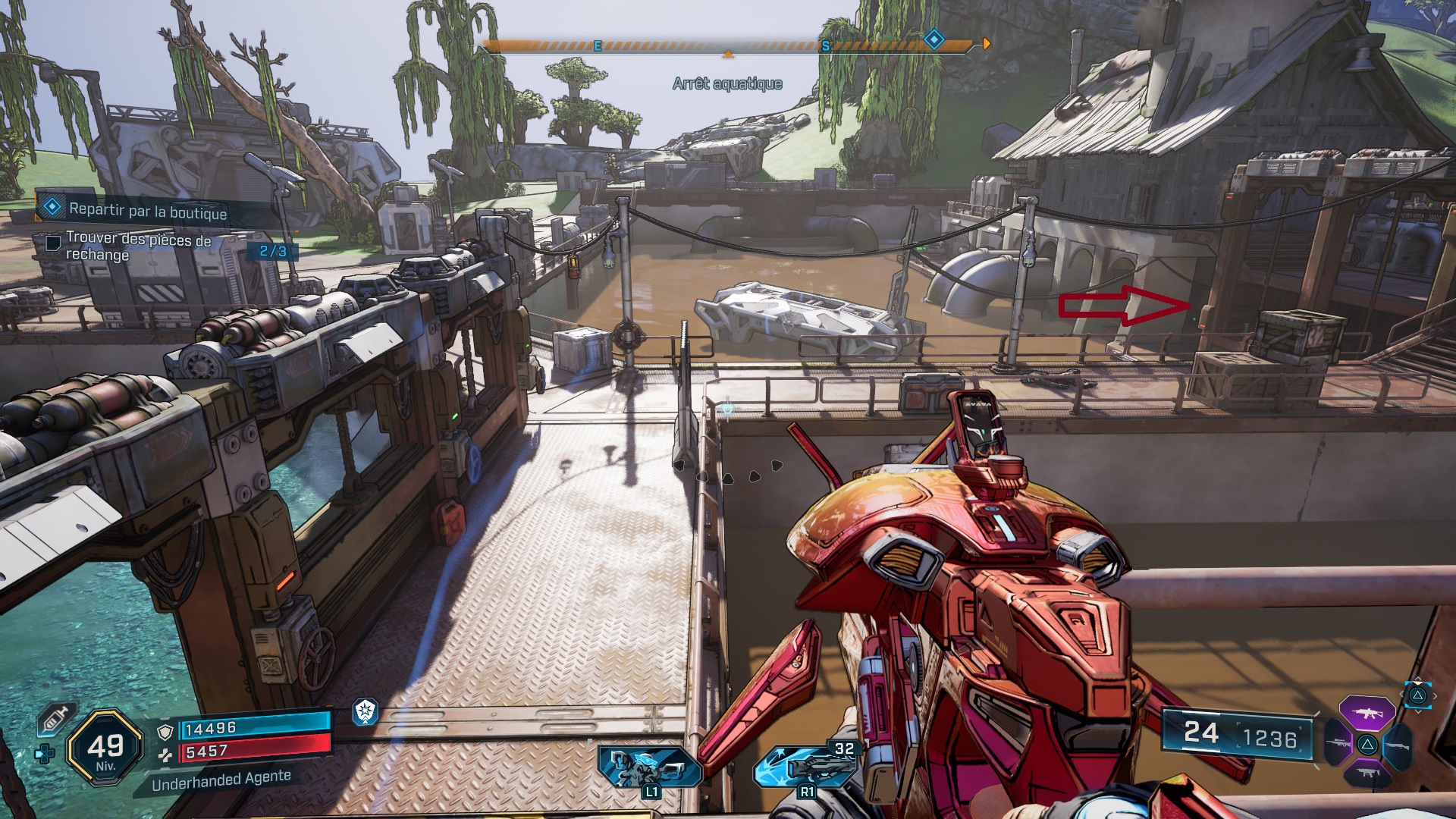 Tout d’abord, repérez la cuve à droite en entrant dans la zone d’objectif, frappez le couvercle pour le faire tomber et récupérez la première Pièce de Transducteur de Formes d’Ondes Hyperluminique.