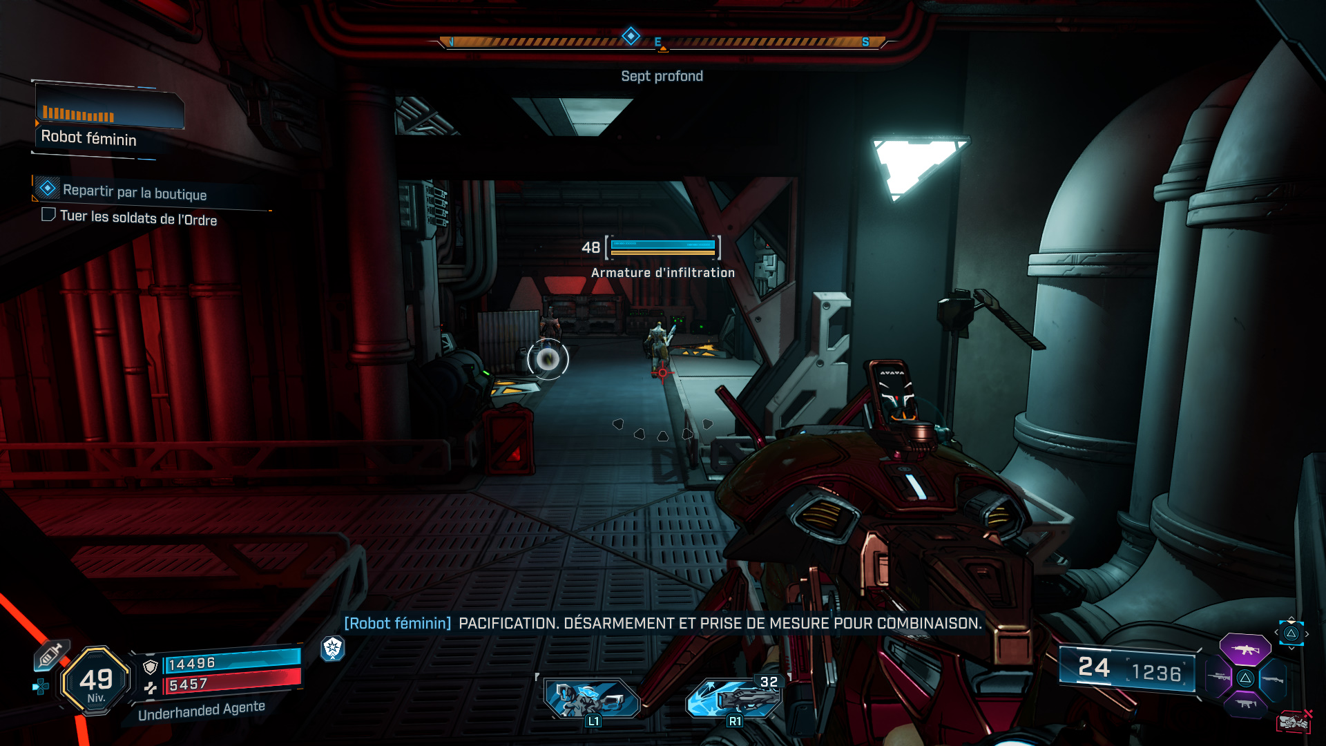 Prenez la bonbonne et retournez au début de la zone par la porte à proximité (verrouillée en apparence mais approchez-vous pour qu’elle s’ouvre) pour la lancer dans la faille. Sortez alors du labo par cette même faille pour faire face à une nouvelle vague de soldats de l’Ordre devant le complexe. Juste avant d’aller confronter Francis Lechelou qui se trouve près de sa machine, ce qui vous donne le choix de tirer sur lui ou de le frapper pour terminer la mission. Notez tout de même que la deuxième option vous permet d’obtenir le succès/trophée « Faille incompatible » pour lui avoir offert un lieu de repos éternel.
