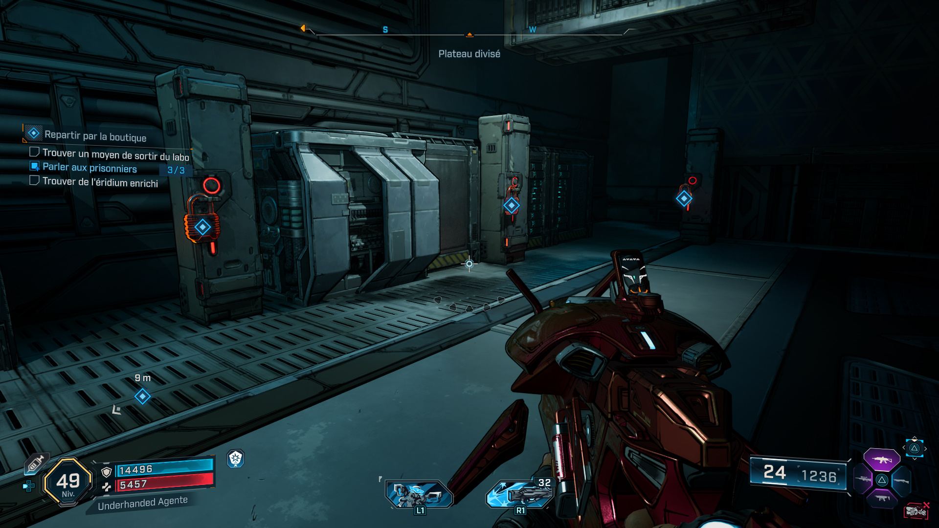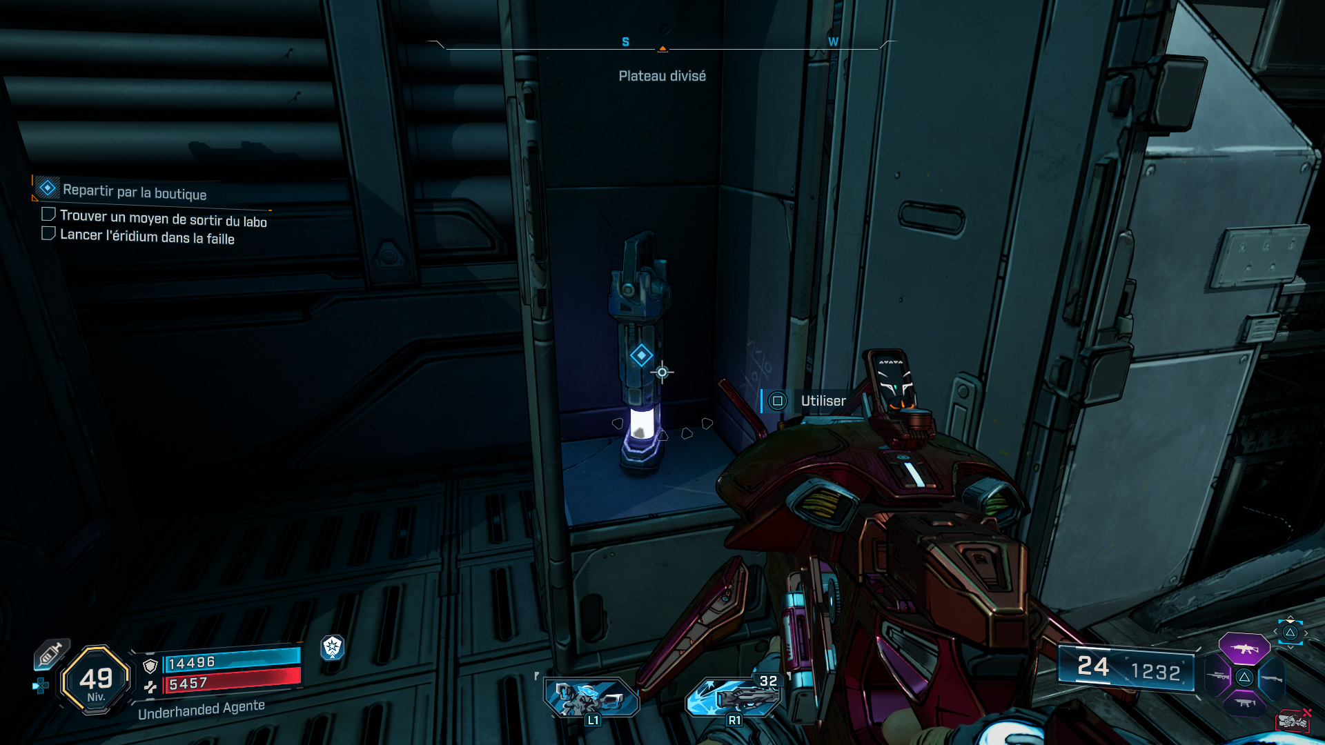 Il s’agit désormais de trouver un moyen de sortir du labo, pour cela, regardez sur un pan du mur opposé aux cellules pour apercevoir un conduit d’aération, et arrachez la grille avec votre grappin. Au bout du conduit, laissez-vous tomber en contrebas pour atterrir dans la réserve (et tomber nez à nez avec un dernier enregistrement ECHO). Là, retournez-vous et tirez sur les verrous de chacun des casiers, l’un d’eux renfermant de l’éridium enrichi.