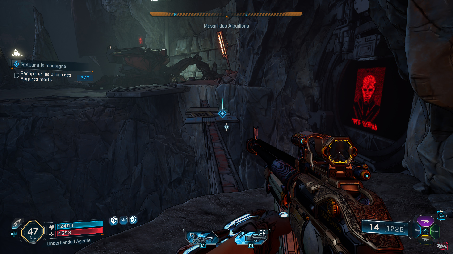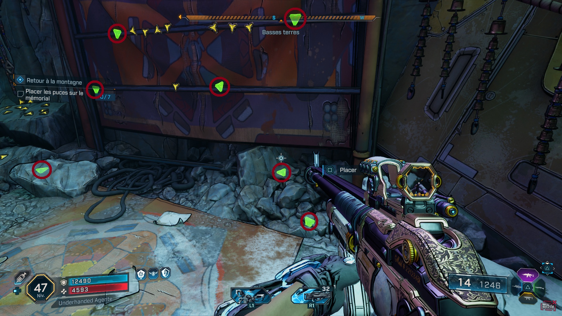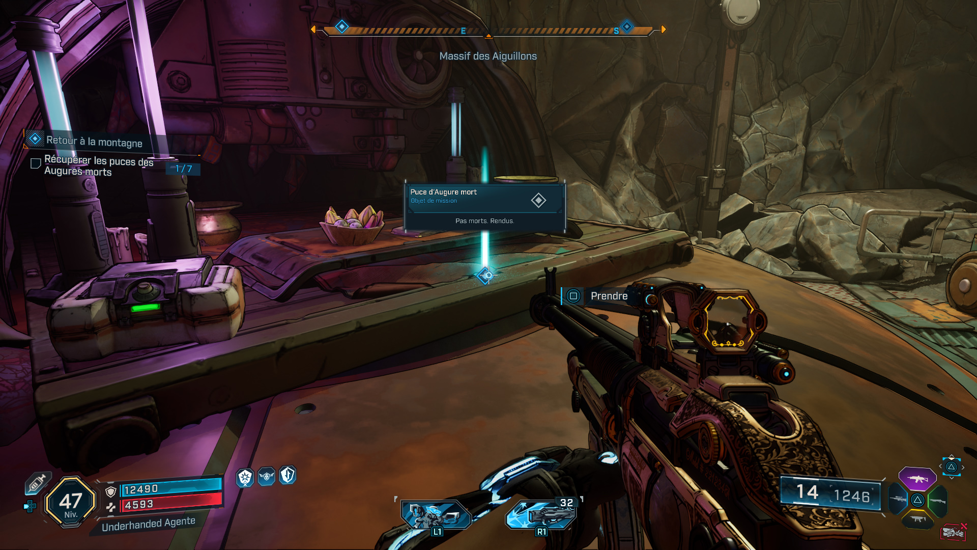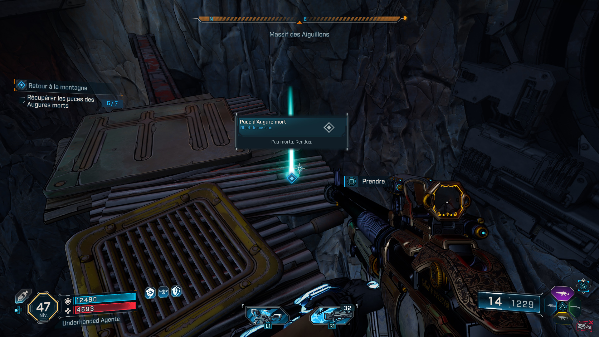 Après avoir parlé avec Calder, rendez-vous au sud-est, dans l’Enclave au Massif des Aiguillons, et fouillez les Mines Ardentes pour retrouver les 7 puces des Augures morts. A partir de là, laissez-vous simplement guider par votre boussole, en plus de l’ECHO-localisation, pour les récupérer les unes après les autres, tout en prenant soin de vous débarrasser des ennemis de l’Ordre qui grouillent dans les parages.