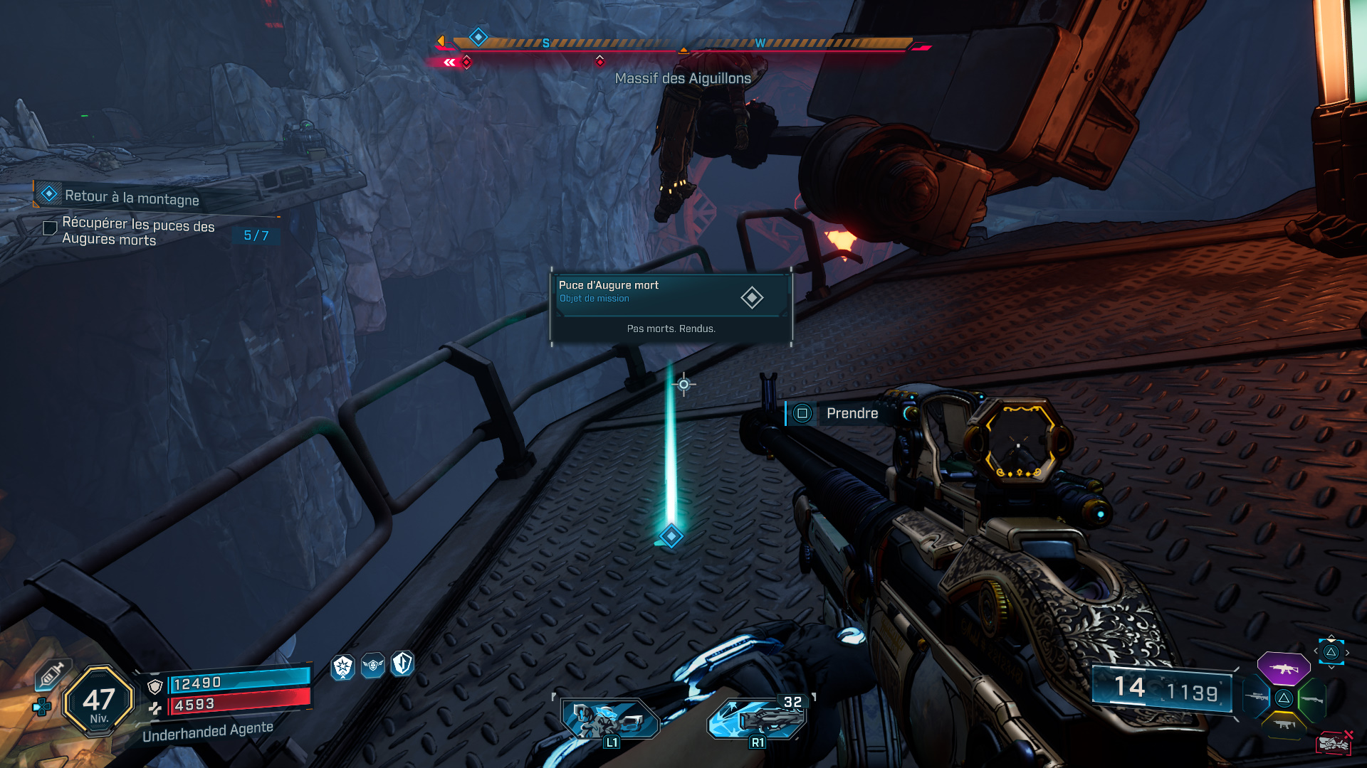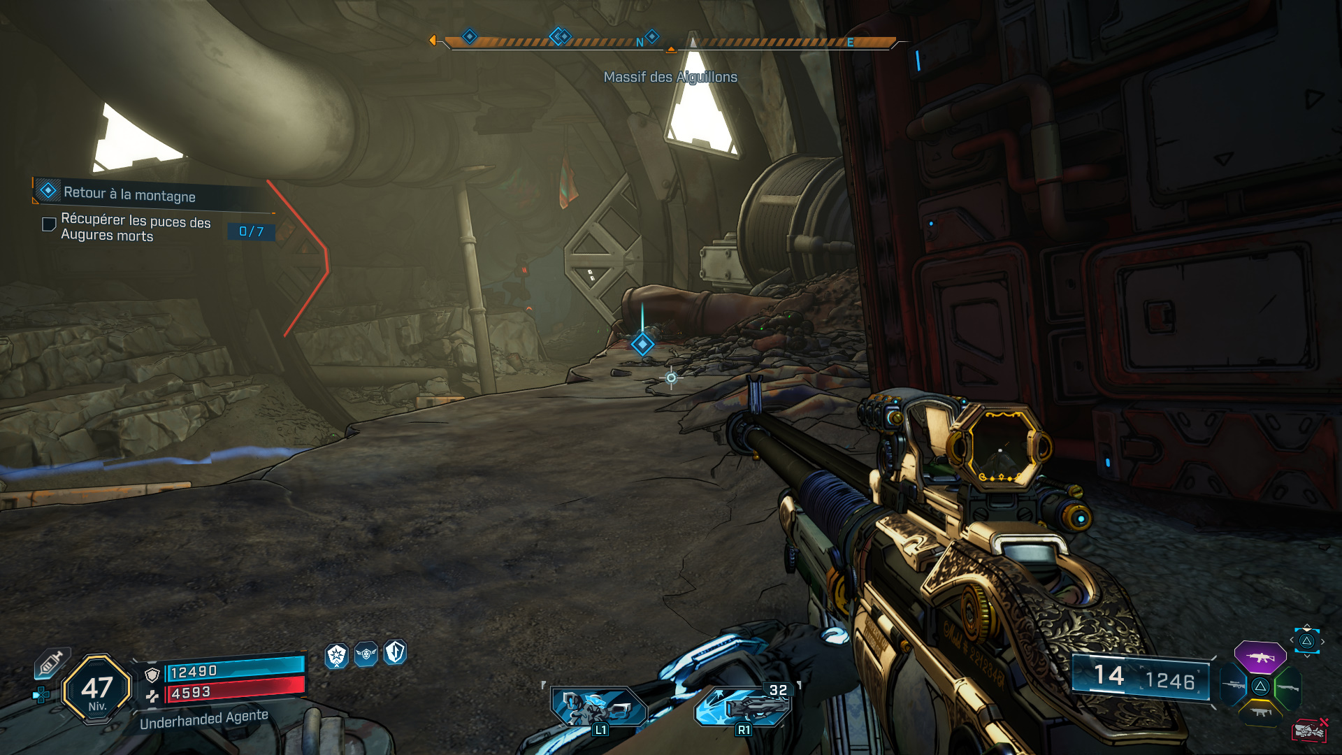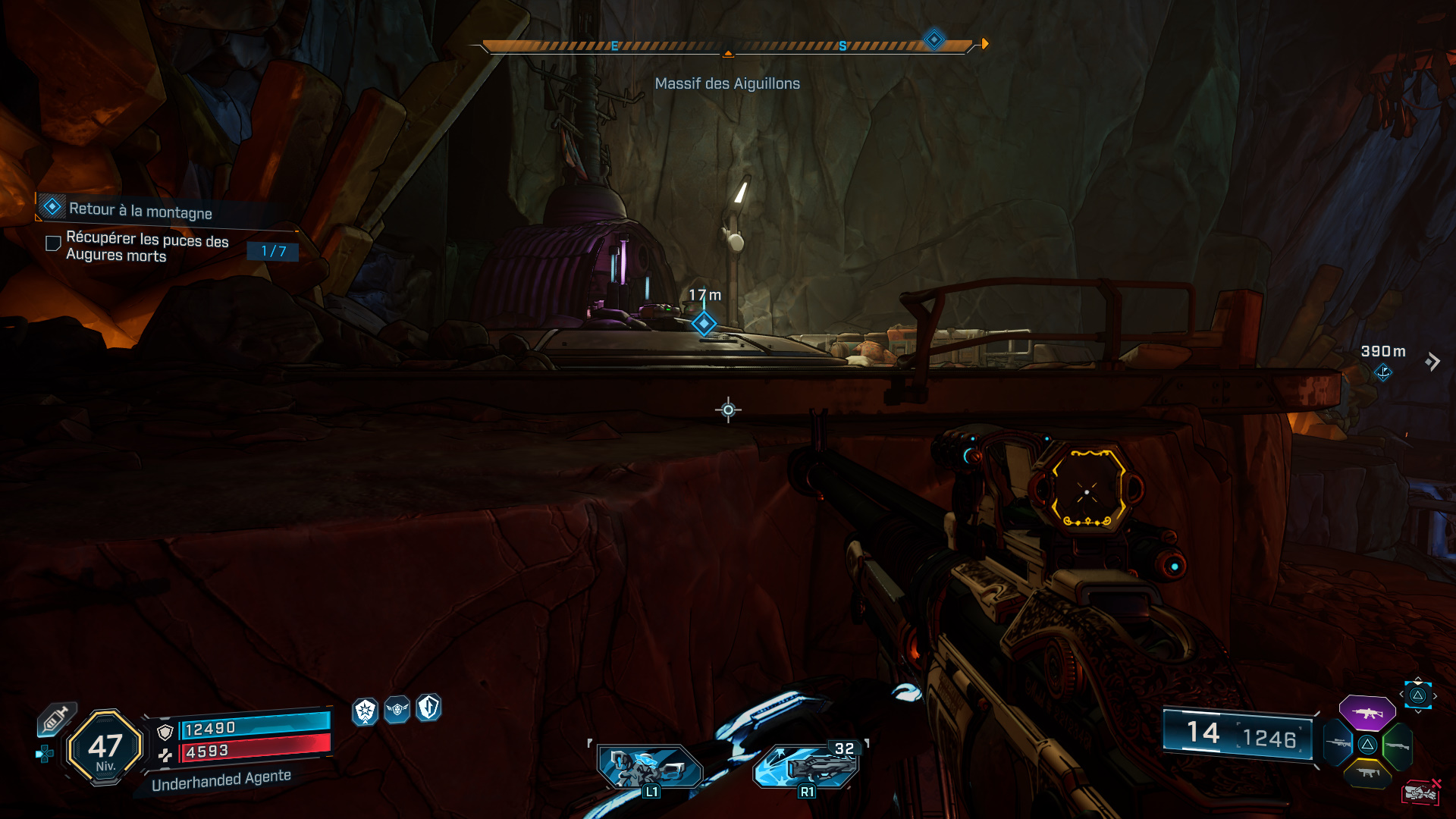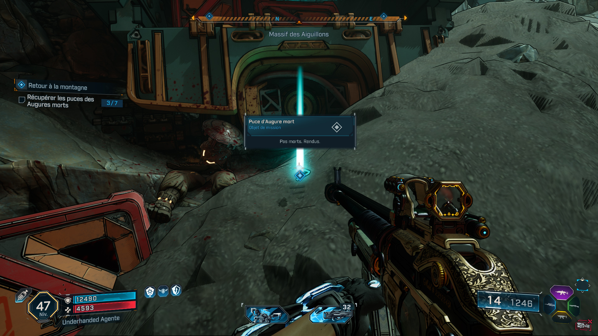Après avoir parlé avec Calder, rendez-vous au sud-est, dans l’Enclave au Massif des Aiguillons, et fouillez les Mines Ardentes pour retrouver les 7 puces des Augures morts. A partir de là, laissez-vous simplement guider par votre boussole, en plus de l’ECHO-localisation, pour les récupérer les unes après les autres, tout en prenant soin de vous débarrasser des ennemis de l’Ordre qui grouillent dans les parages.