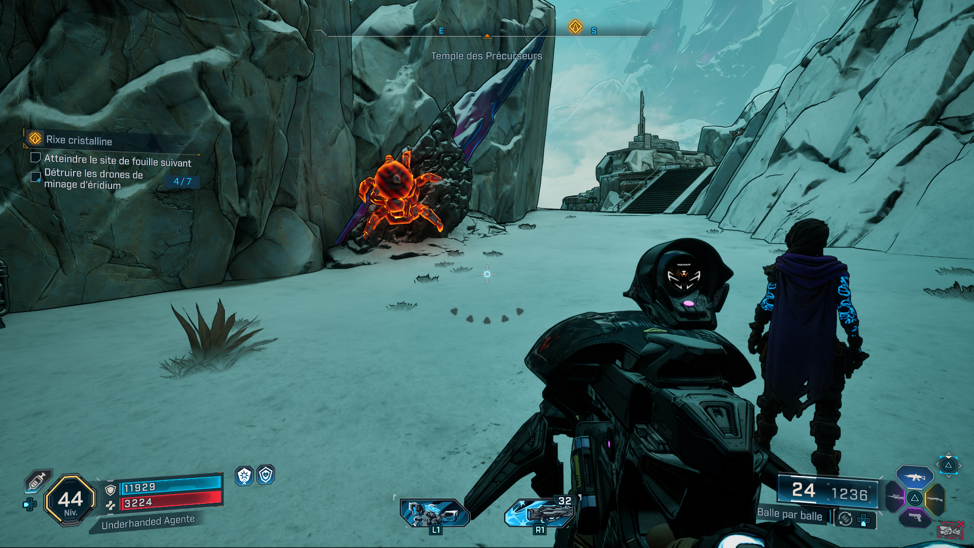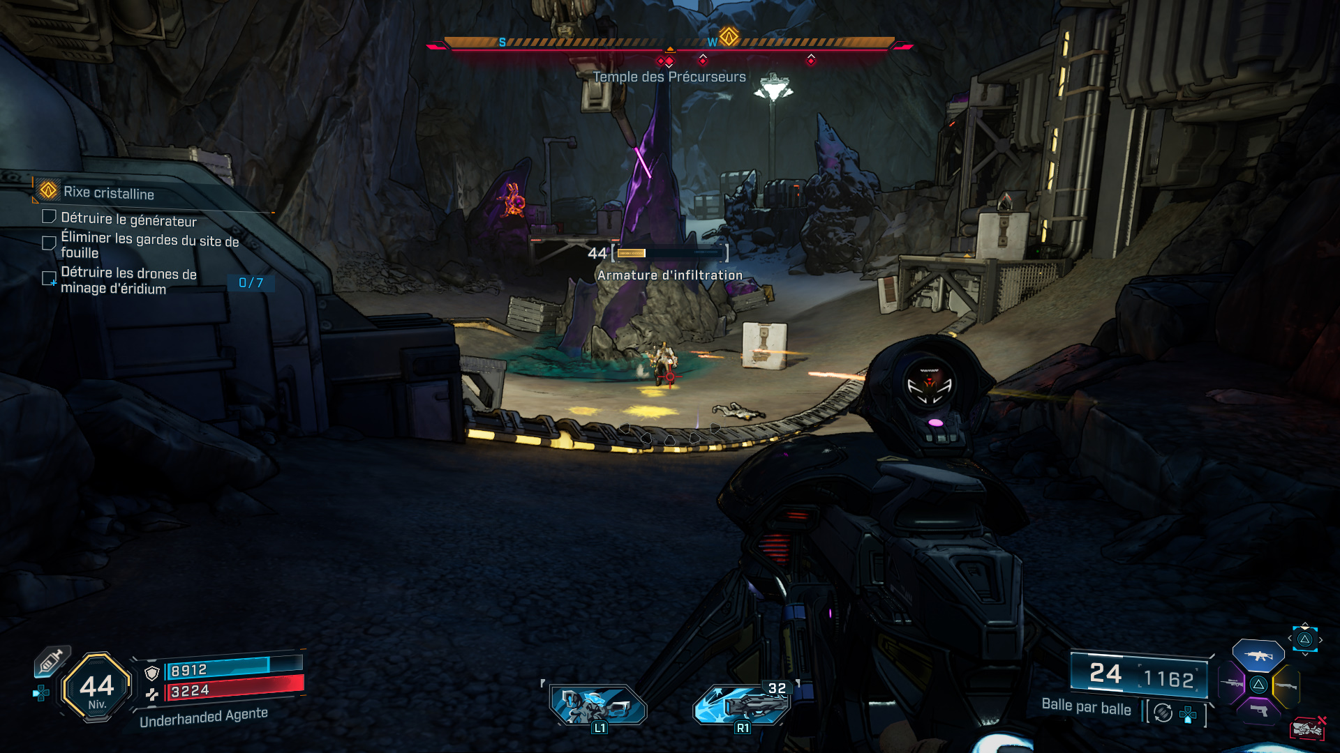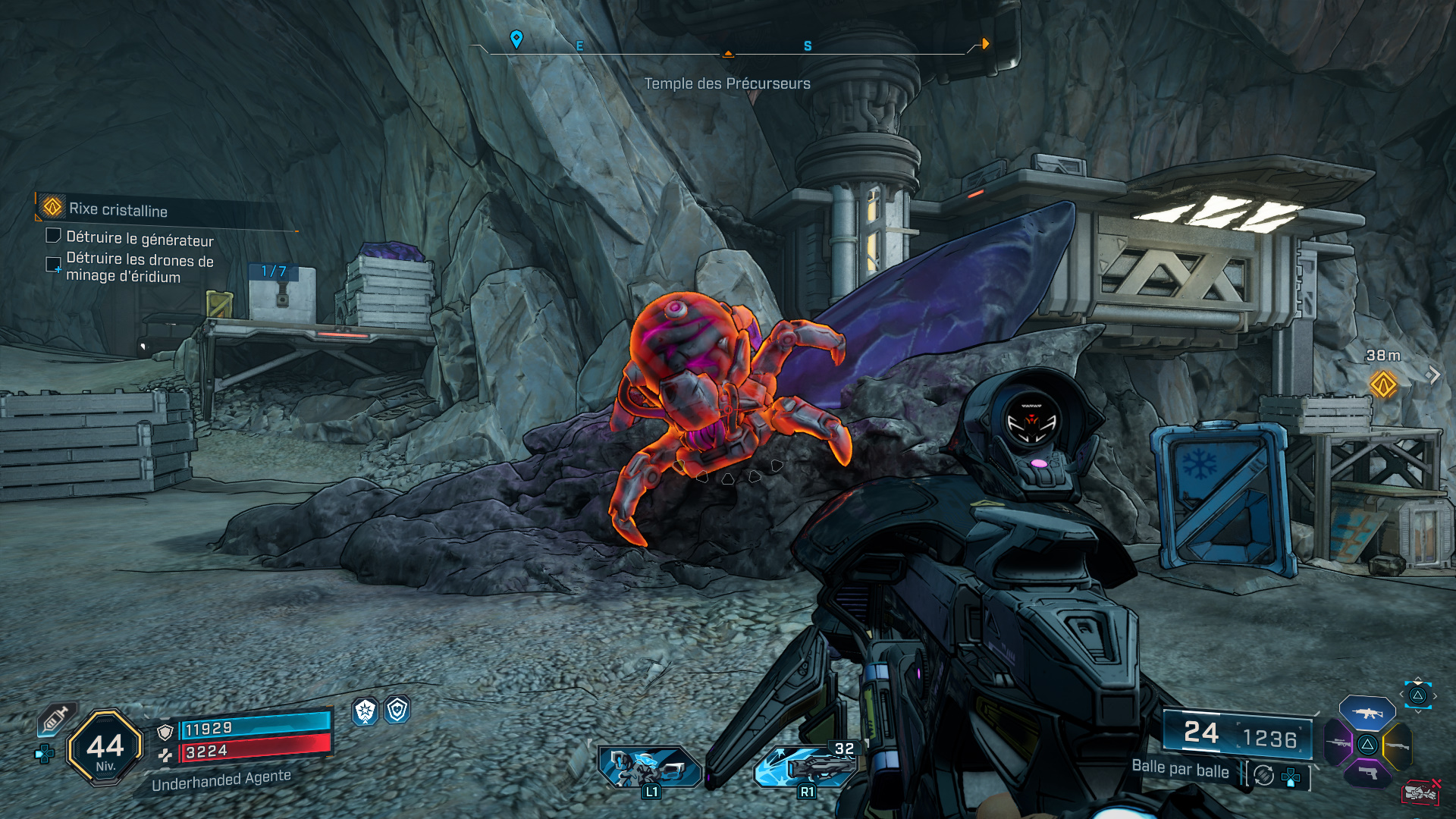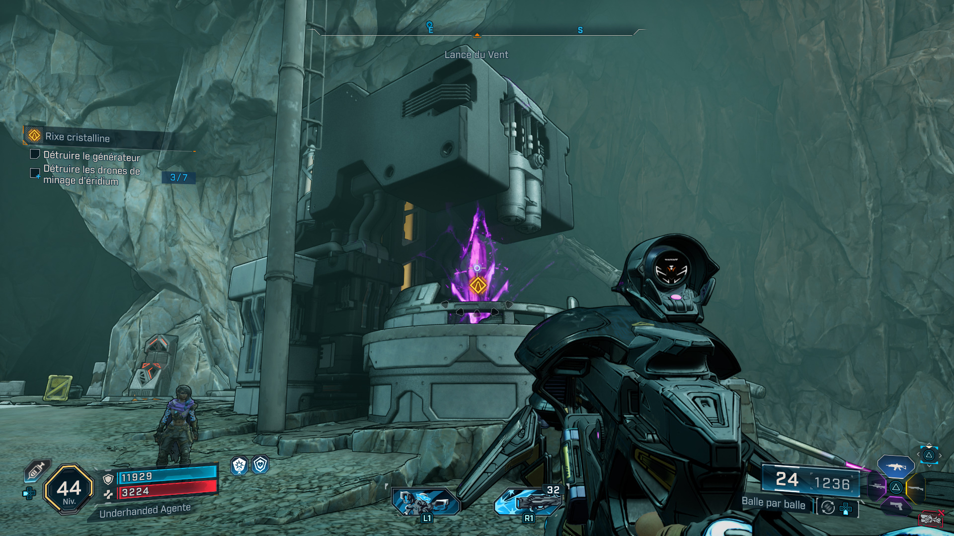 Continuez ensuite d’avancer en compagnie d’Amara et attendez qu’elle ouvre un passage vers le site de fouille, là où d’autres gardes vous attendent. Après avoir nettoyé la zone, prenez le temps de détruire 3 premiers drones de minage d’éridium dans les parages (vous ne devriez pas avoir de mal à les trouver) si vous souhaitez vous occuper de l’objectif optionnel, puis détruisez le générateur en tirant sur le noyau violet.