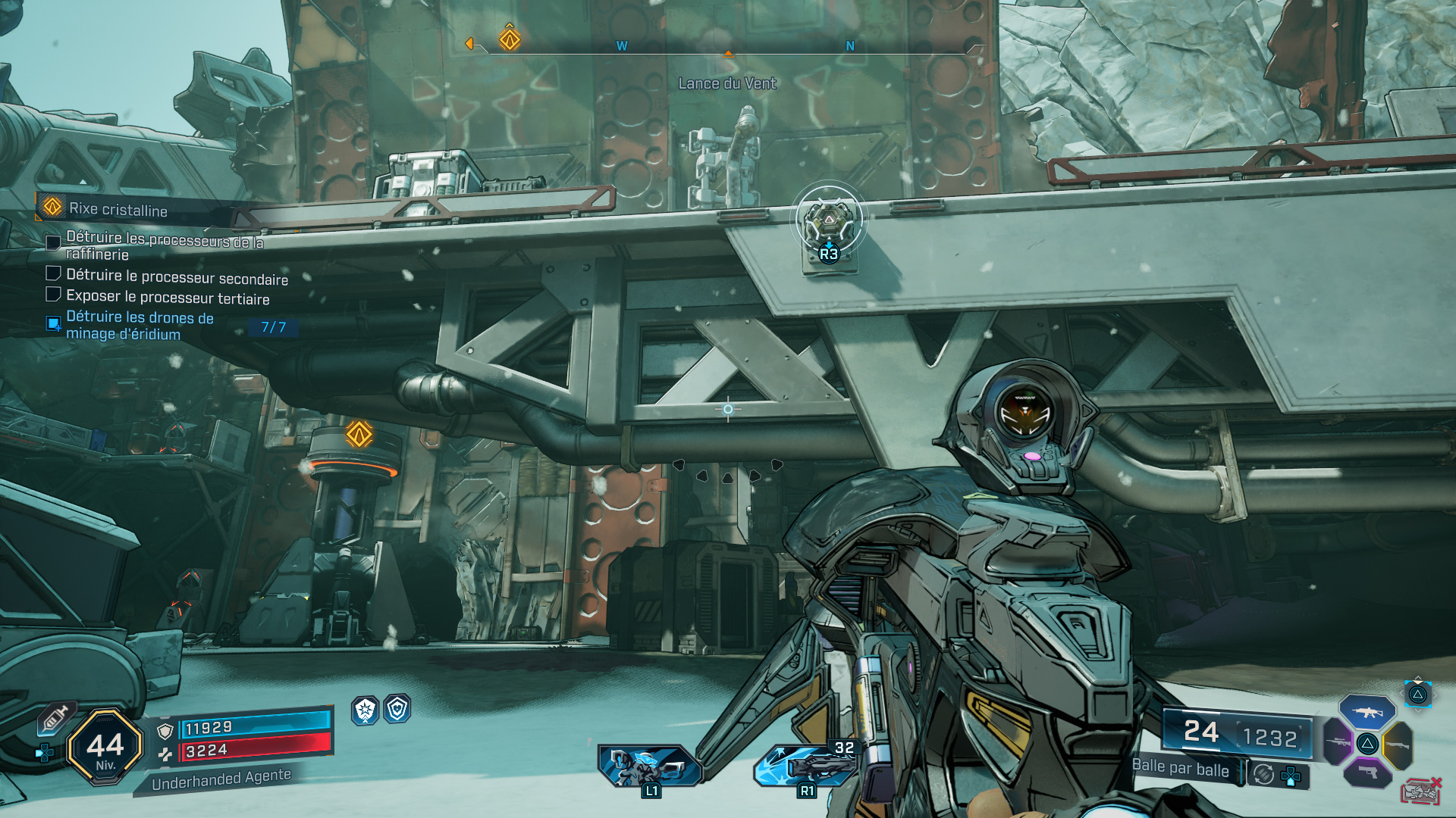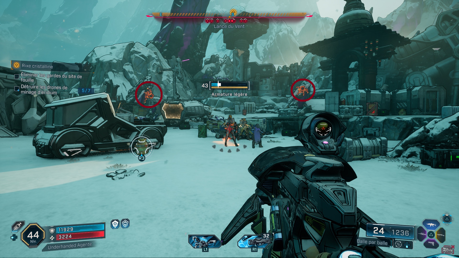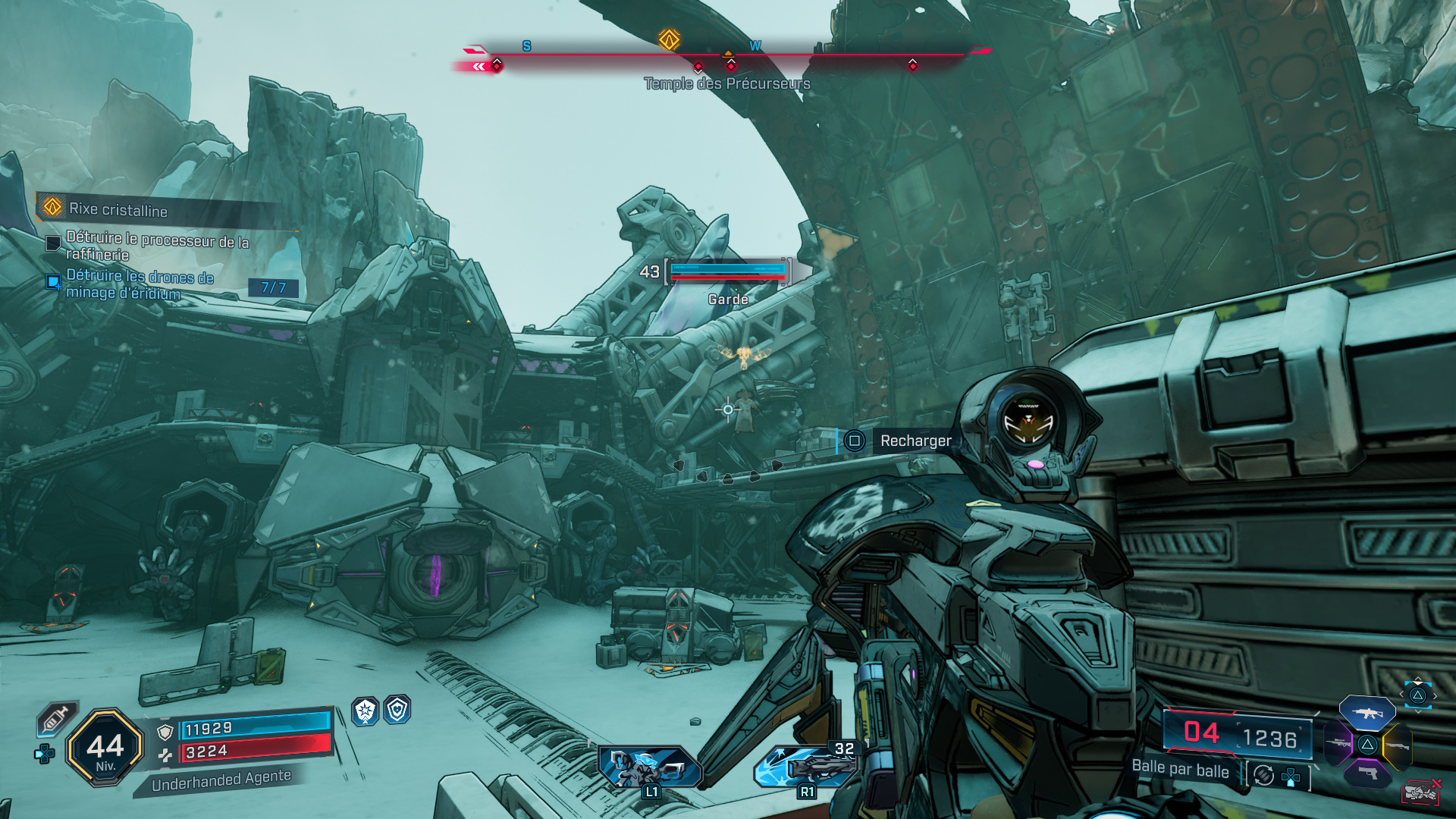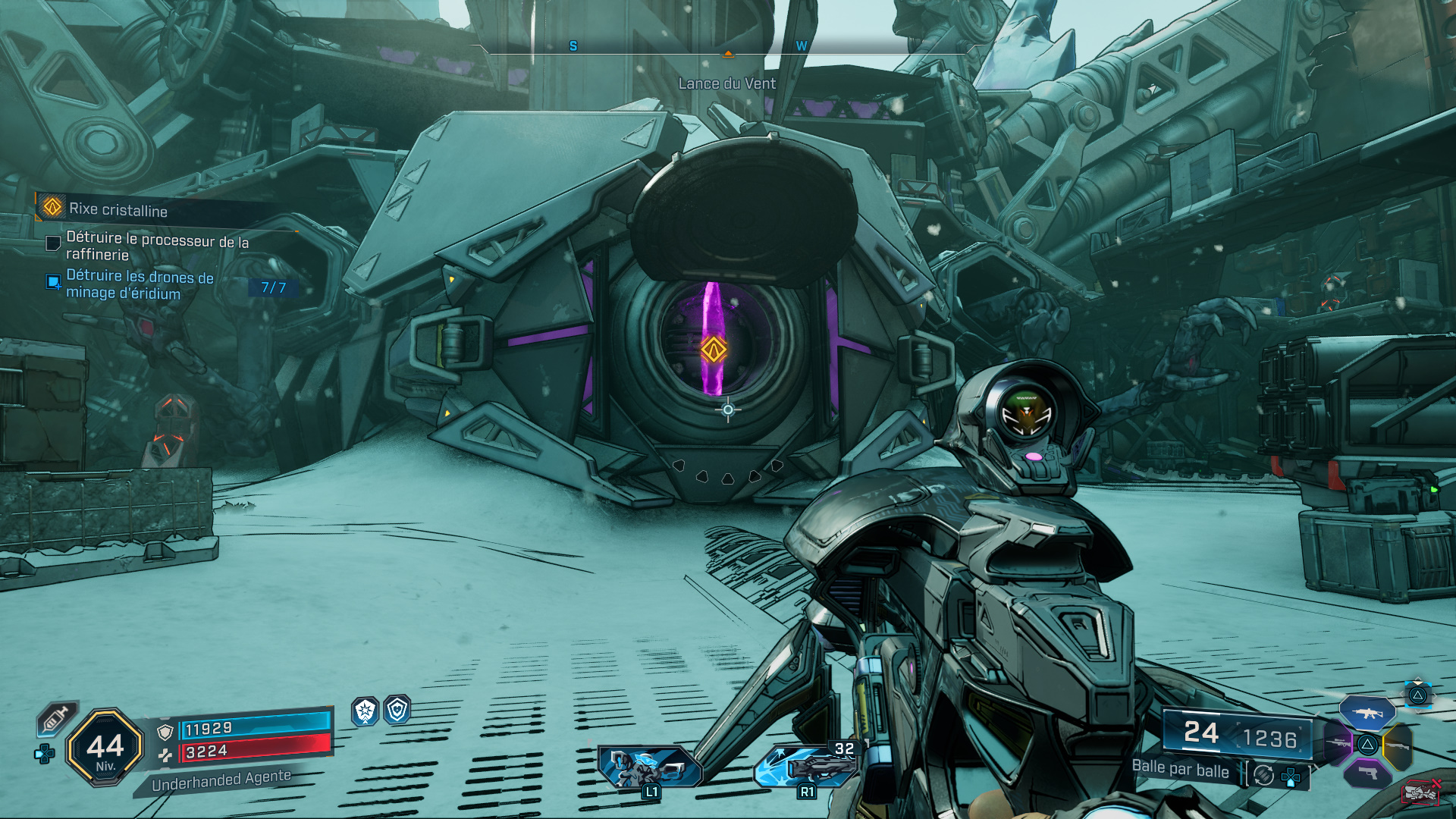 Continuez ensuite d’avancer en compagnie d’Amara et attendez qu’elle ouvre un passage vers le site de fouille, là où d’autres gardes vous attendent. Après avoir nettoyé la zone, prenez le temps de détruire 3 premiers drones de minage d’éridium dans les parages (vous ne devriez pas avoir de mal à les trouver) si vous souhaitez vous occuper de l’objectif optionnel, puis détruisez le générateur en tirant sur le noyau violet.