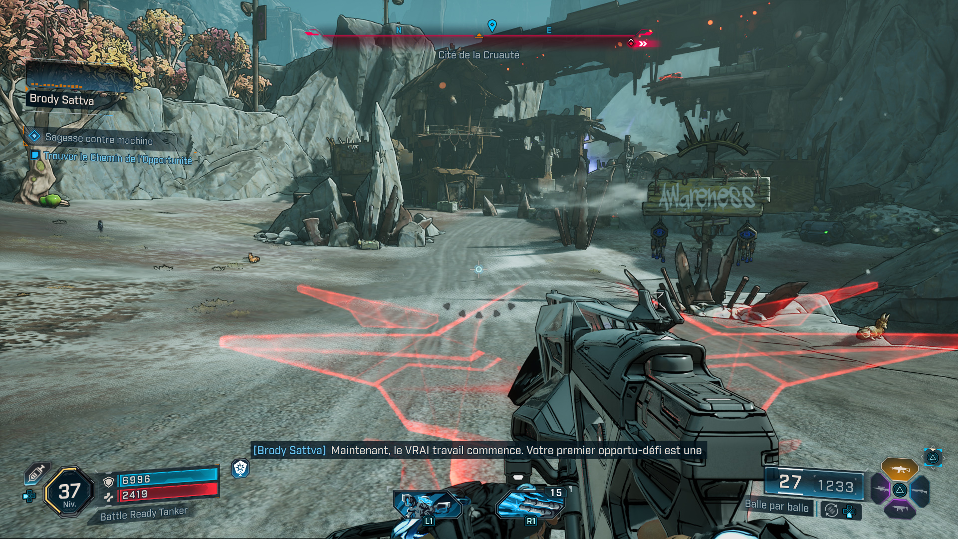 Parlez à Brody Sattva pour accepter la mission, et commencez par prendre le Prisme égotique sur le comptoir. Puis, suivez l’indicateur de votre boussole en direction du nord-ouest, avant de bifurquer vers le nord-est pour atteindre la Cité de la Cruauté, et plus précisément le Chemin de l’Opportunité.