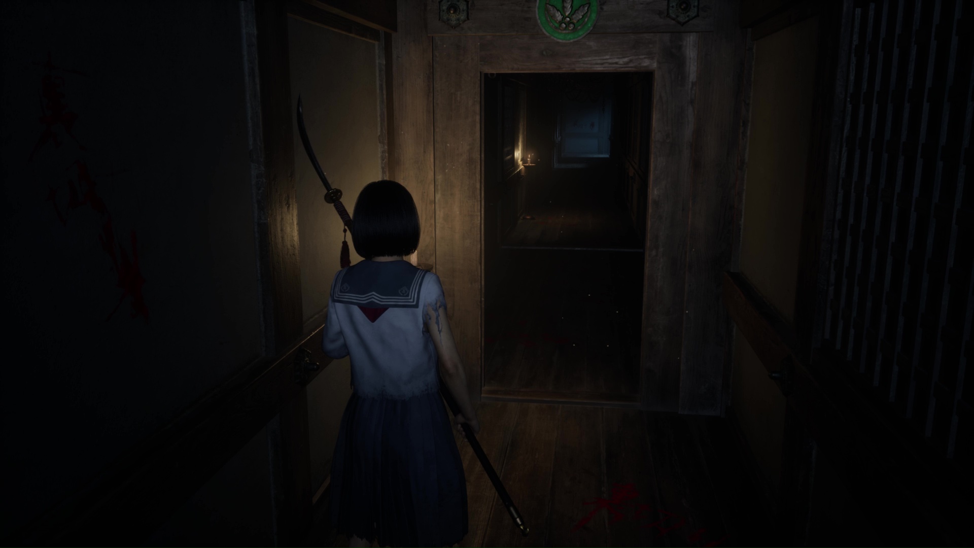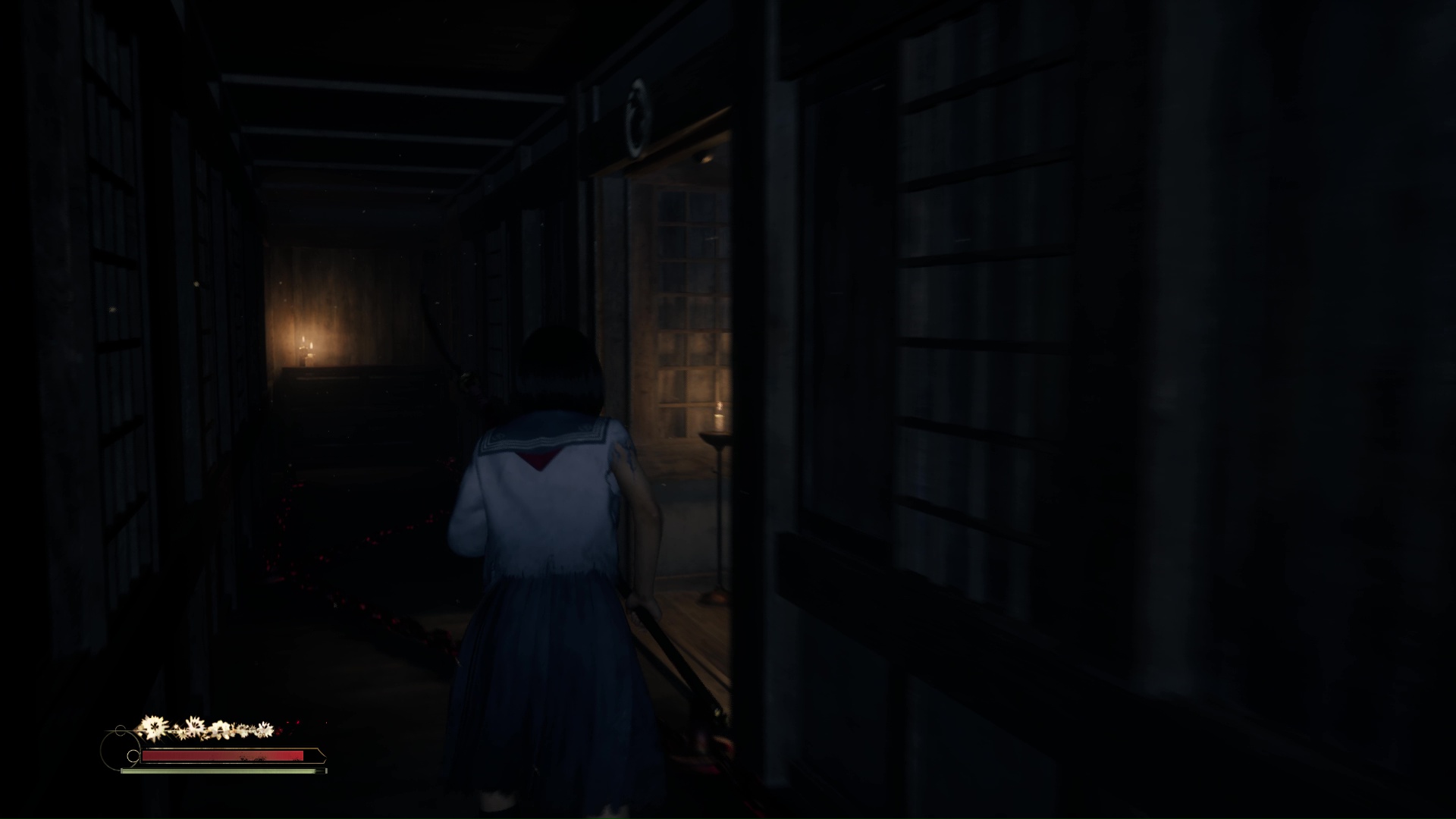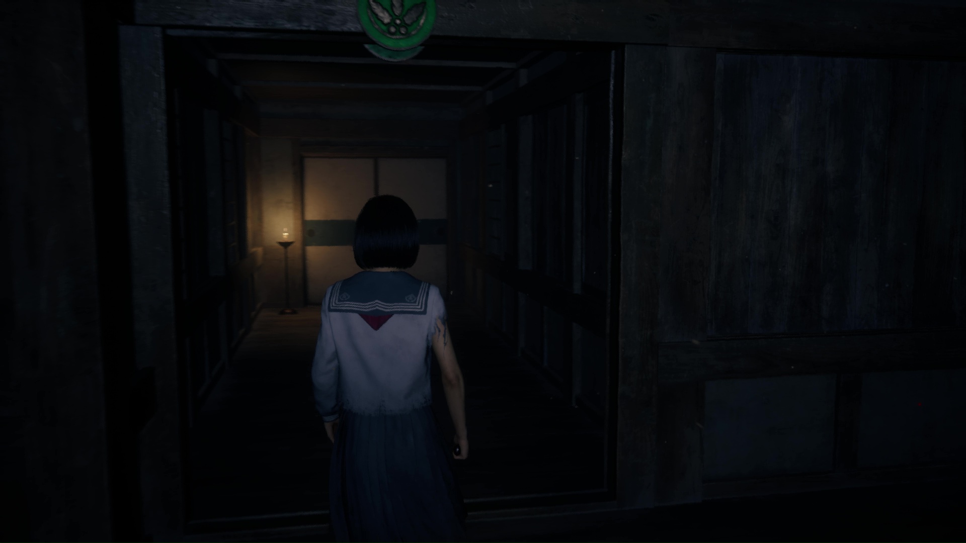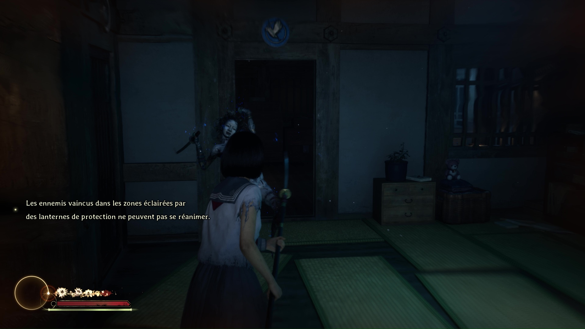 Suivez ensuite le couloir, traversez la pièce éclairée de bougies pour arriver dans une pièce où vous attend un Hokora et un nouveau levier à passer en bleu. Un Journal de Sakuko se trouve dans cette pièce. Éliminez le monstre hurlant près de la lanterne bleue, puis avancez dans le couloir pour retrouver le vestiaire et une pièce (couleur bleue) dorénavant ouverte pour vous proposer l’Énigme de Lumière.