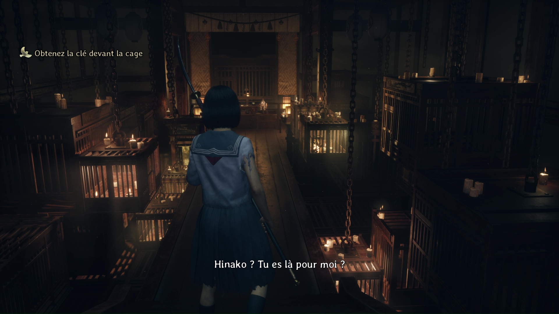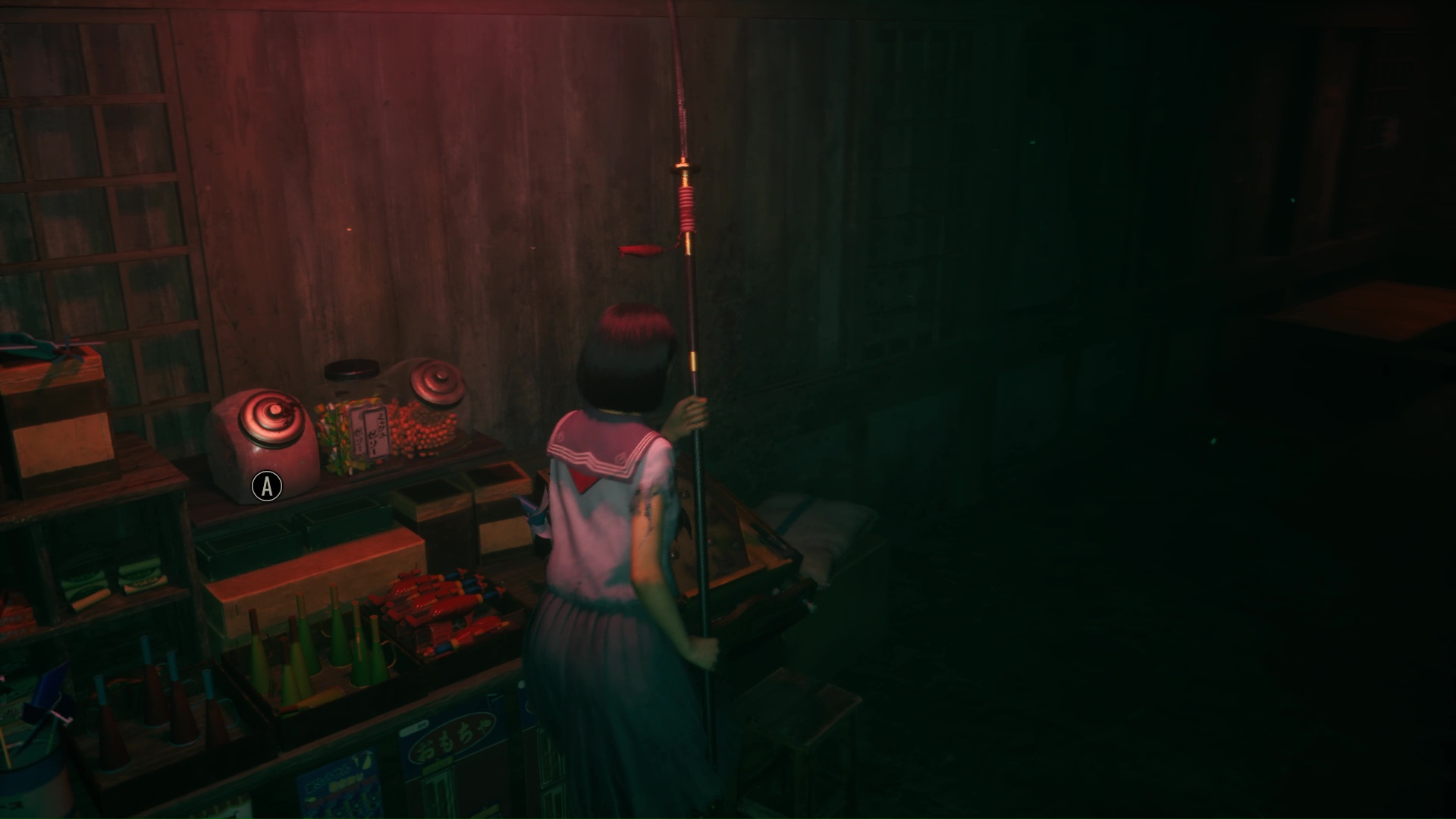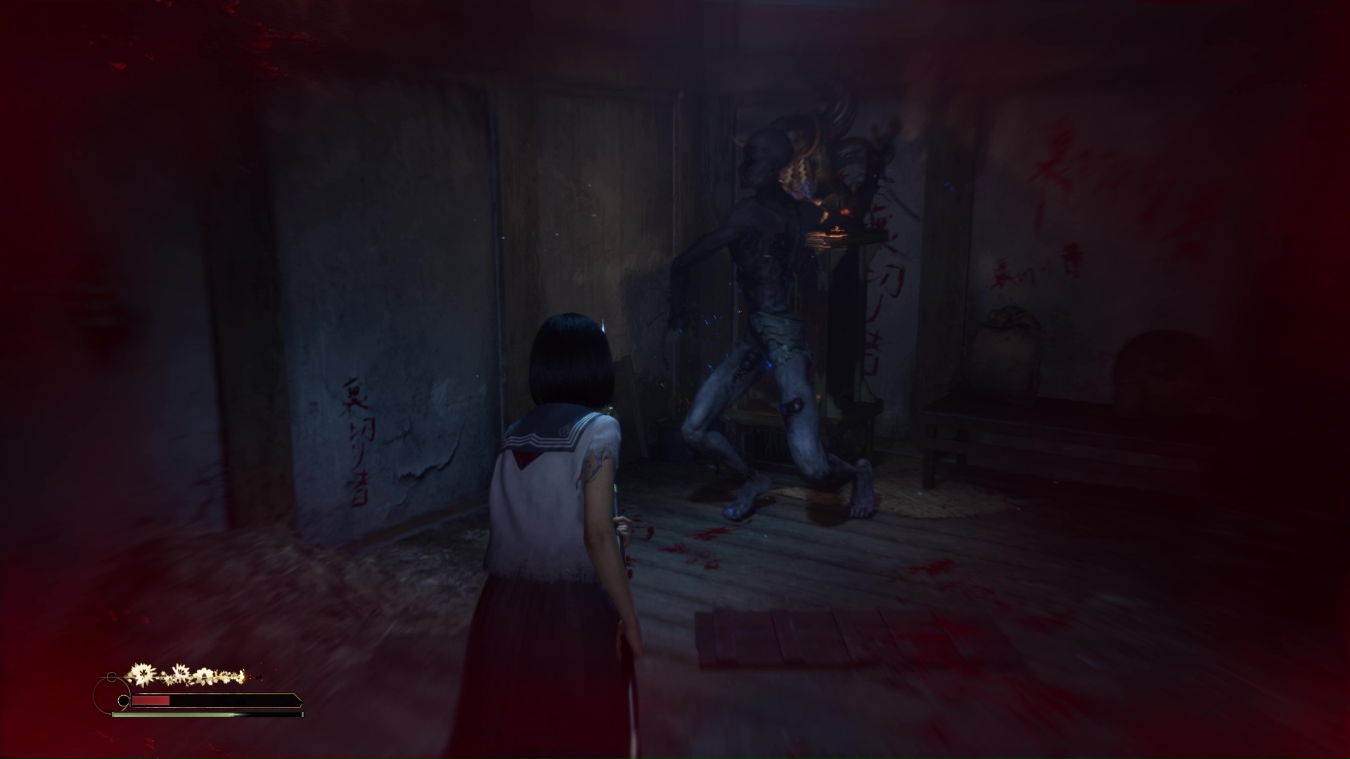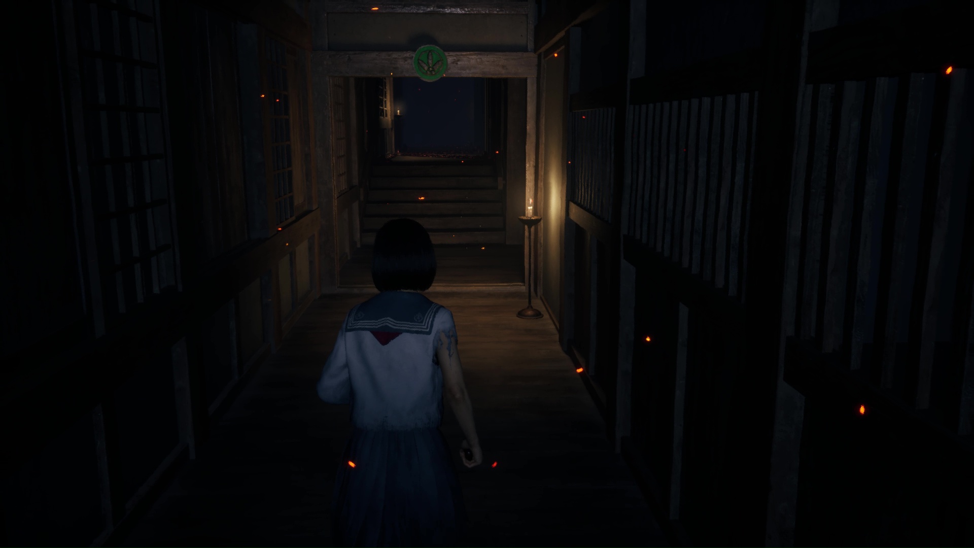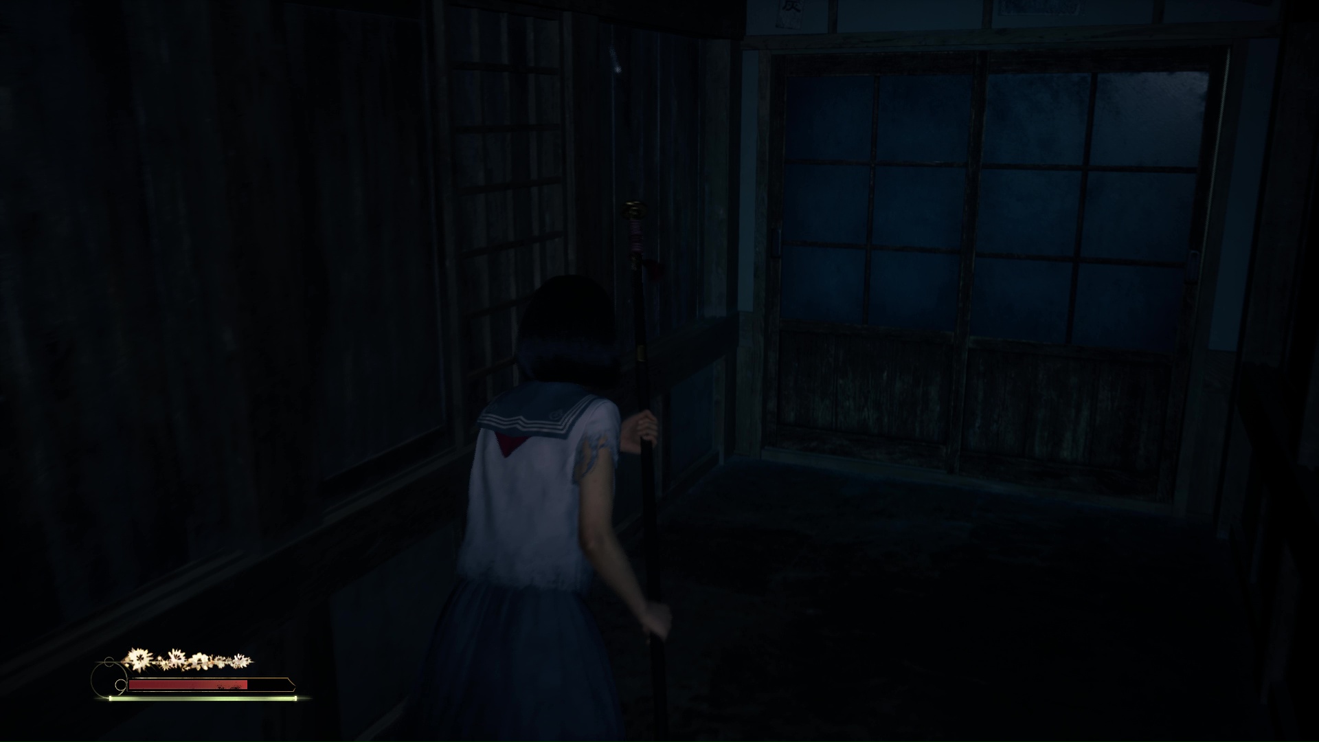 Suivez ensuite le couloir, traversez la pièce éclairée de bougies pour arriver dans une pièce où vous attend un Hokora et un nouveau levier à passer en bleu. Un Journal de Sakuko se trouve dans cette pièce. Éliminez le monstre hurlant près de la lanterne bleue, puis avancez dans le couloir pour retrouver le vestiaire et une pièce (couleur bleue) dorénavant ouverte pour vous proposer l’Énigme de Lumière.