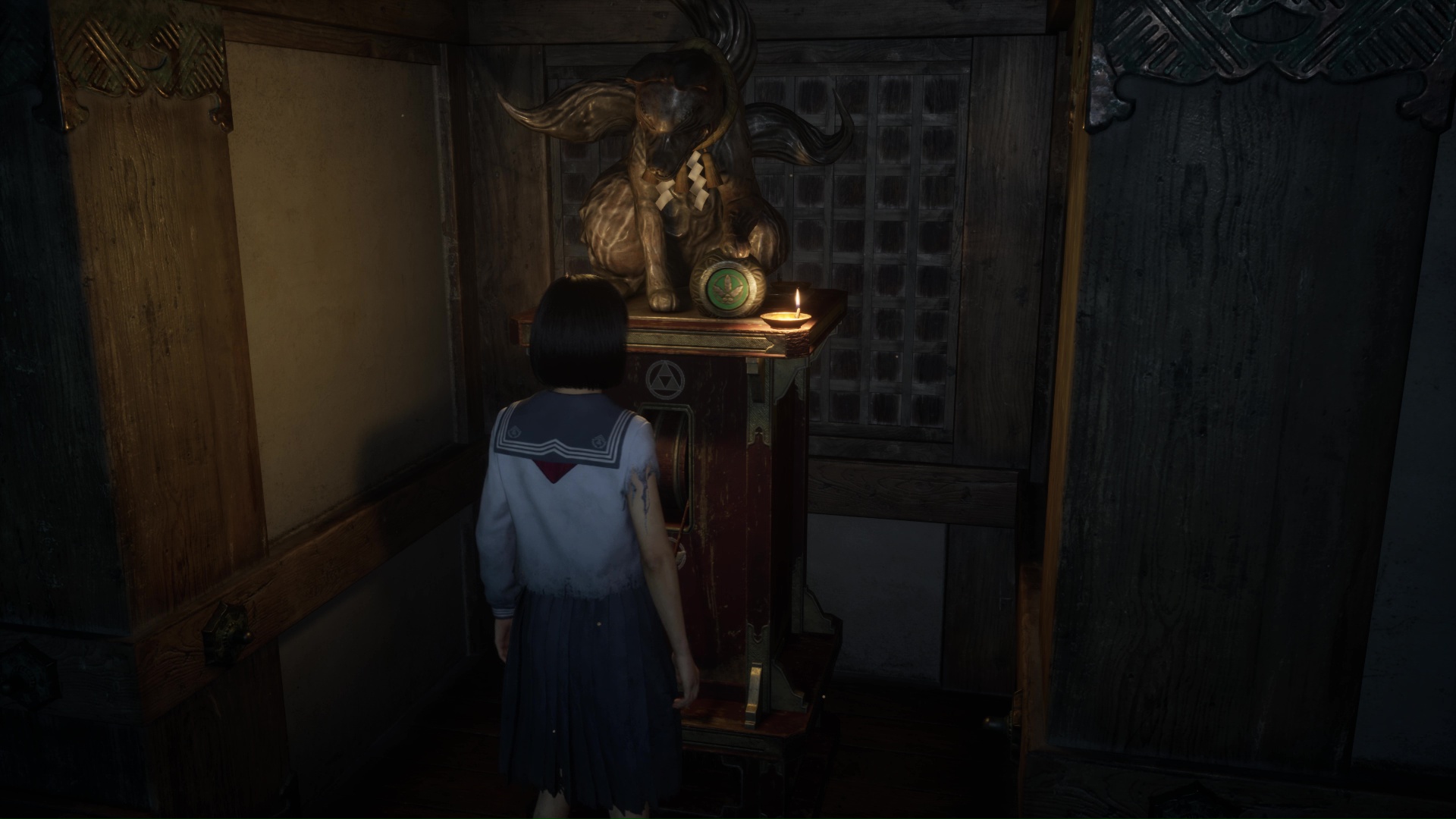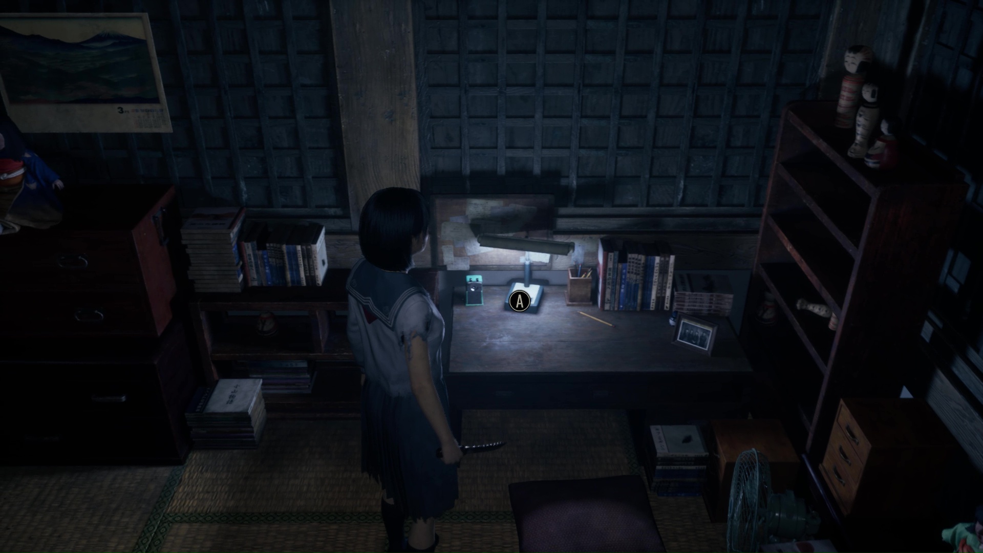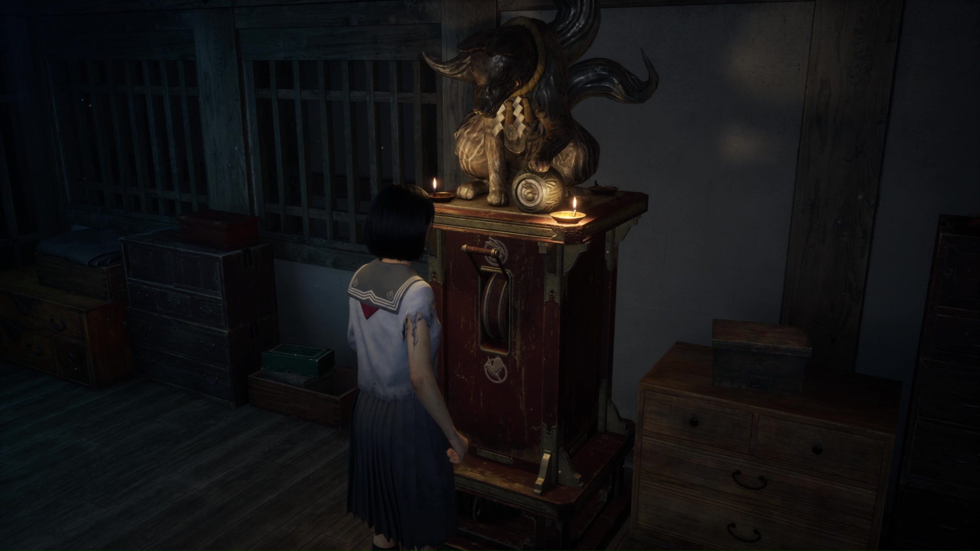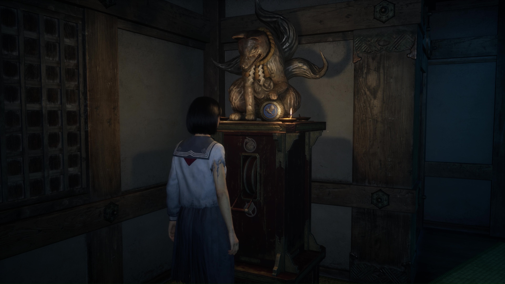 Interagissez avec la lampe sur le bureau pour transformer l’atmosphère, puis interagissez avec la poupée présente sur la commode à gauche pour trouver l’Écusson de renard (profil droit). Utilisez la porte coulissante pour revenir dans la pièce de départ près de l’Hokora.