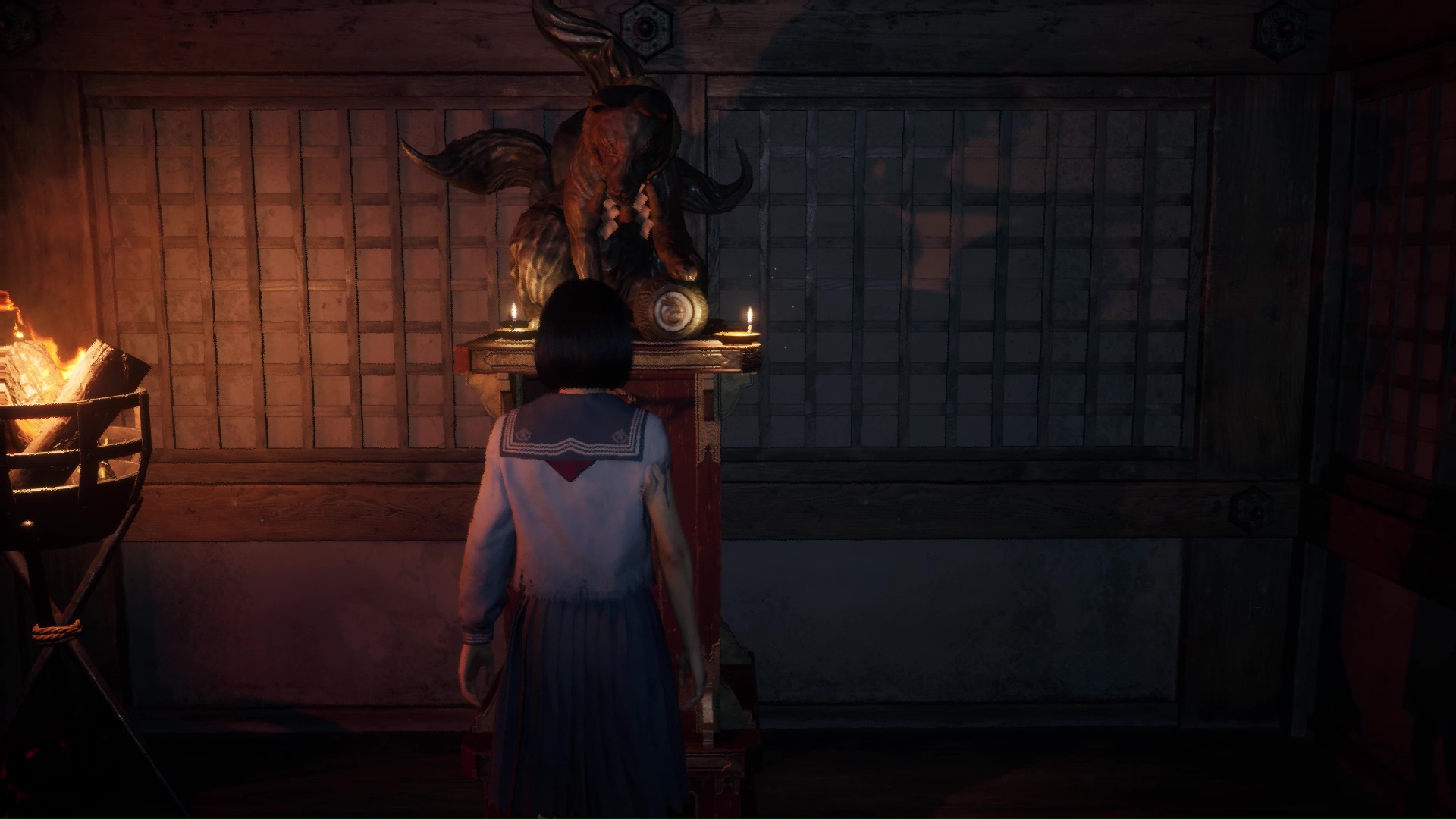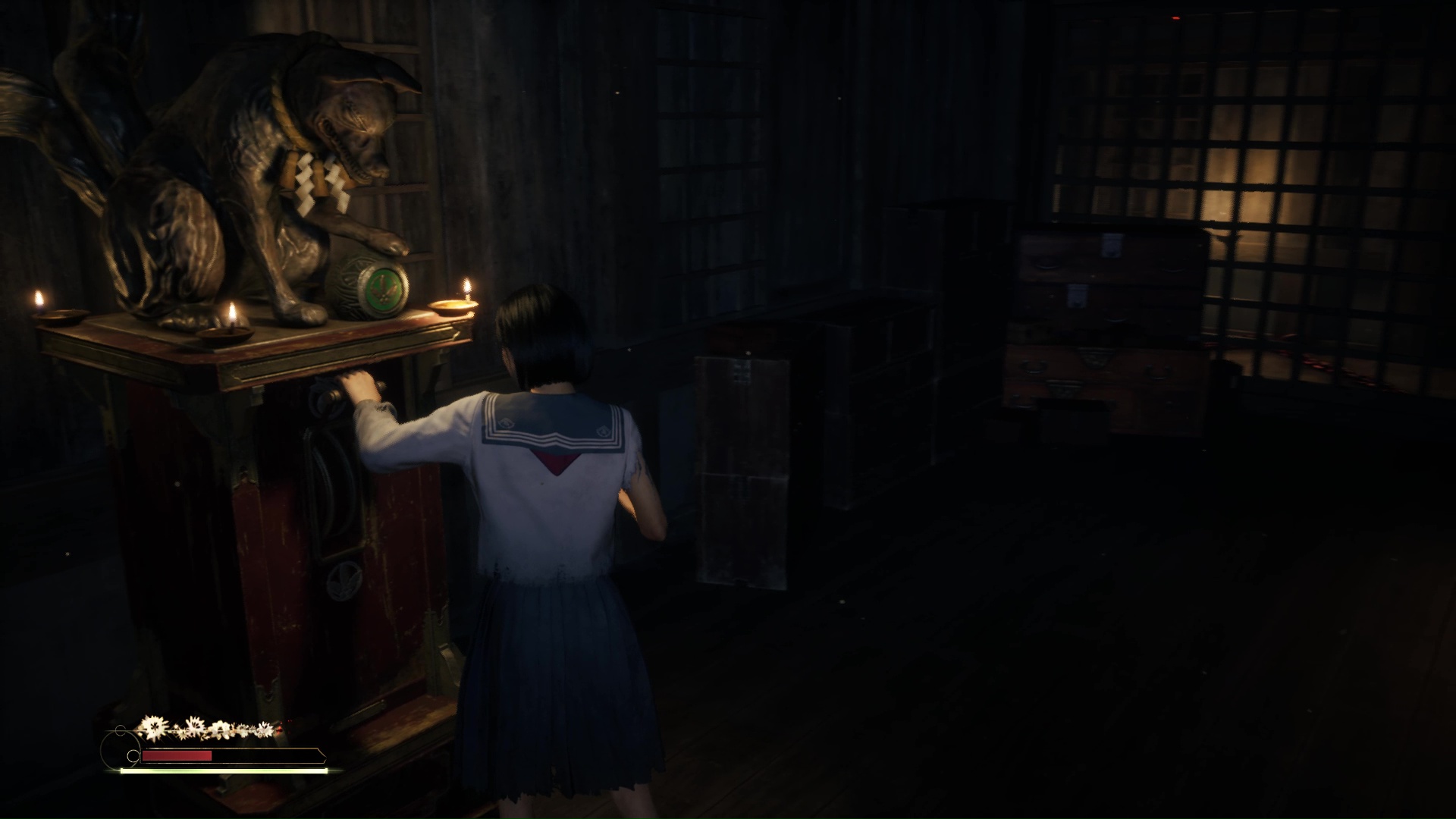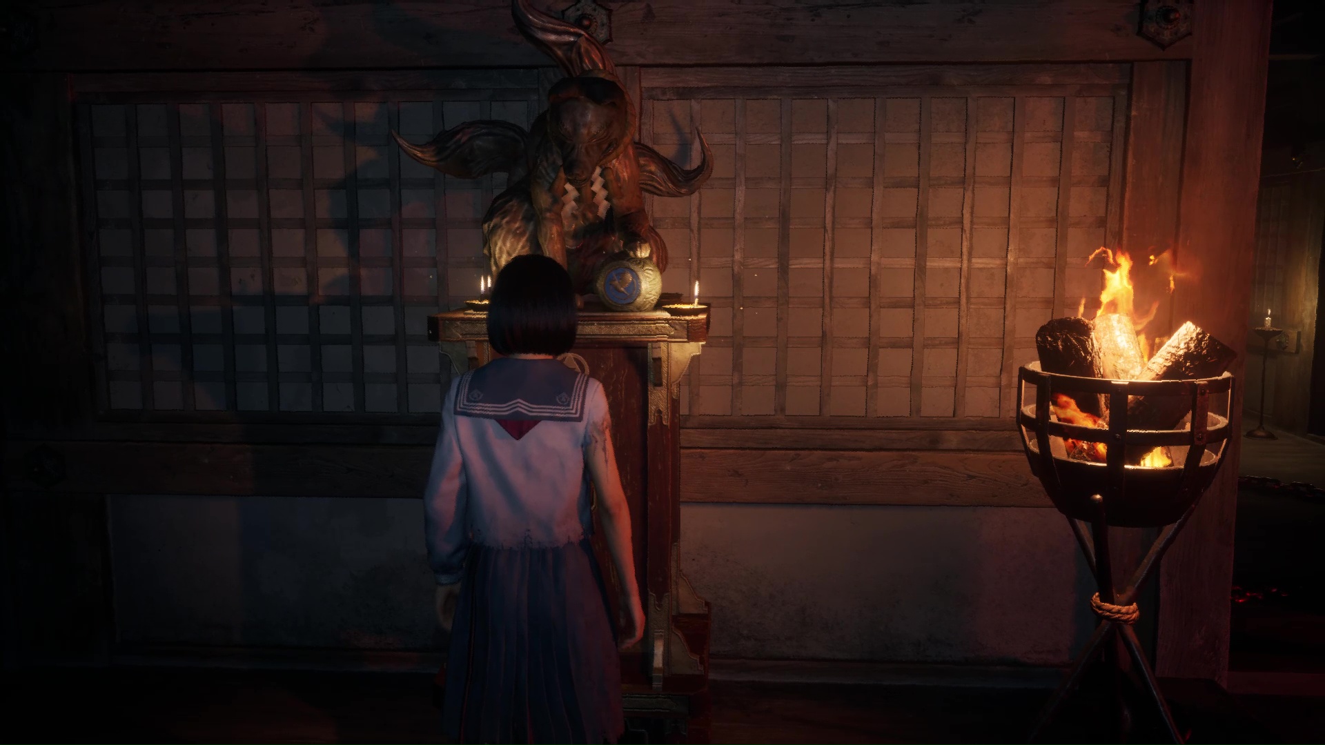 Interagissez avec la lampe sur le bureau pour transformer l’atmosphère, puis interagissez avec la poupée présente sur la commode à gauche pour trouver l’Écusson de renard (profil droit). Utilisez la porte coulissante pour revenir dans la pièce de départ près de l’Hokora.
