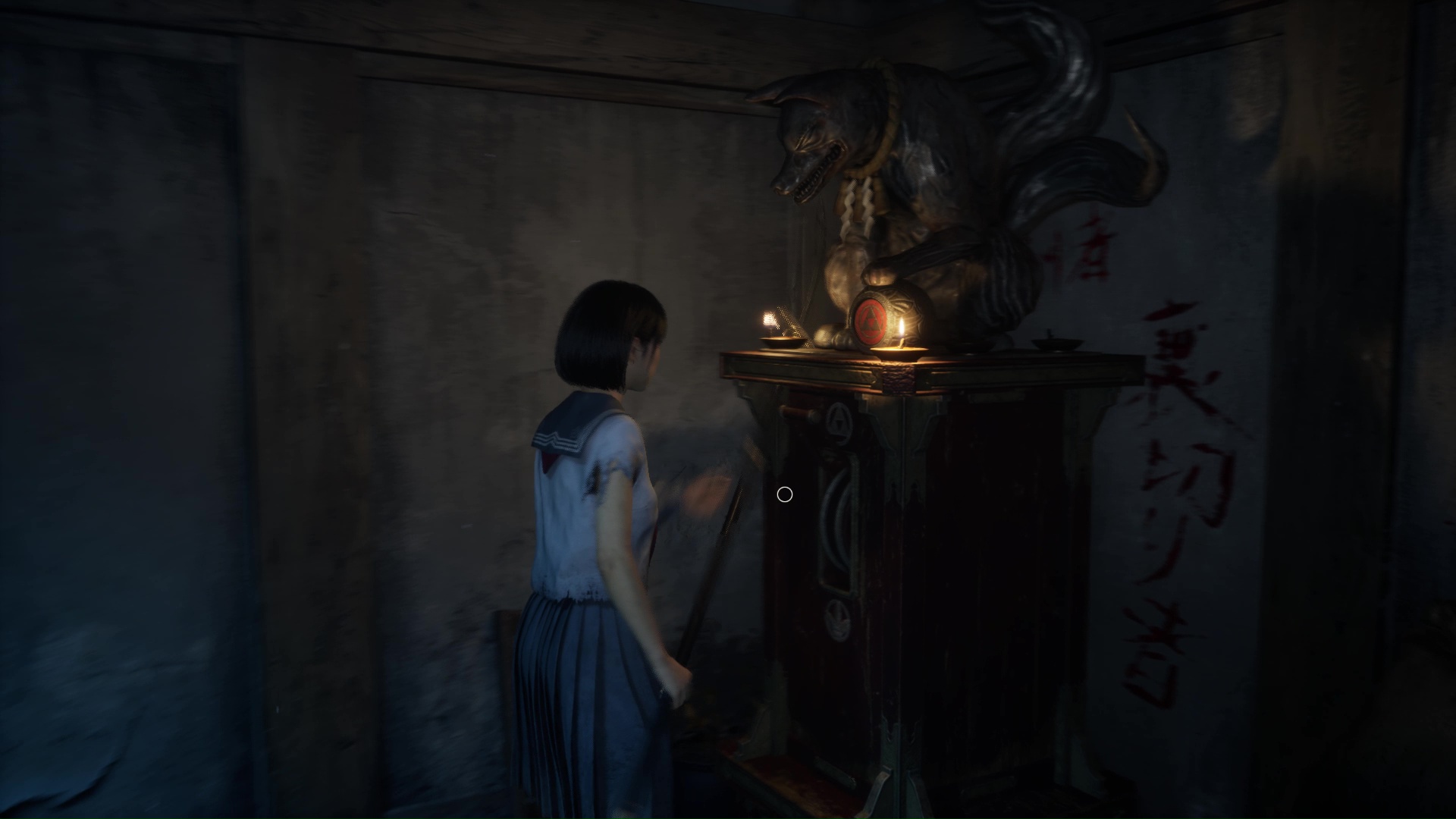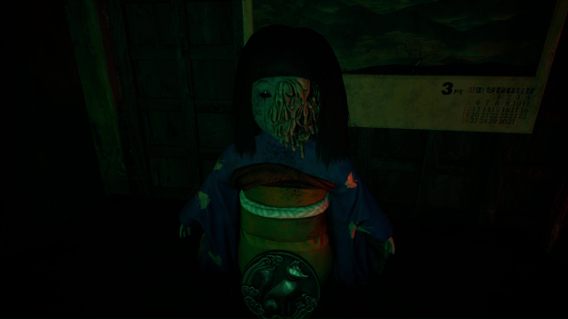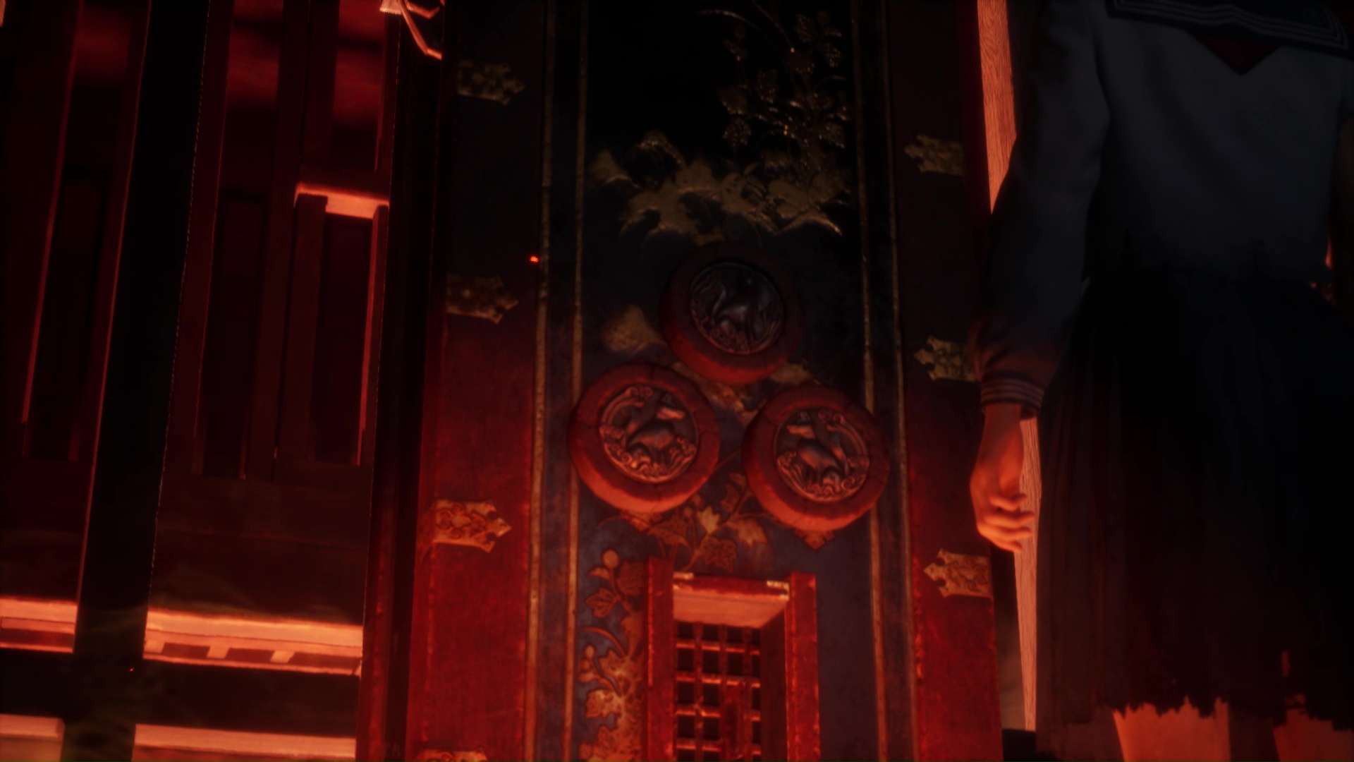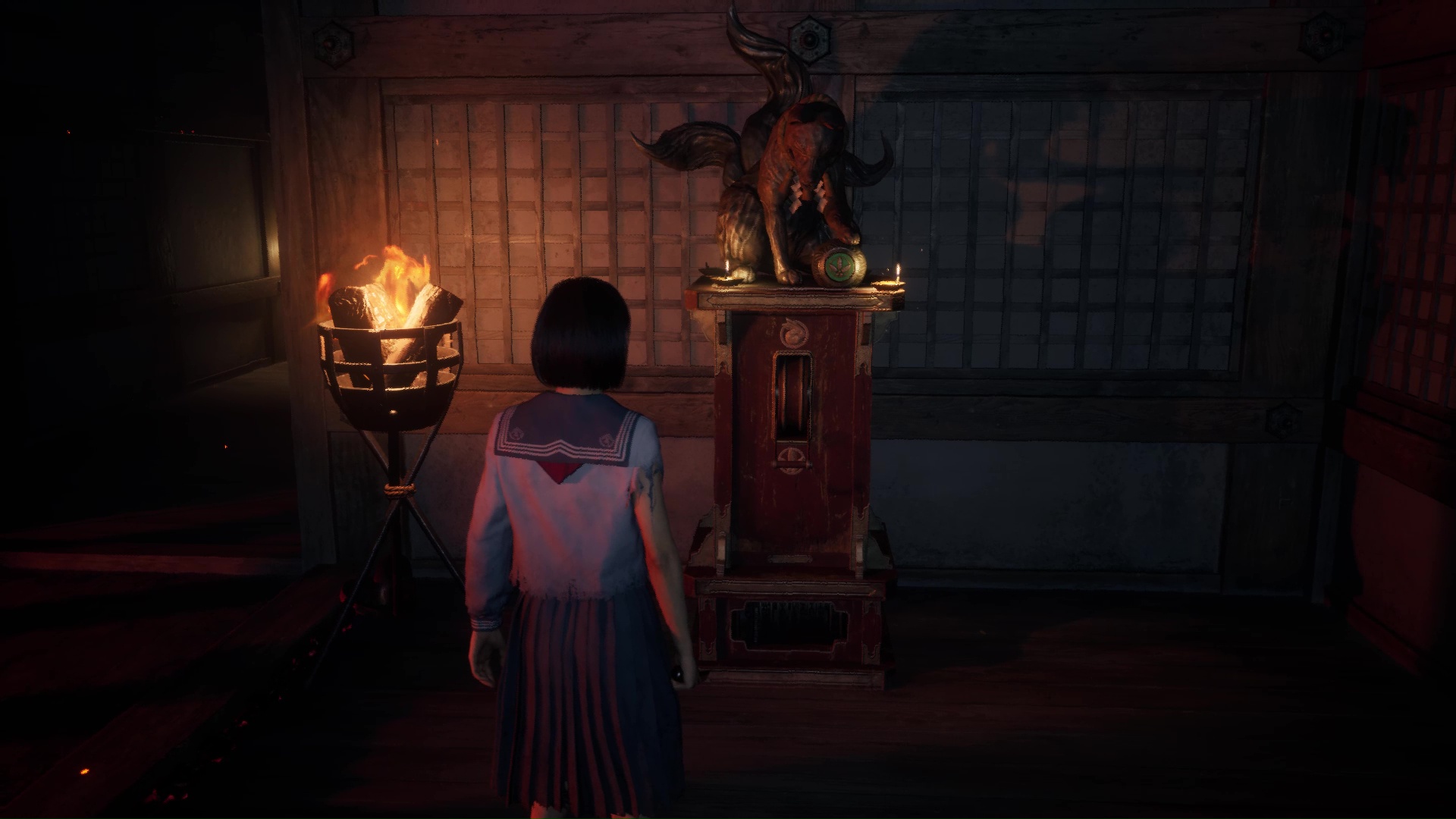 Interagissez avec la lampe sur le bureau pour transformer l’atmosphère, puis interagissez avec la poupée présente sur la commode à gauche pour trouver l’Écusson de renard (profil droit). Utilisez la porte coulissante pour revenir dans la pièce de départ près de l’Hokora.