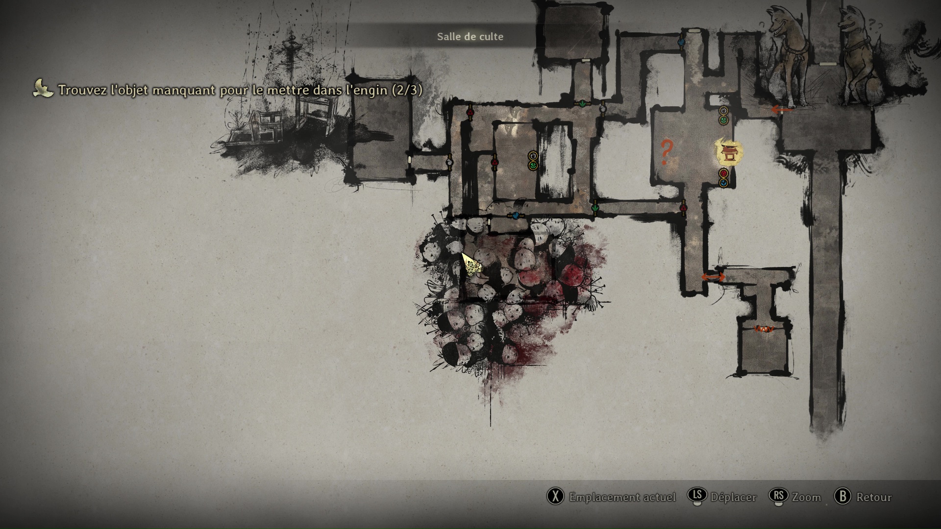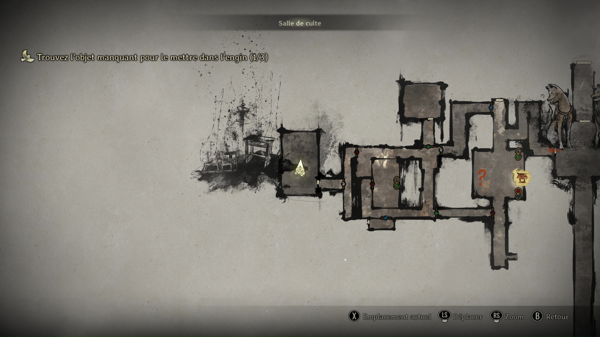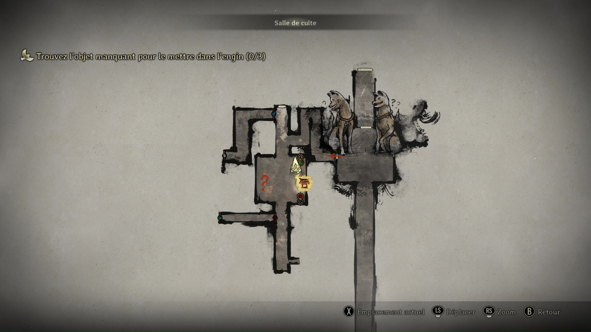 Interagissez avec la partie gauche de la Porte Sacrée pour ouvrir le portail de gauche, puis rejoignez une pièce dans laquelle une voix vous parlera. Le jeu vous demande à ce moment-là de réunir trois objets manquant à mettre dans l’engin.