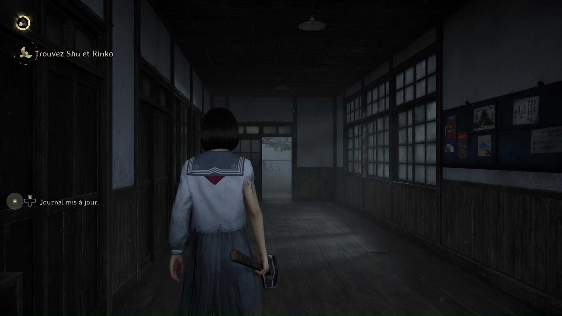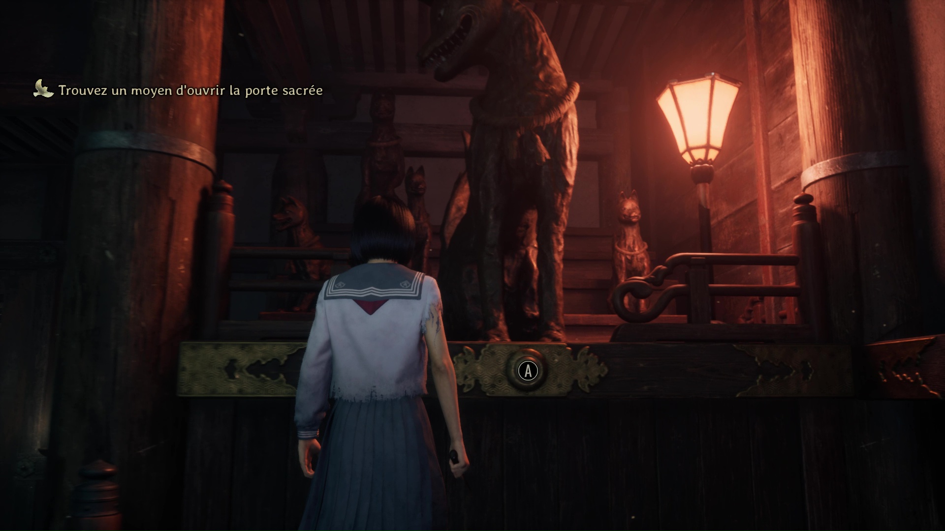 Là, entrez dans une nouvelle pièce avec une porte coulissante, une salle de classe, et interagissez avec la lumière présente sur le bureau du professeur après avoir ramassé tous les objets présents. Attention ici, des monstres vont apparaître une fois la réalité altérée. Faites le tour du petit bureau solitaire pour ramasser l’Écusson de Renard (profil de face). À noter que vous pouvez fuir sans affronter les marionnettes par la porte coulissante et rejoindre la pièce de départ avec l’Hokora.