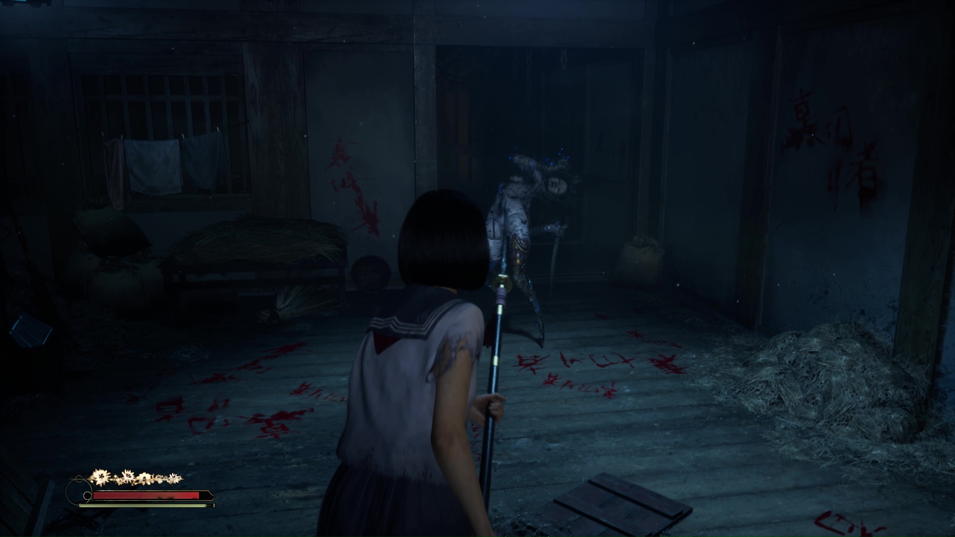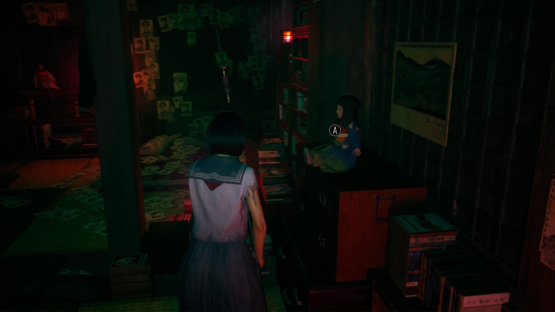 Traversez la porte bleue désormais ouverte dans ce même hall pour rejoindre la zone des monstres hurlants et la pièce bleue désormais accessibles non loin de la marionnette tombée du plafond plus tôt. Suivez le couloir et entrez dans la troisième pièce à porte coulissante. Ramassez les objets, interagissez avec la lumière pour faire apparaître un monstre que vous devez combattre pour être tranquille et fouiller la pièce une nouvelle fois.