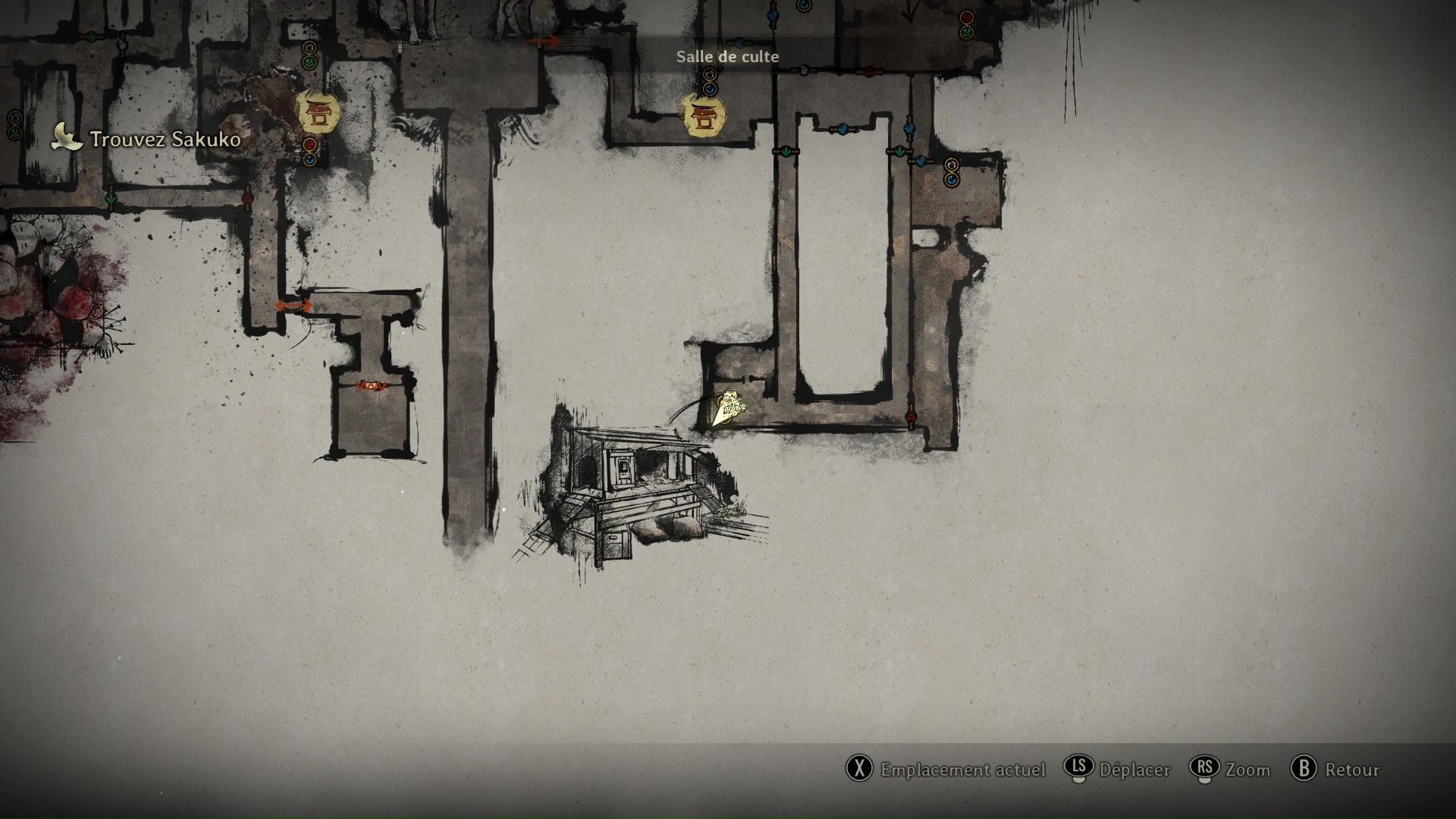 Une fois que vous avez obtenu les deux emblèmes, ouvrez la porte Sacrée et montez l’escalier. Vous parvenez à une nouvelle partie de la Salle de Culte qui débute également par une nouvelle énigme, l’Énigme Souvenirs, qui n’en est pas vraiment une, mais qui constitue à trouver les trésors de Shu à disposer sur des piédestaux dans la pièce où vous arrivez.