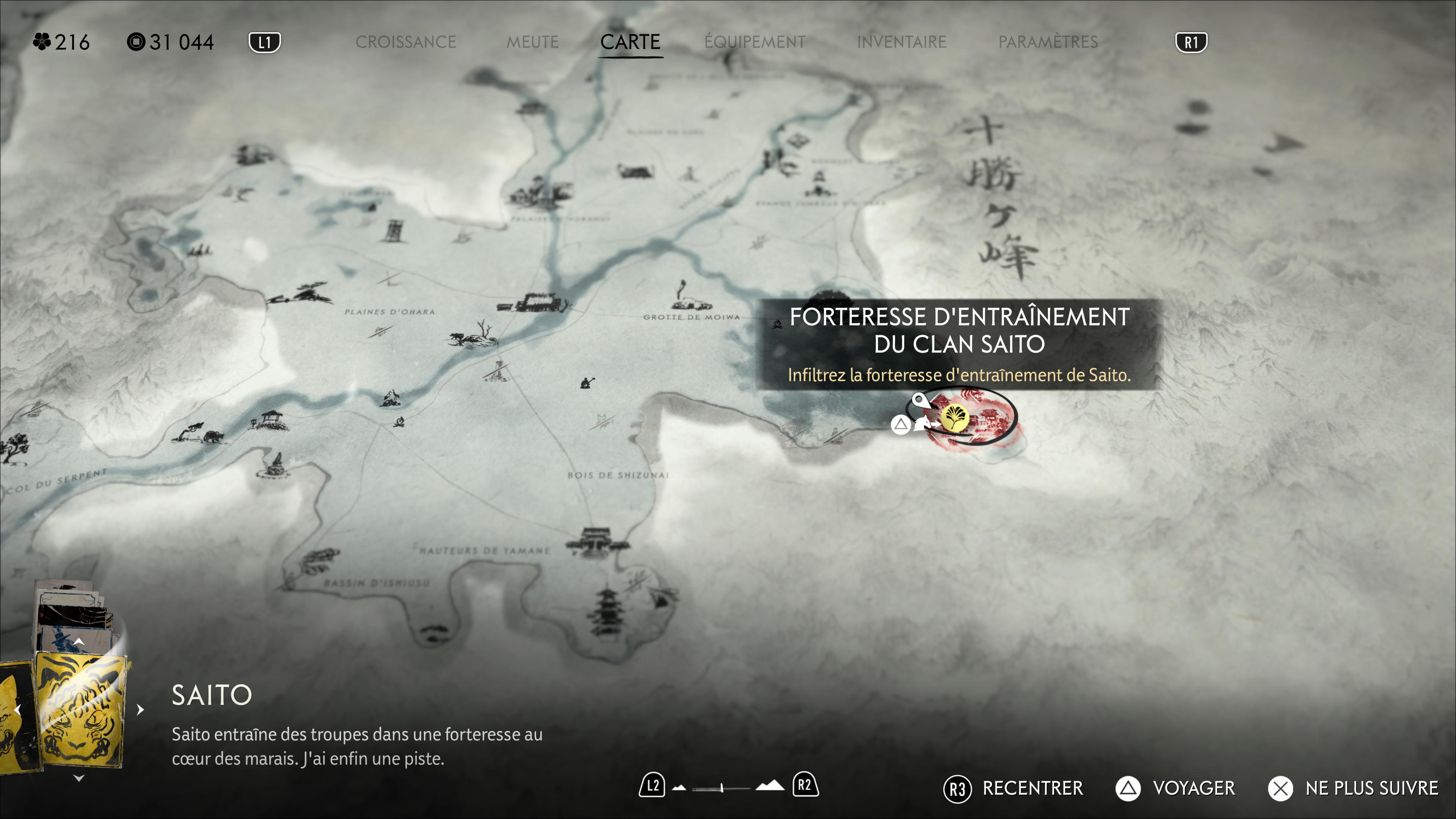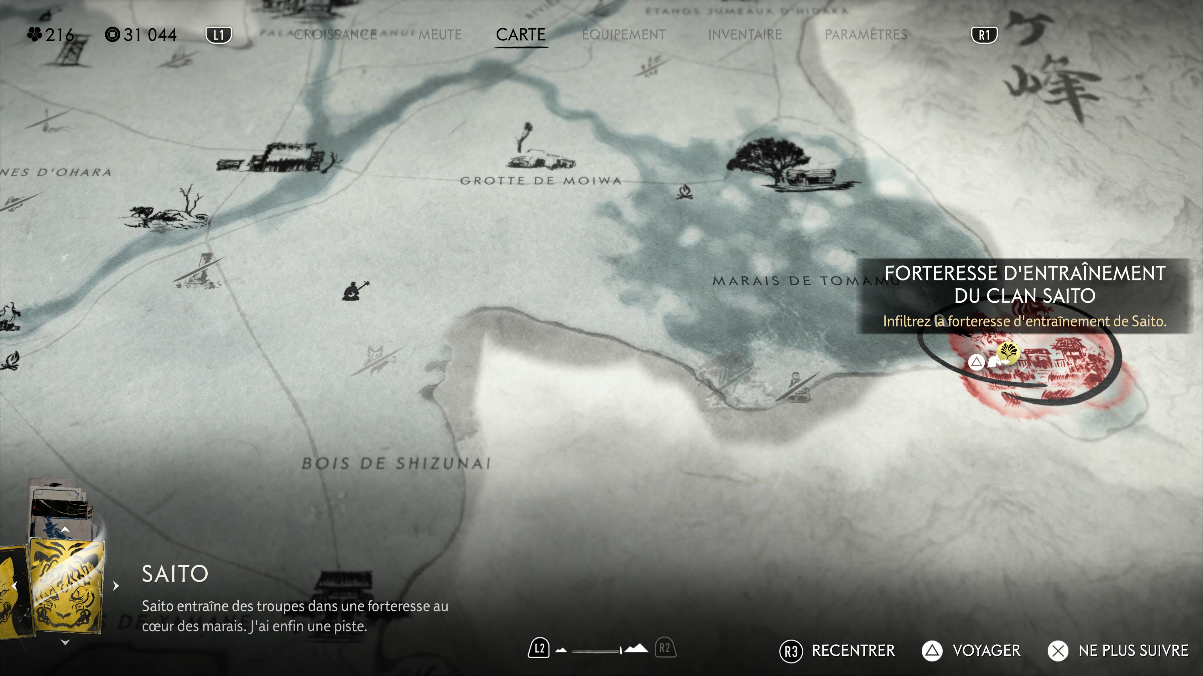 Une fois que vous aurez terminé les quêtes principales « L’ancienne auberge » et « L’art du double katana », vous obtiendrez l’information que Saito se cache au fin fond de sa forteresse, au sud-est des Marais de Tomamu, eux-mêmes au sud-est des Monts Tokachi.