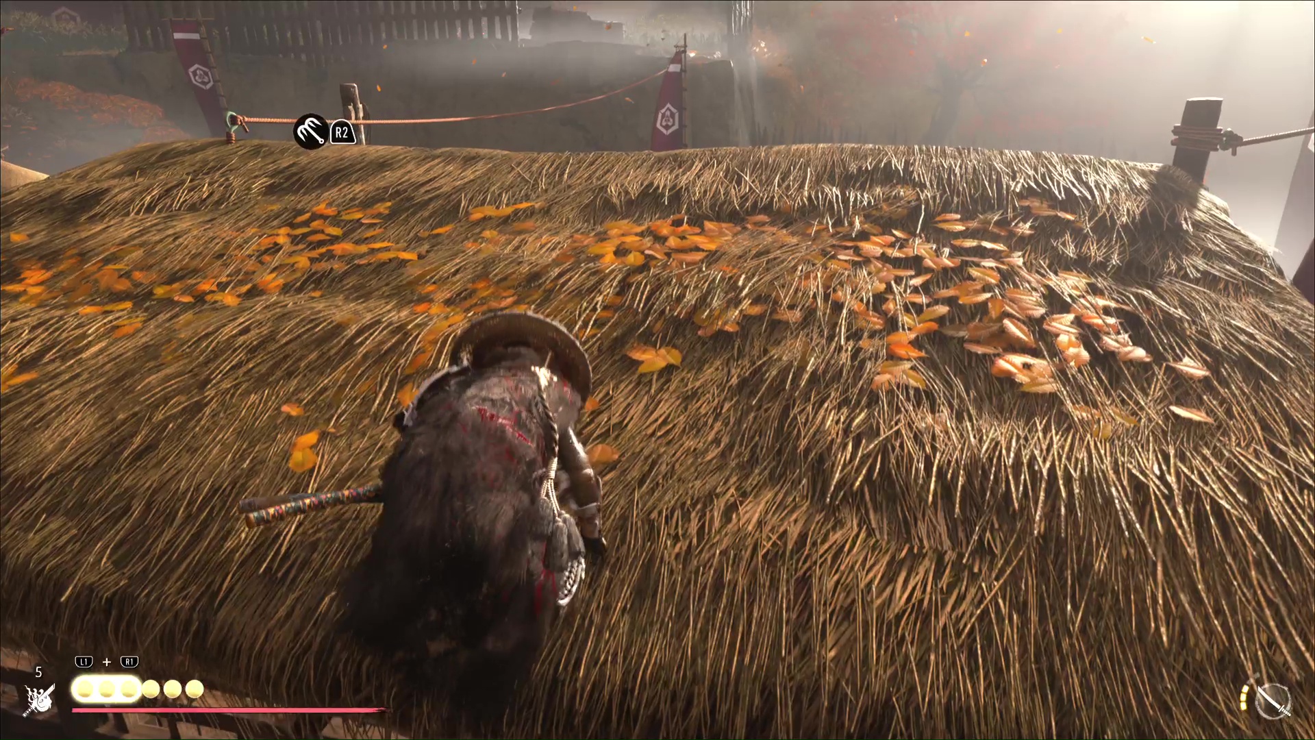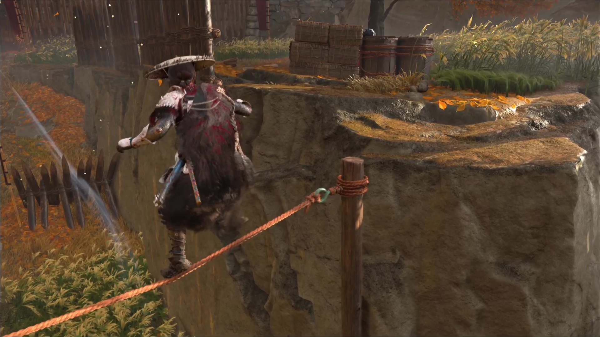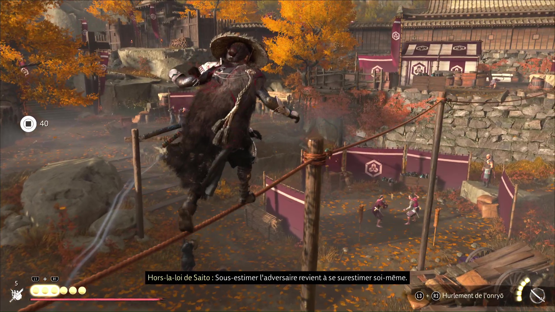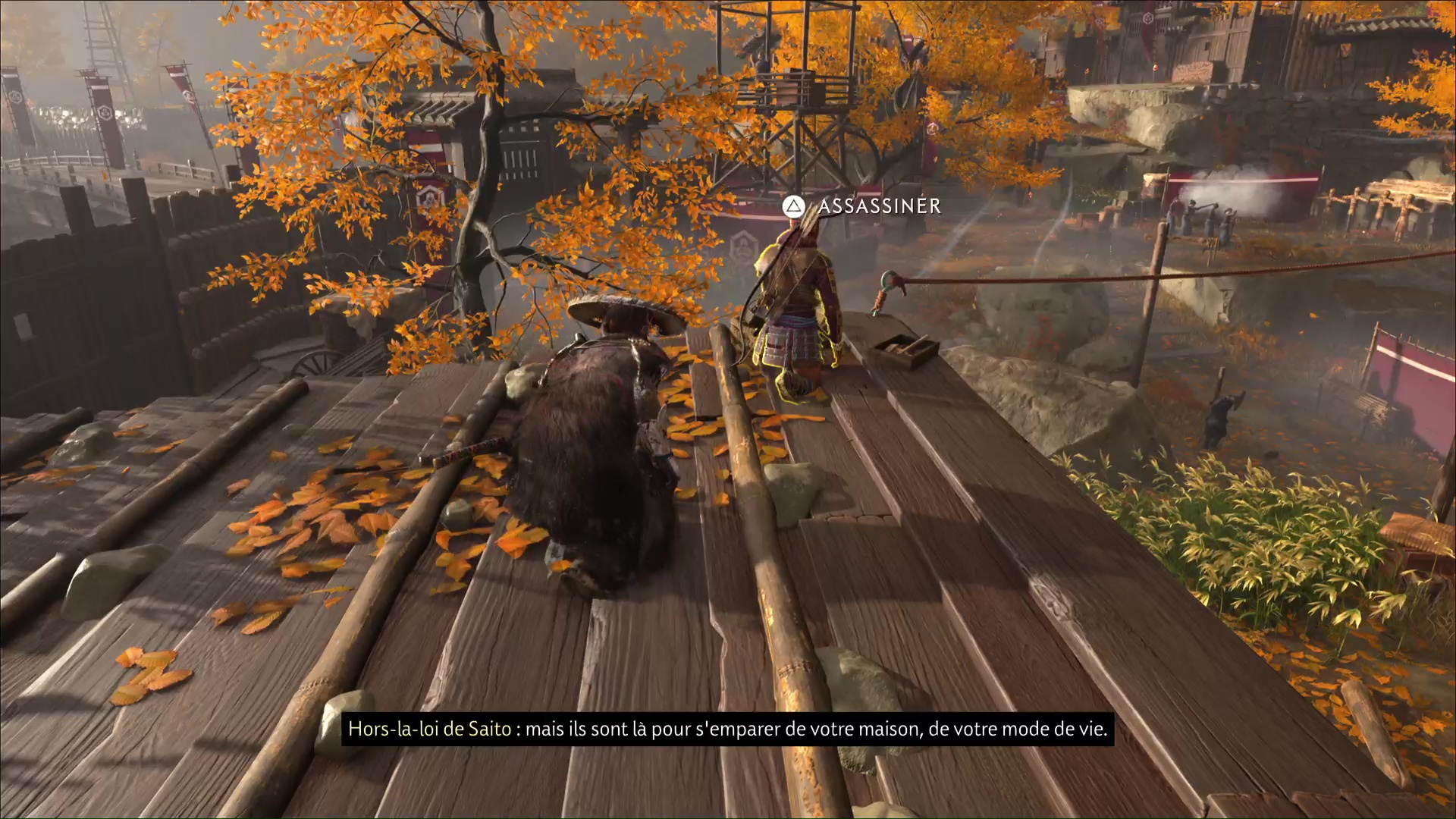 Avancez ensuite en restant caché dans les hautes herbes. Vous n’êtes pas obligé de battre les gardes pour progresser. Montez donc sur le toit juste à côté du premier ennemi que vous croisez, et marchez sur la corde sur votre gauche.