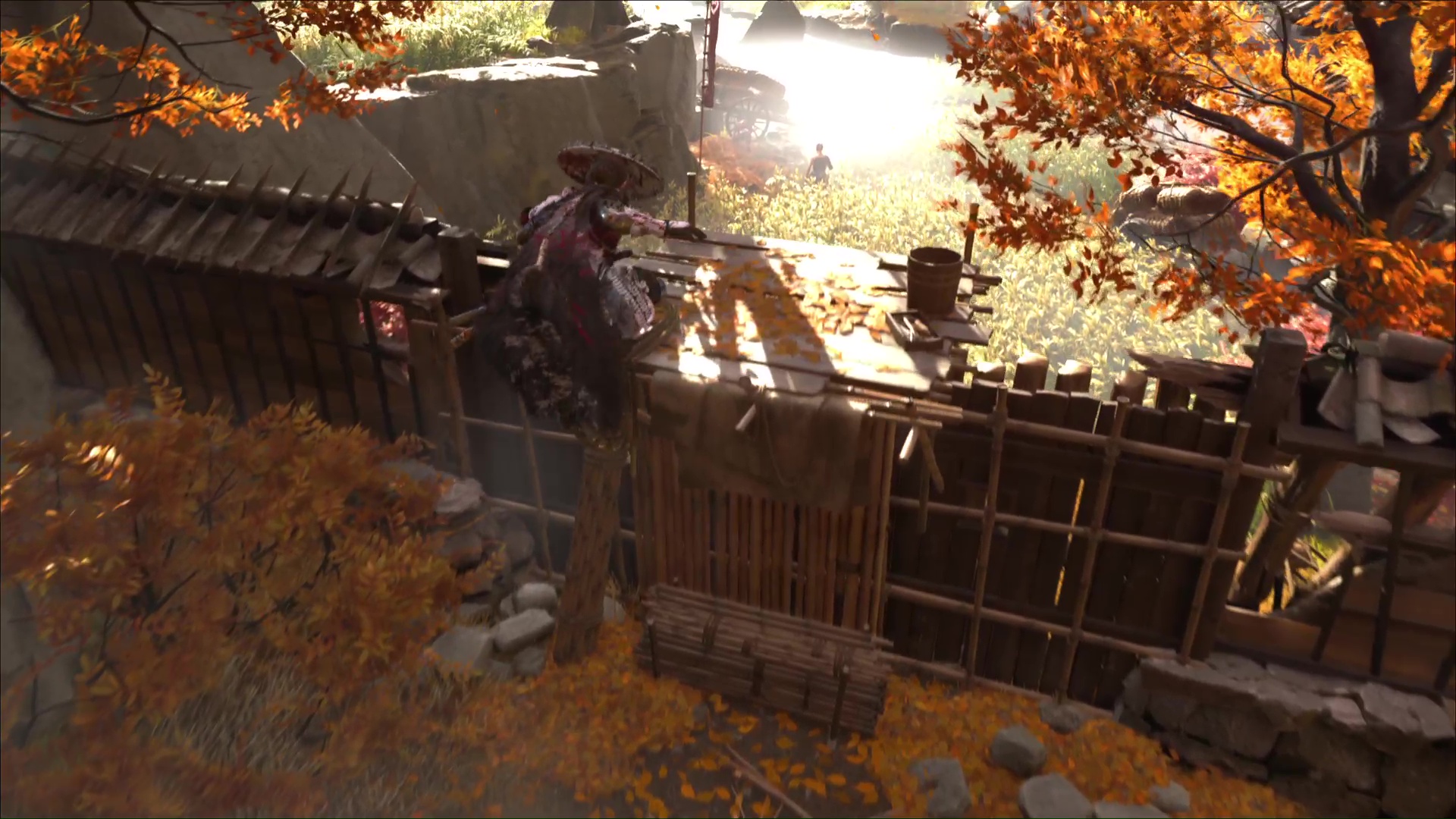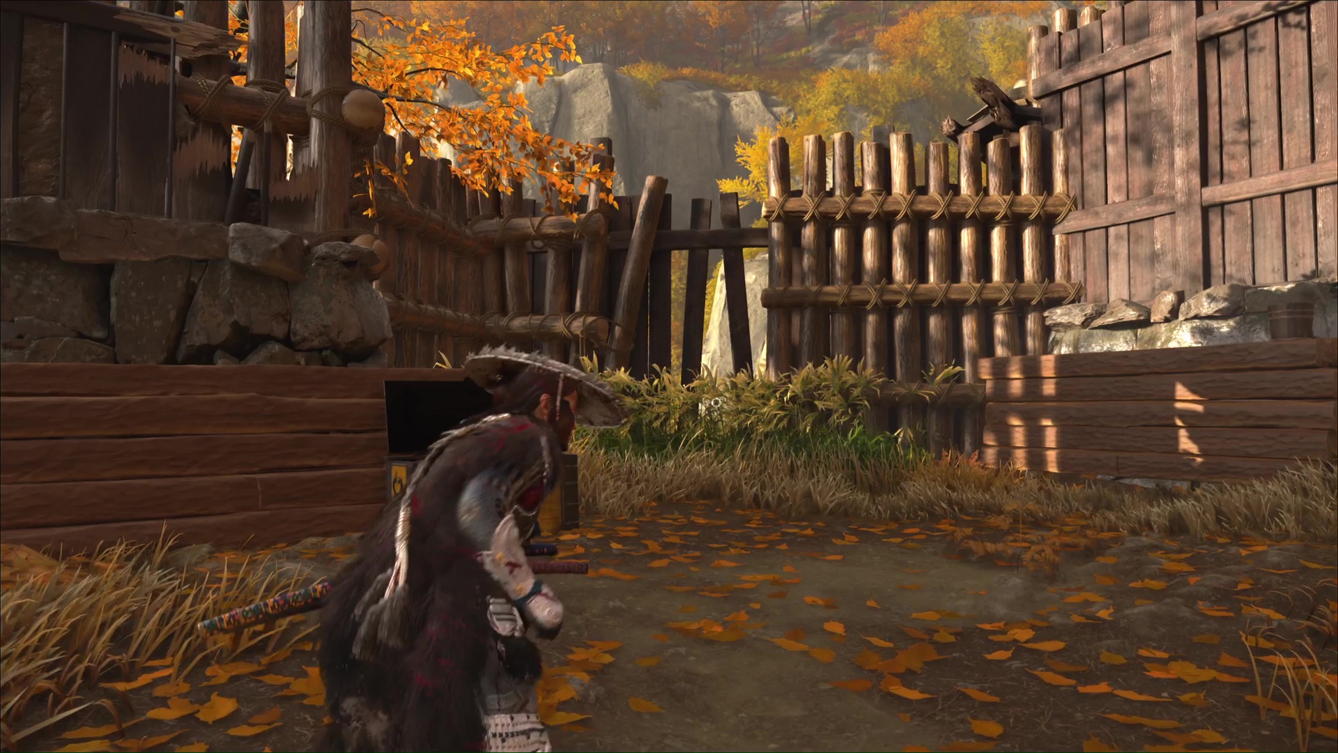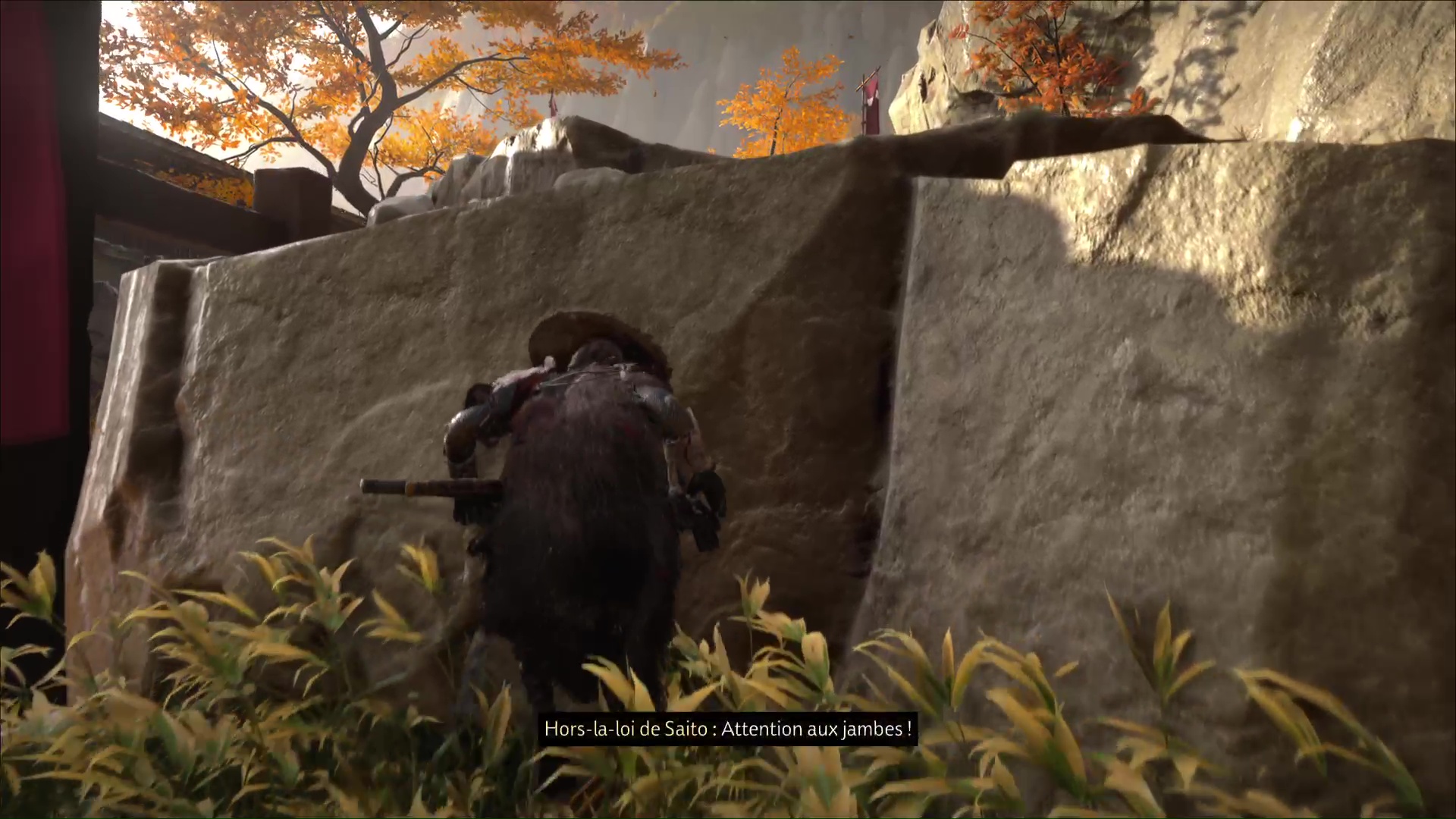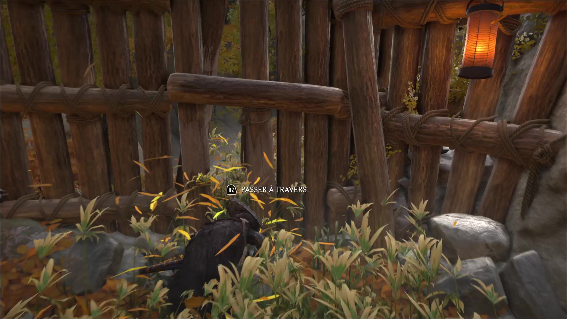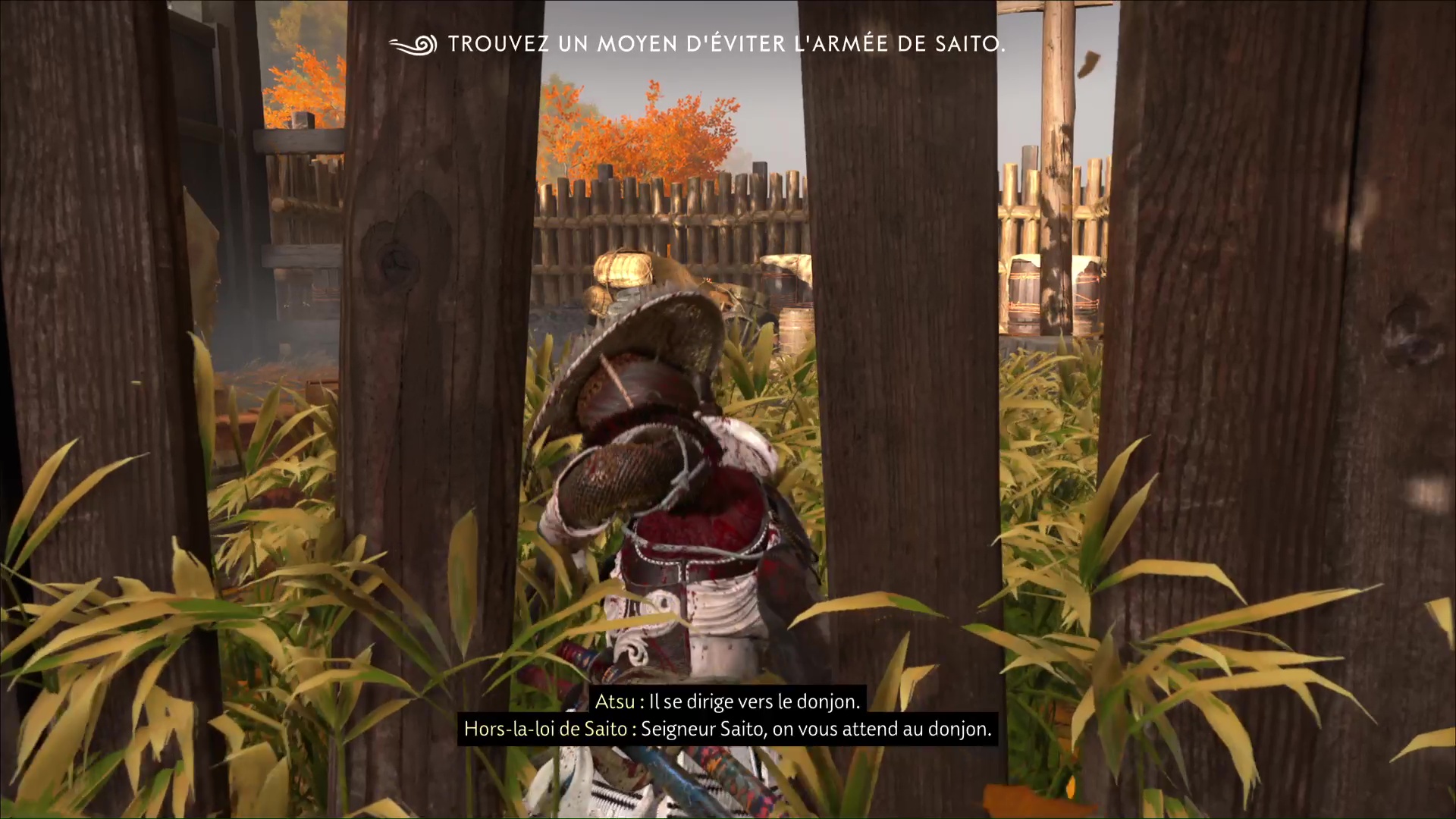 Descendez l’escalier et avancez en restant caché par le tas de bois et le tissu. Depuis l’herbe haute un poil plus loin, grimpez le rocher et ne tardez pas à avancer sous peine d’être repéré. Devant vous, une nouvelle brèche dans la barrière par laquelle vous pouvez passer.