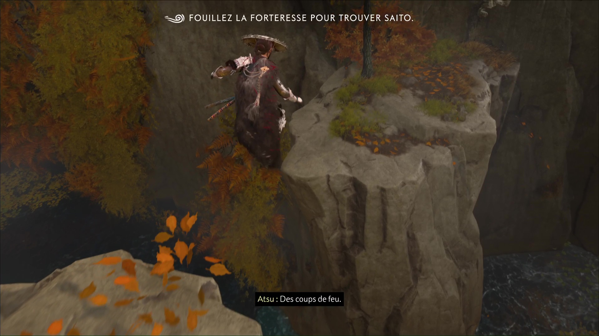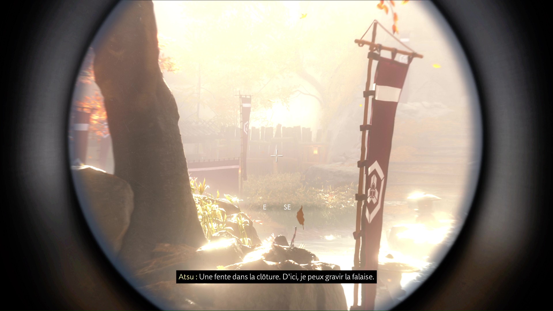 De là où elle est, elle aperçoit Saito. Sortez ensuite la longue-vue et observez la porte direction sud-est. Décalez ensuite légèrement à gauche, au pied des escaliers, pour apercevoir une fente dans la clôture. Atsu tombe ensuite en contrebas.