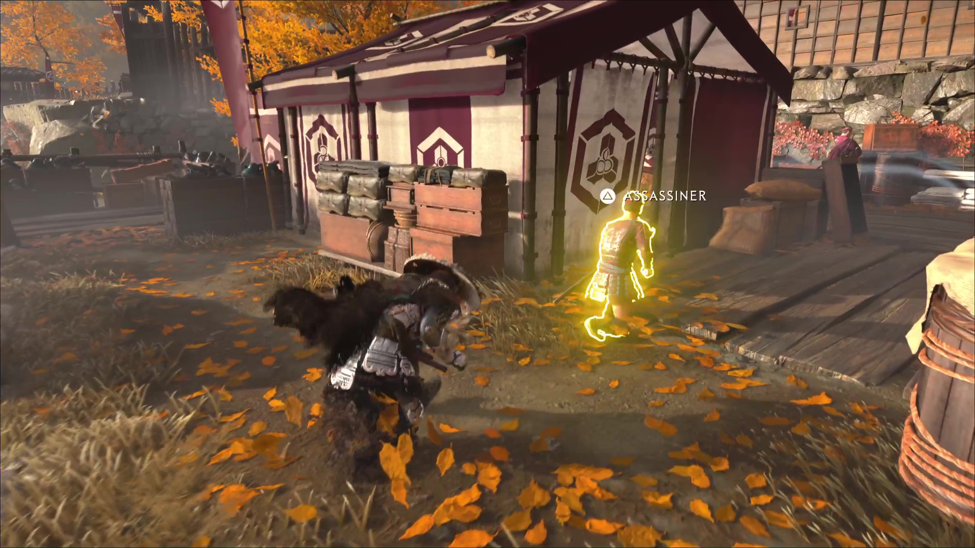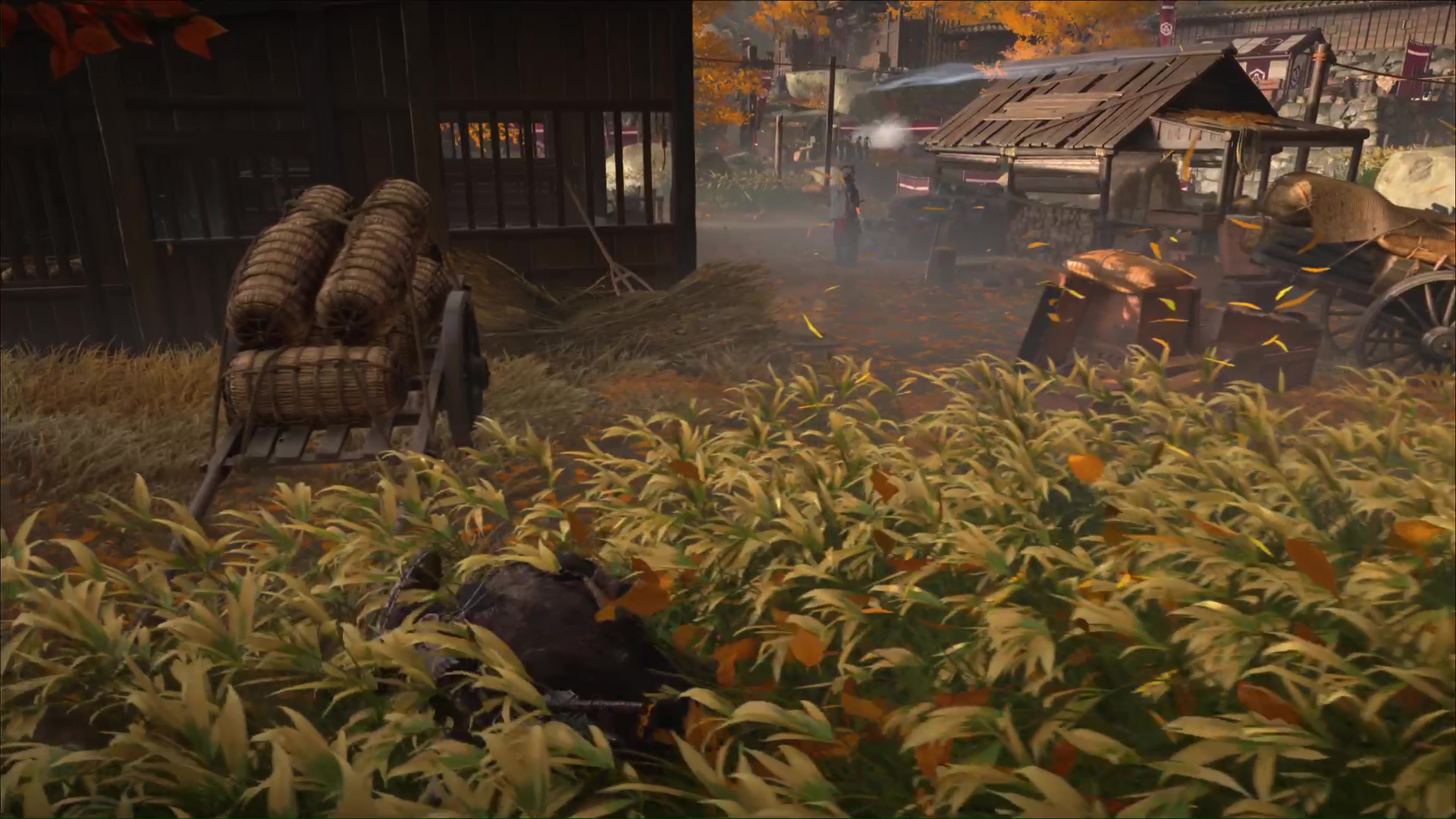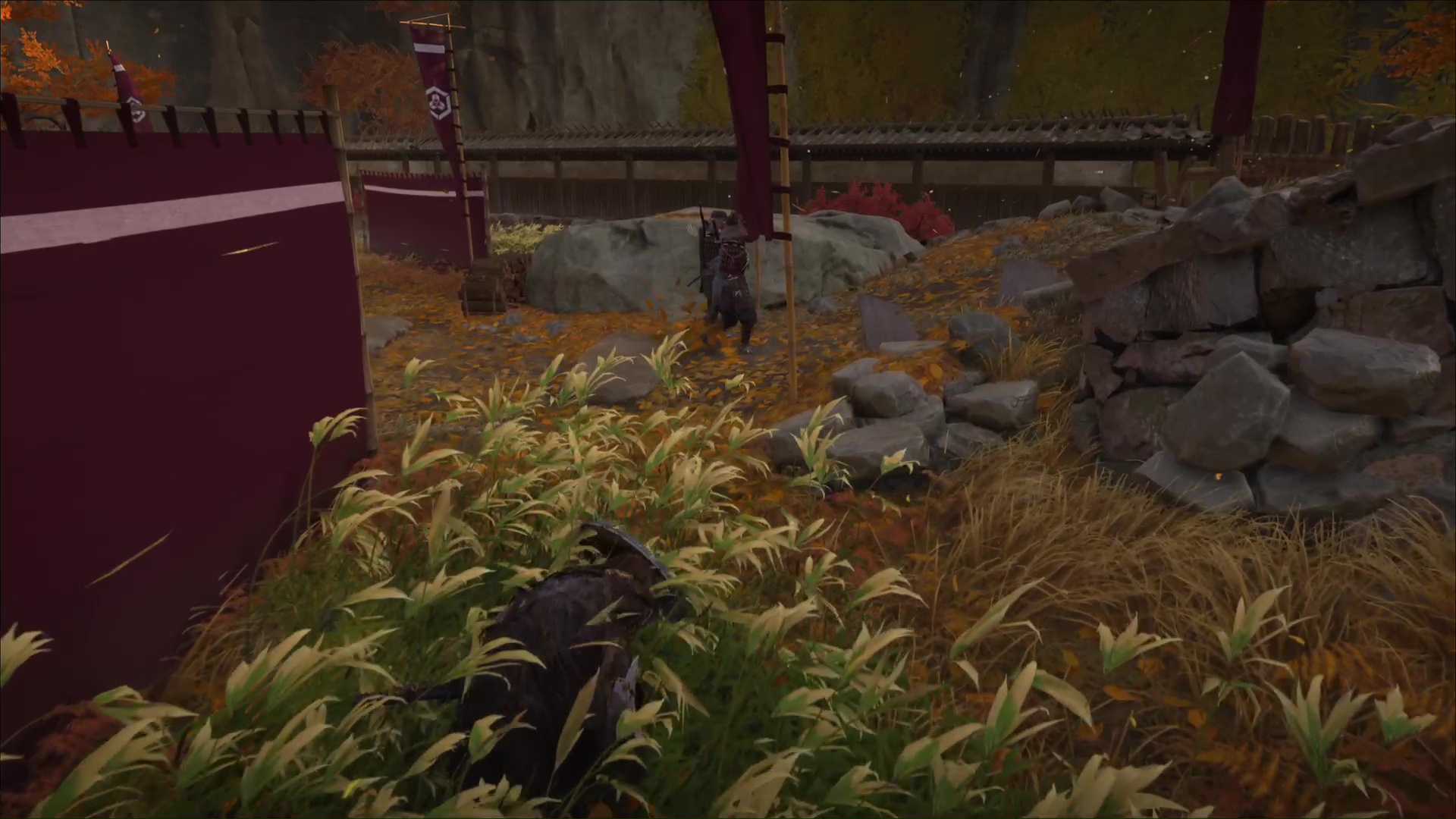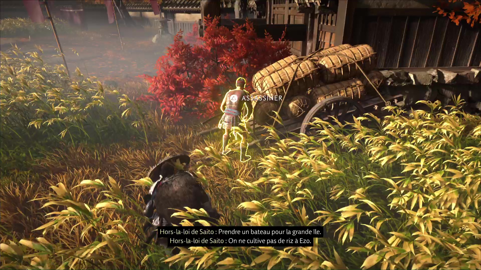 Assassinez un premier garde près du chariot de paniers de riz, puis avancez dans les herbes en vous arrêtant avant le pont. Laissez le grand costaud rejoindre deux autres soldats puis allez dans les herbes en face en rasant le pont.