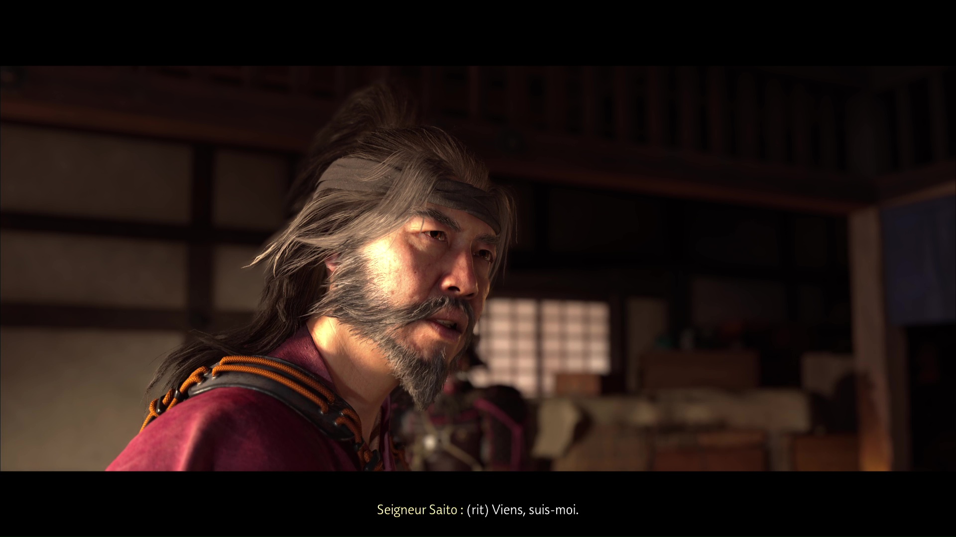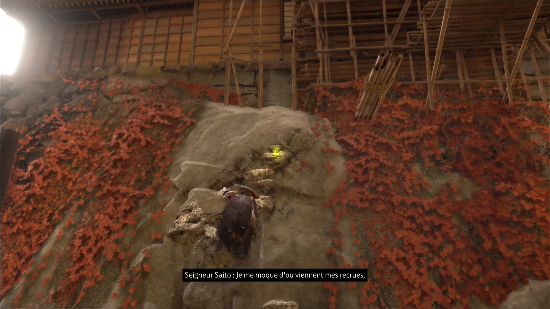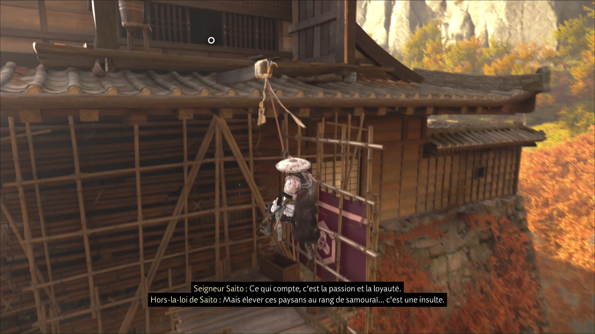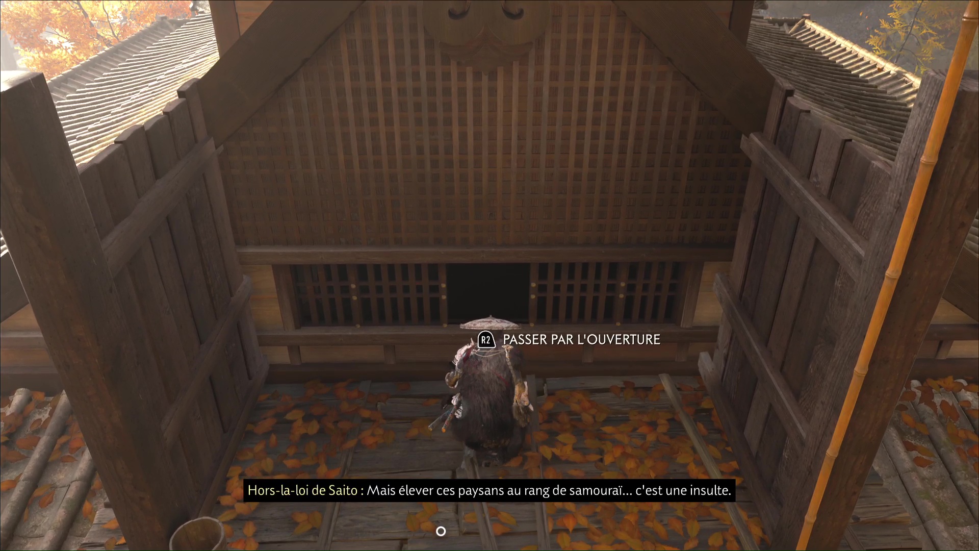 Vous voici juste au-dessus Saito. Assassinez-le. Hélas, il a senti le coup venir et esquive Atsu. Il ramasse ensuite le sabre et comprend alors qu’il a en face de lui la fille du forgeron. Il décide alors d’aller dehors et invite Atsu à le suivre.