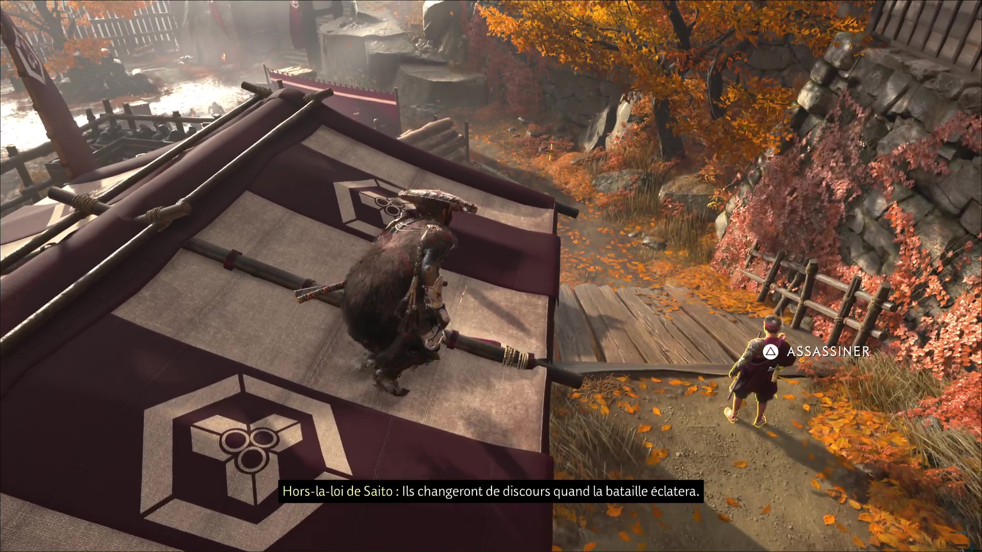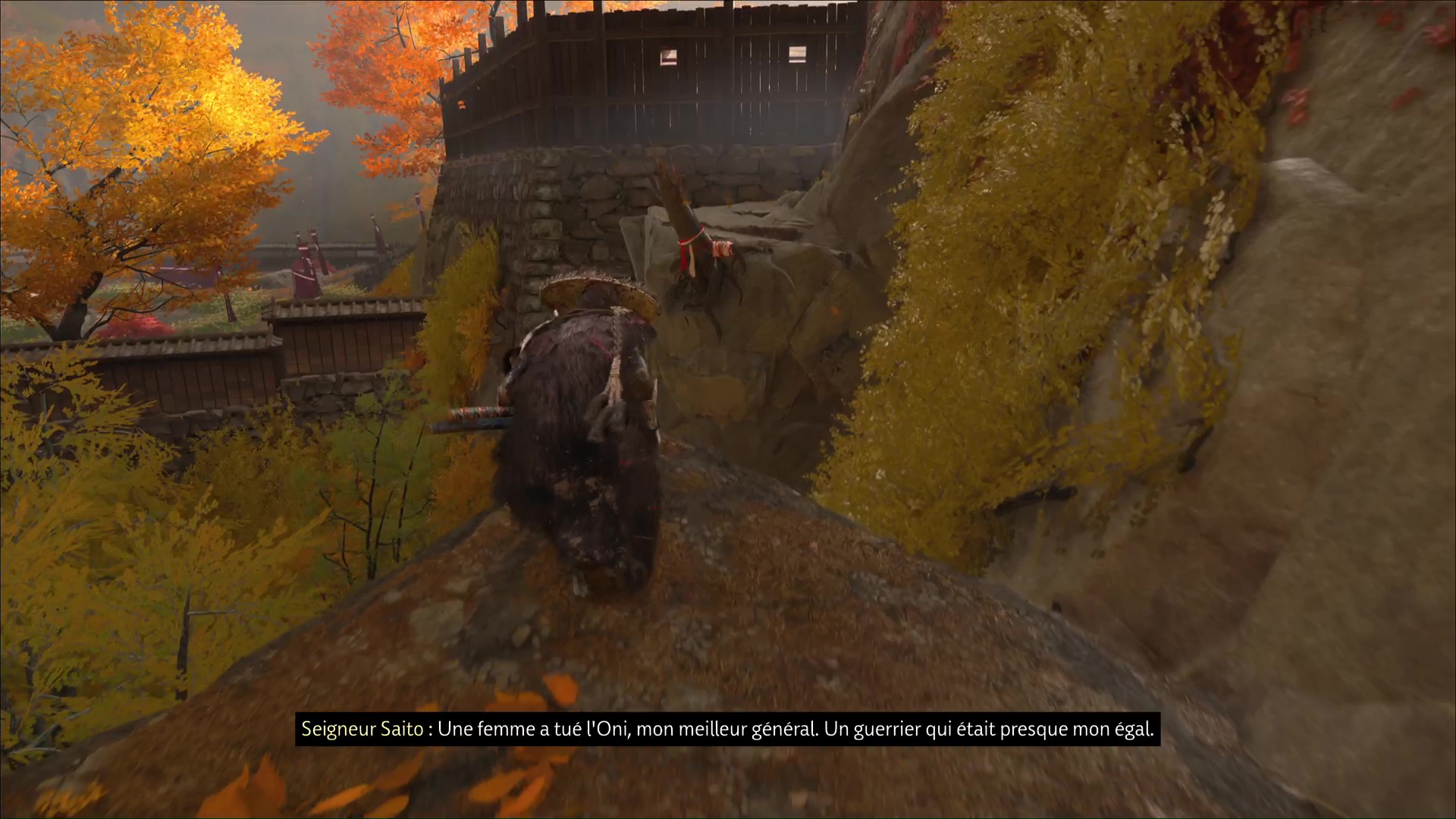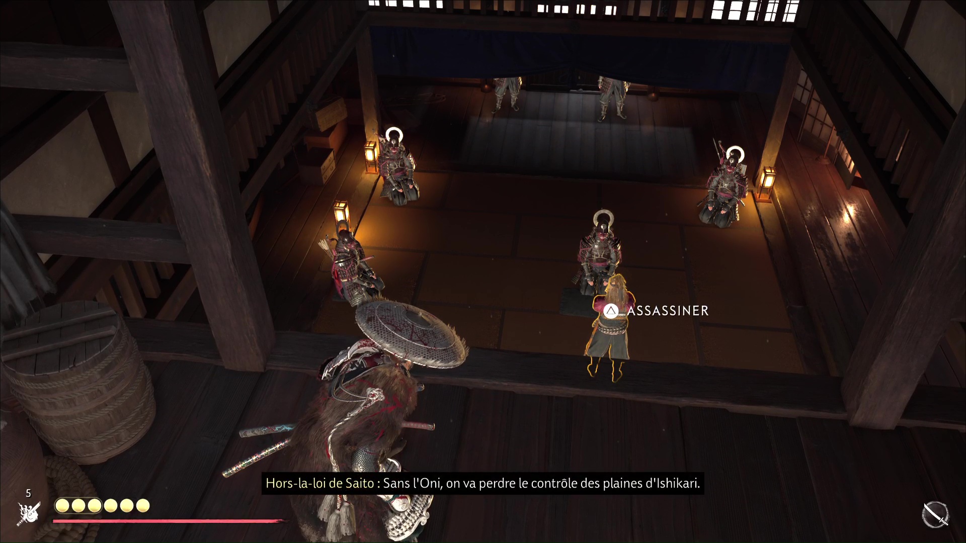 Vous voici juste au-dessus Saito. Assassinez-le. Hélas, il a senti le coup venir et esquive Atsu. Il ramasse ensuite le sabre et comprend alors qu’il a en face de lui la fille du forgeron. Il décide alors d’aller dehors et invite Atsu à le suivre.