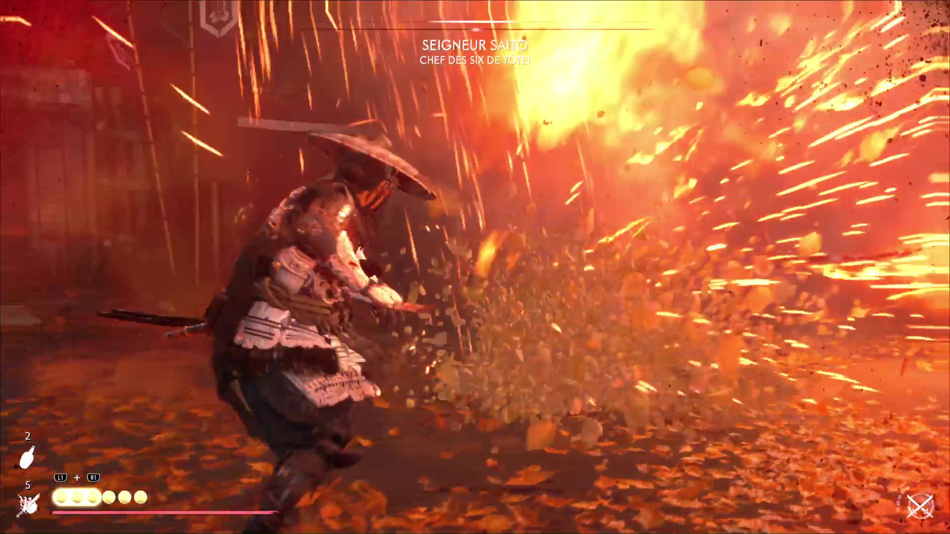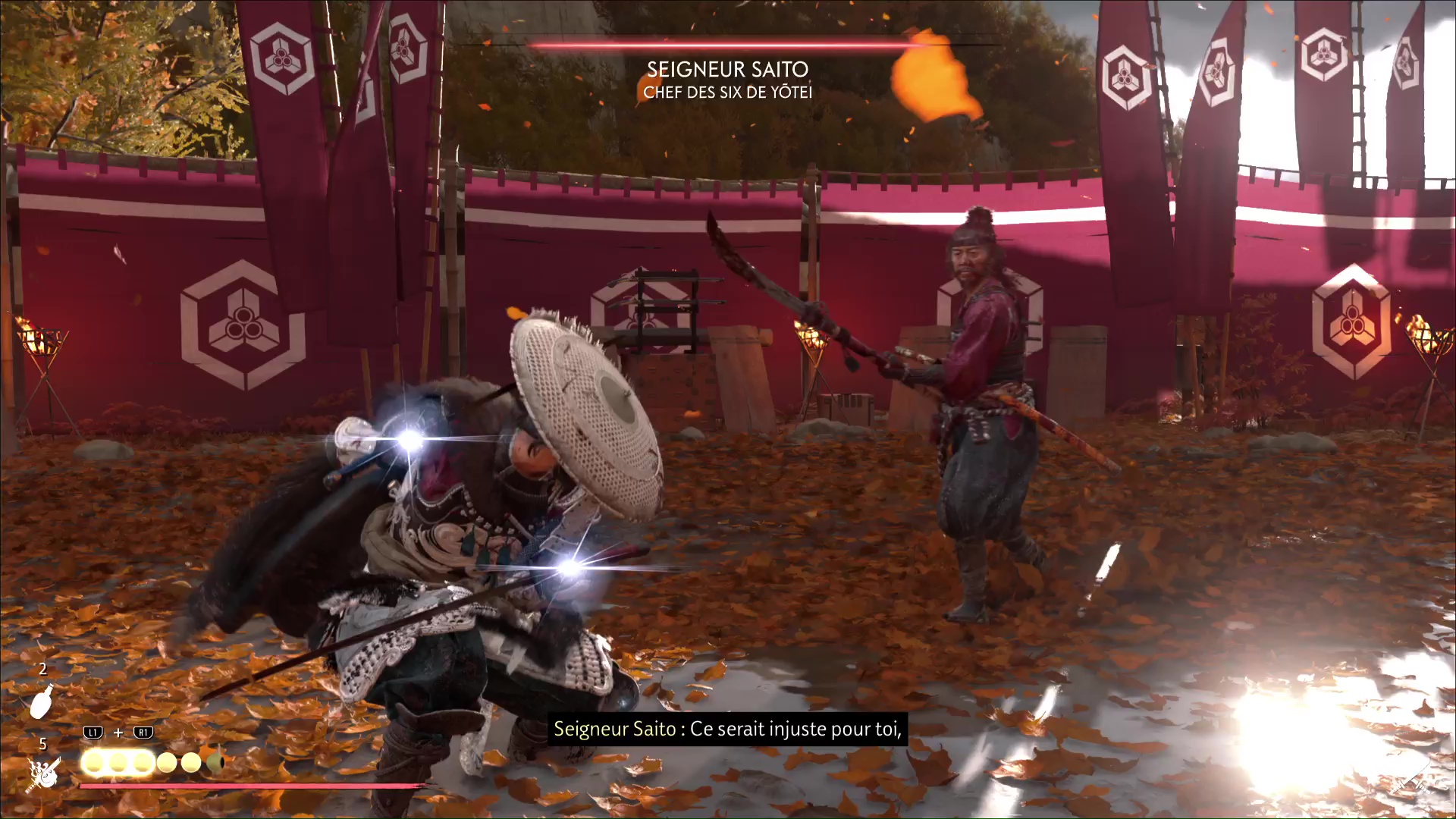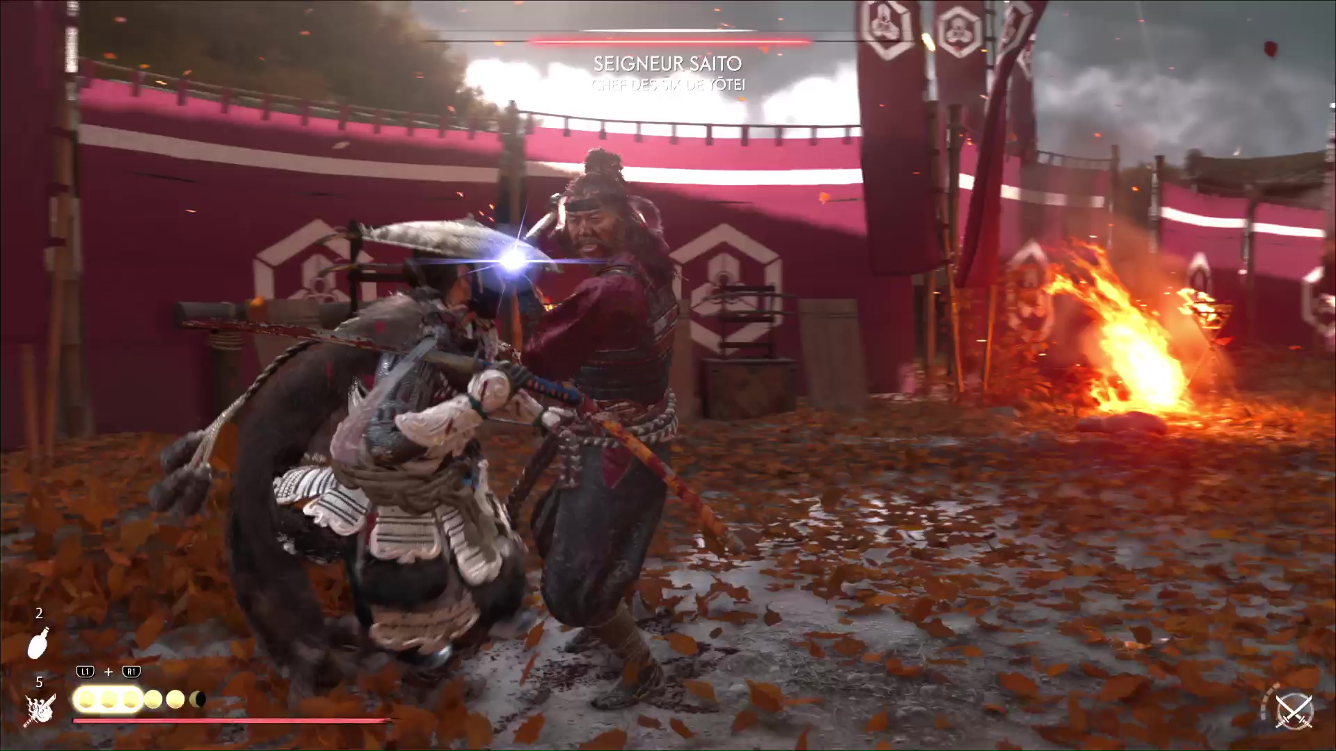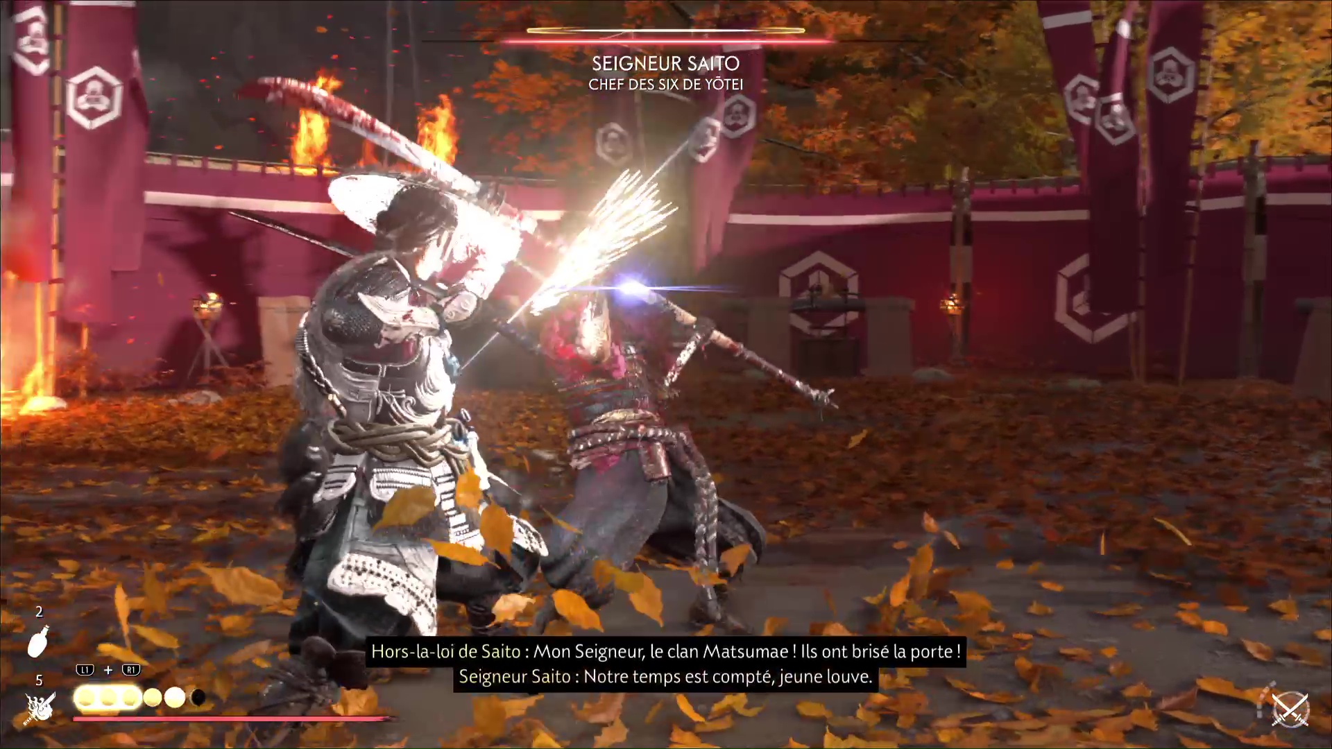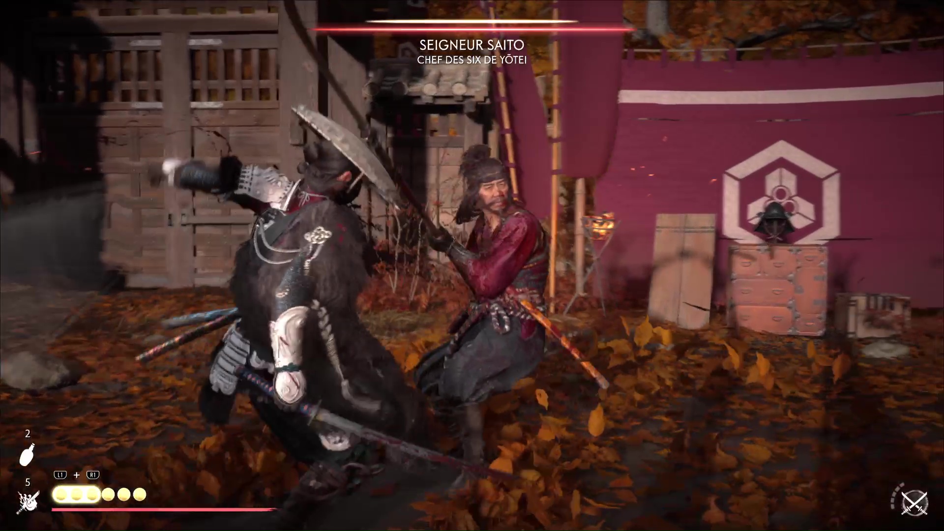 Et au bout d’une petite discussion entre Saito et Atsu, le combat se lance. Saito démarre fort en portant une lance et en enchaînant les attaques bleues. Sortez les doubles katanas face à votre adversaire pour garder l’avantage de l’arme.