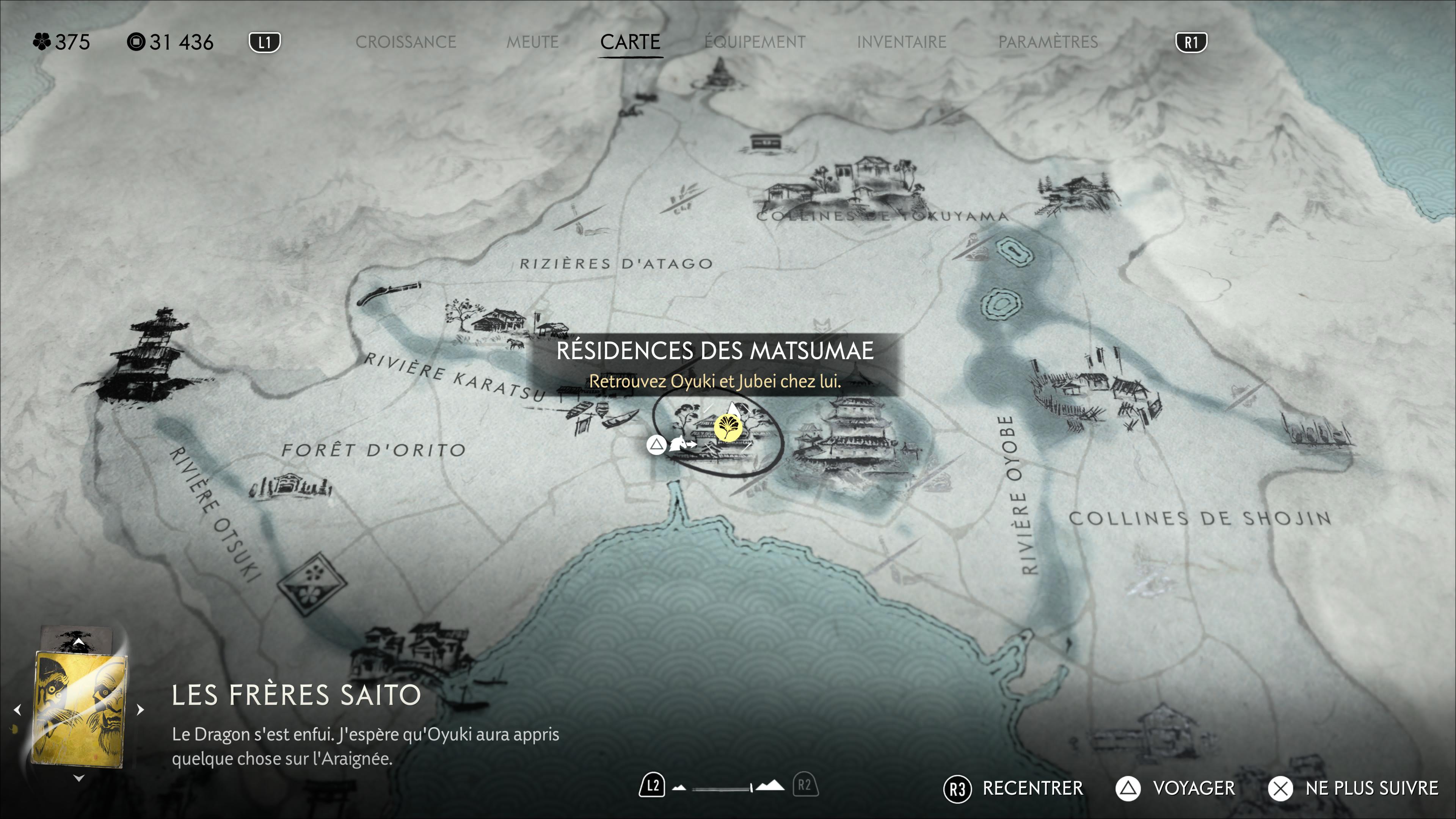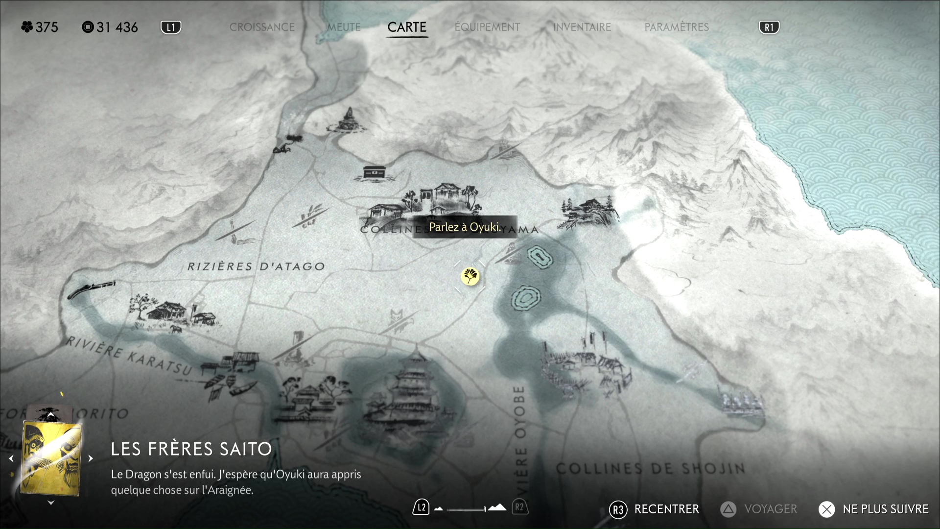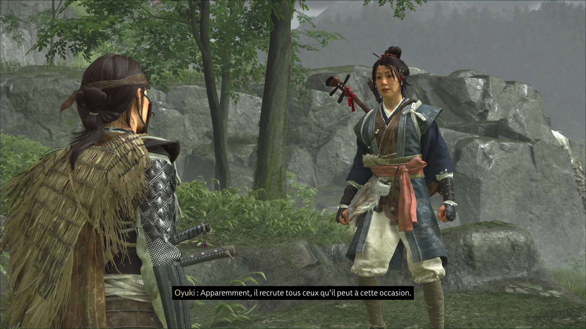 Suivez le repère qui se trouve au nord du château des Matsumae, pour y trouver Oyuki. Elle vous informe que l’Araignée prépare une sorte de spectacle, et il recrute presque n’importe qui pour y participer. Ce serait donc votre chance de l’approcher.