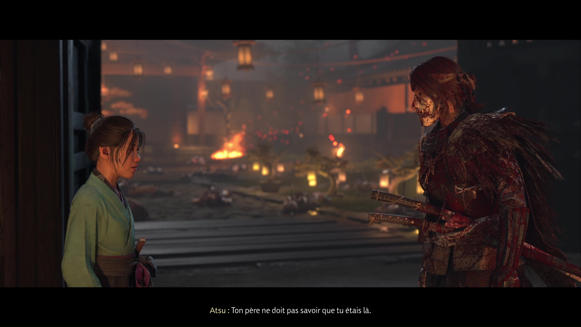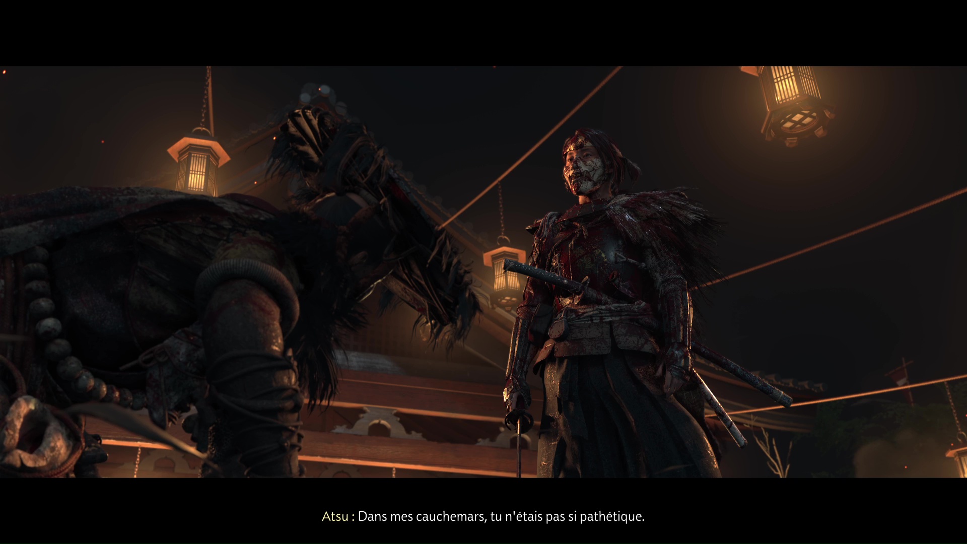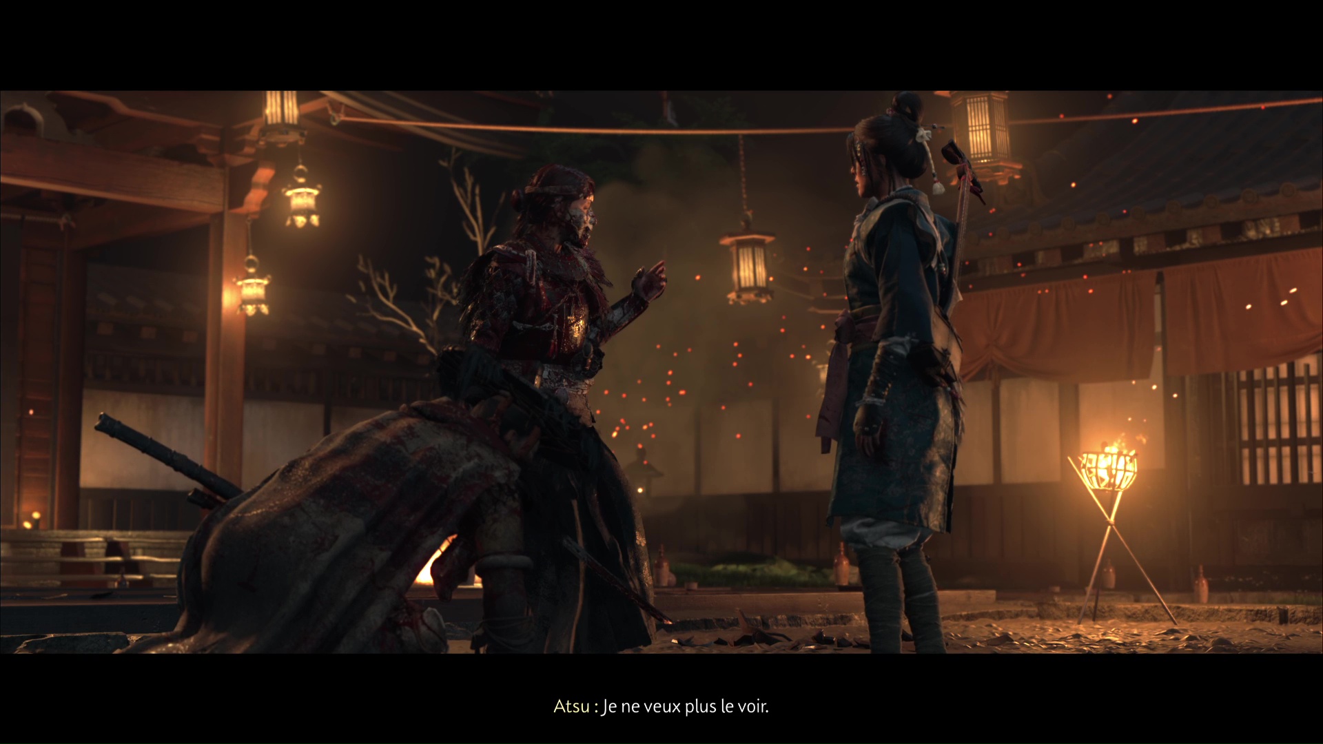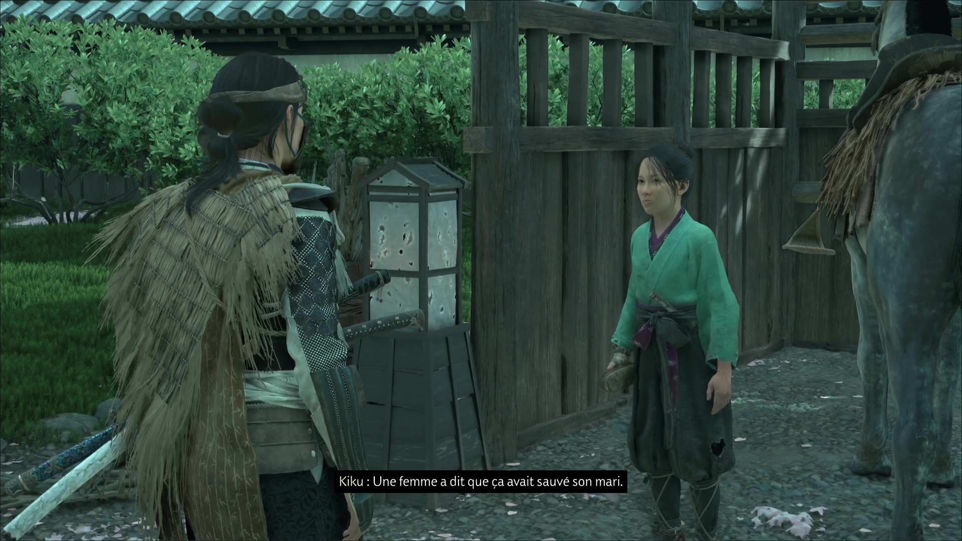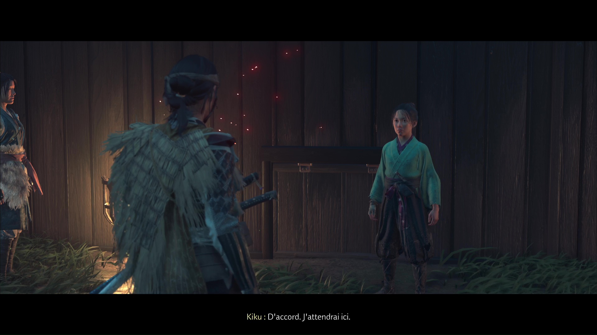 Atsu quitte les lieux et croise Kiku dehors. Elle voit sa tante remplit de sang, et la sachant devant cette vision, Atsu lui conseille de partir. La quête se termine et l’armure de l’onryō, terrifier l’ennemi et l’appel de la louve sont améliorés. Prochaine quête : « Meute de loups ».