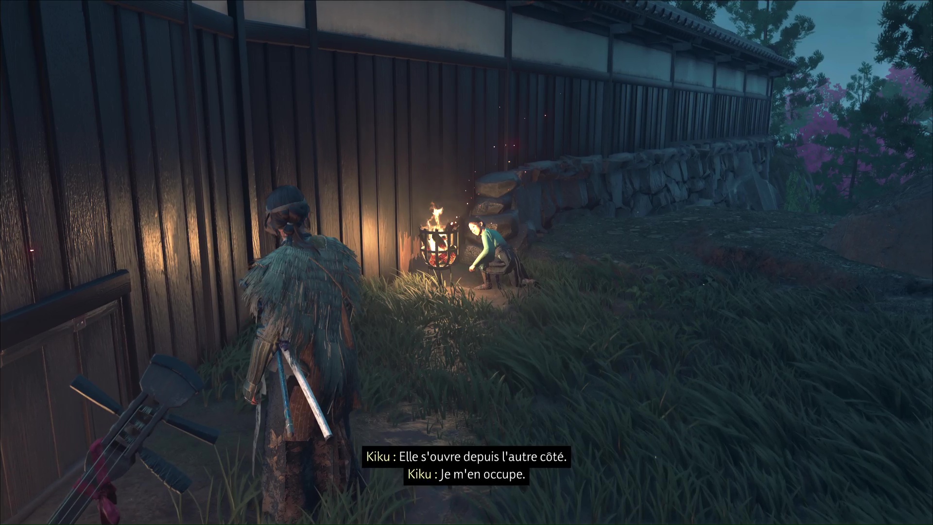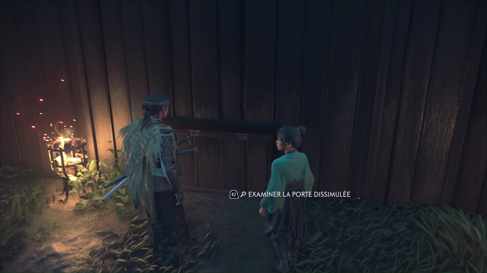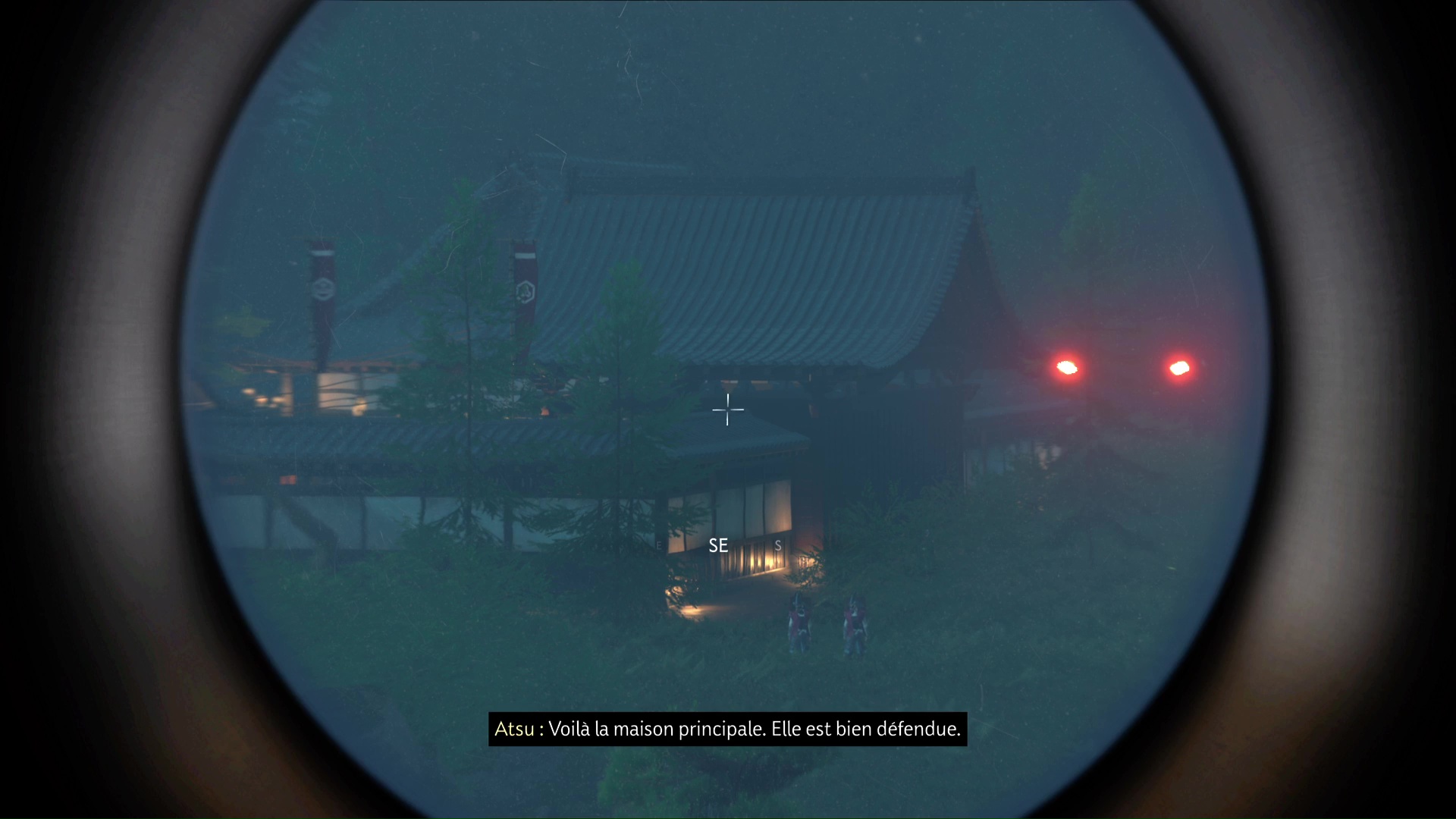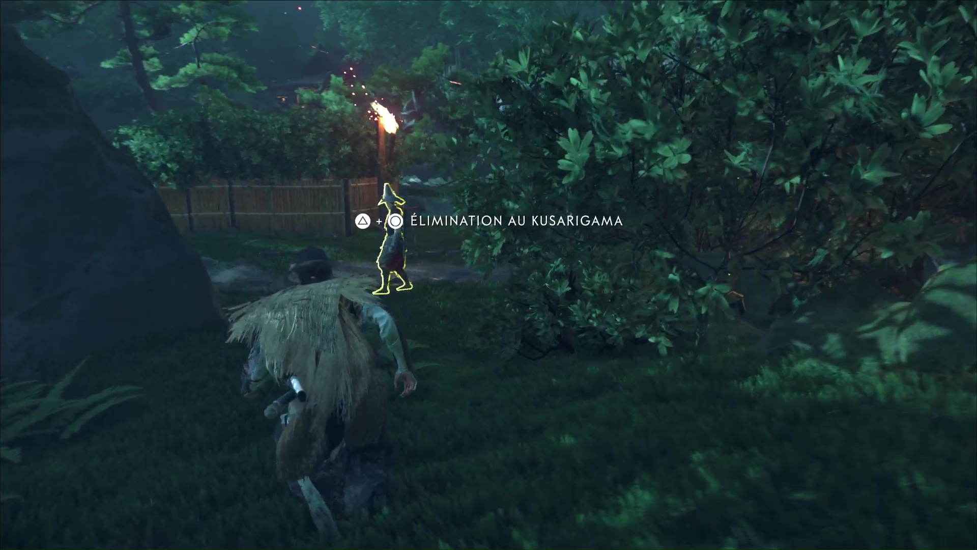 Attendez patiemment qu’elle vous retourne le dos et assassinez-la discrètement le plus vite possible. Continuez pour apercevoir deux gardes près d’un feu. Avant de vous en prendre à eux, attendez que la patrouille sur votre droite s’éloigne le plus loin possible. Dès que c’est bon, et toujours avec le kusarigama et cette fois l’aide d’Oyuki, assassinez à distance le duo de gardes près du feu.