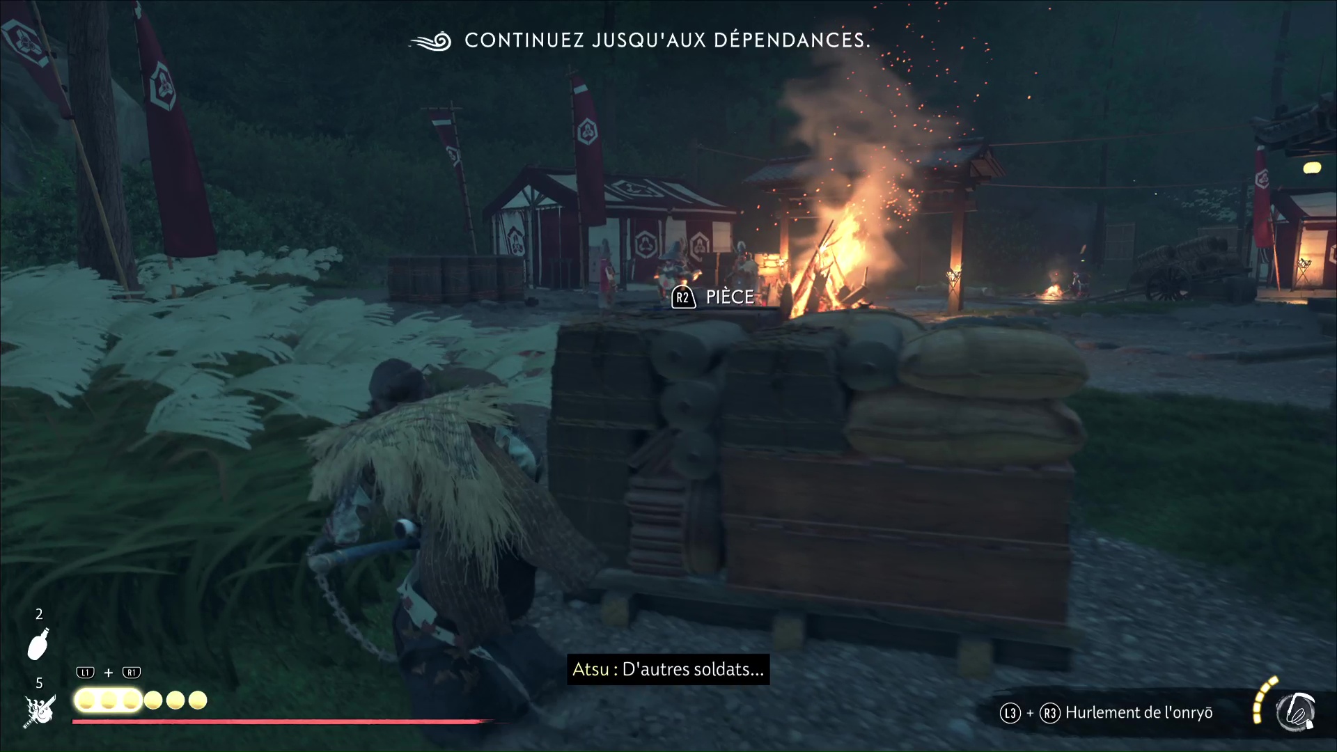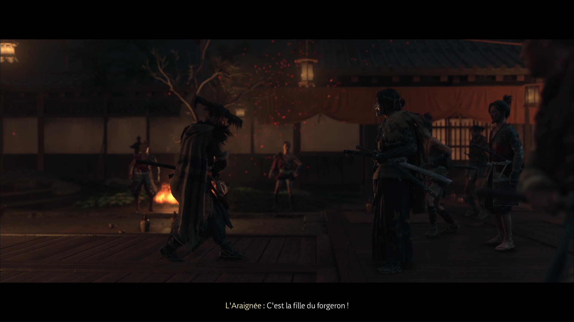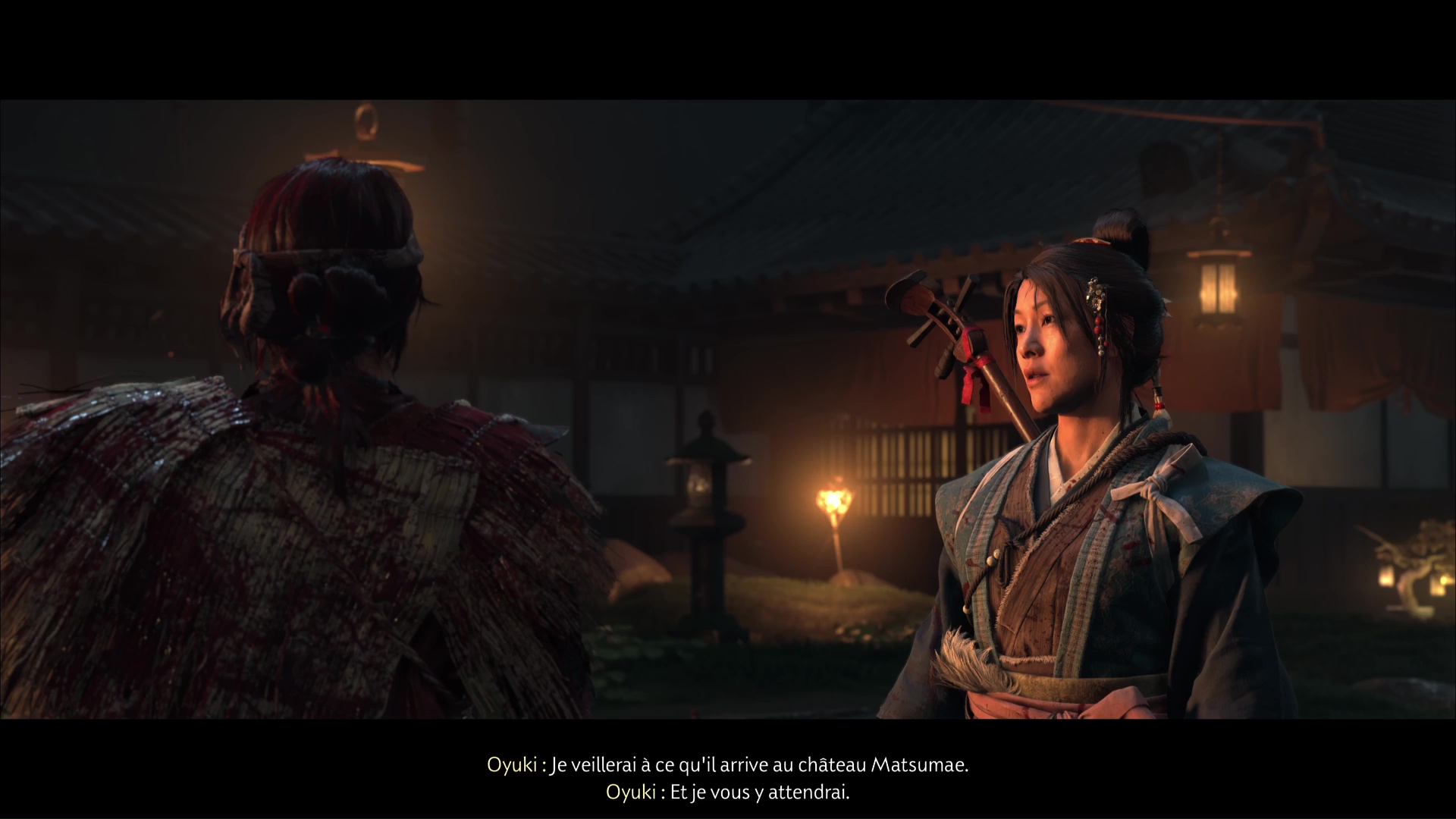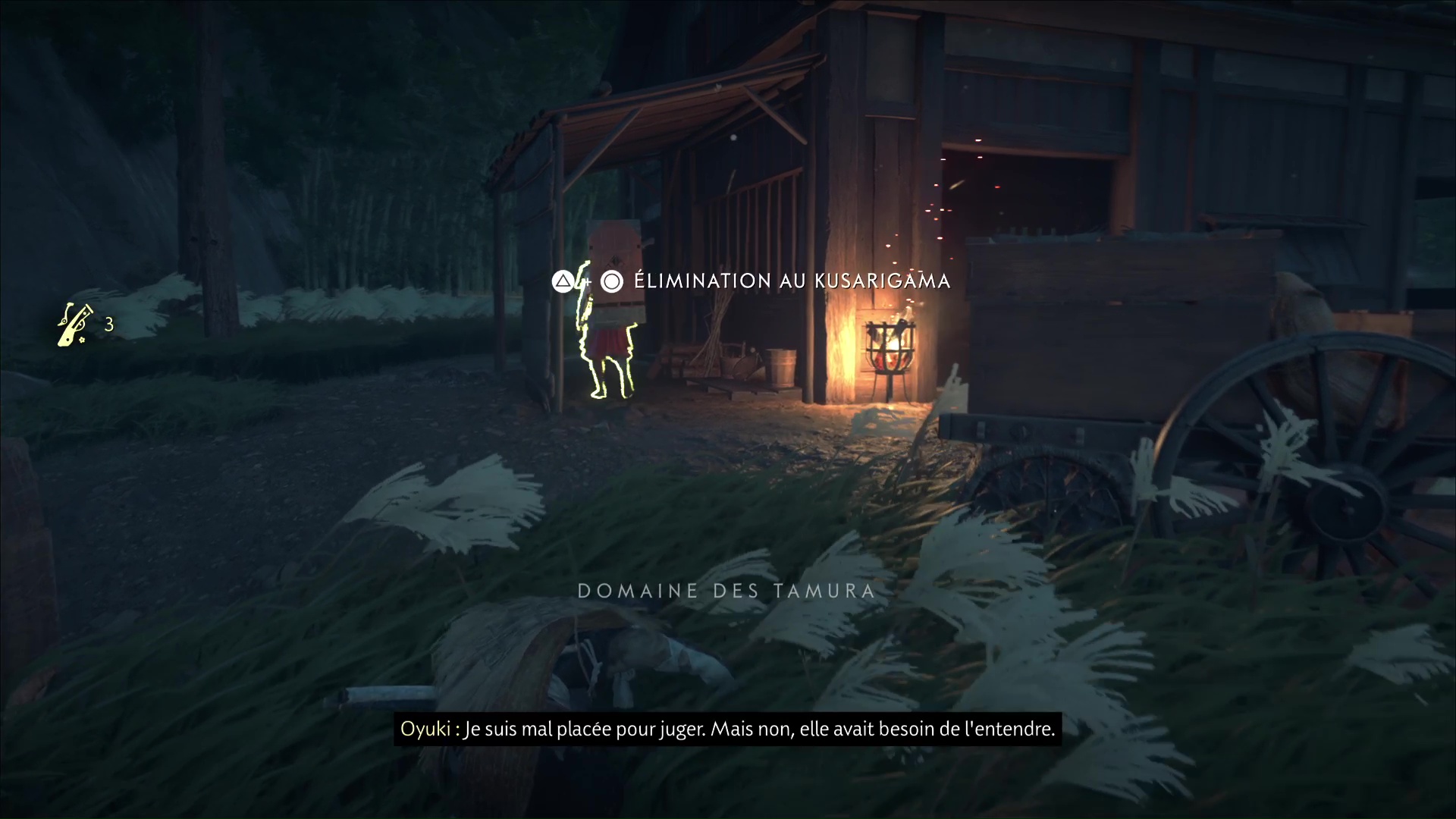 Attendez patiemment qu’elle vous retourne le dos et assassinez-la discrètement le plus vite possible. Continuez pour apercevoir deux gardes près d’un feu. Avant de vous en prendre à eux, attendez que la patrouille sur votre droite s’éloigne le plus loin possible. Dès que c’est bon, et toujours avec le kusarigama et cette fois l’aide d’Oyuki, assassinez à distance le duo de gardes près du feu.