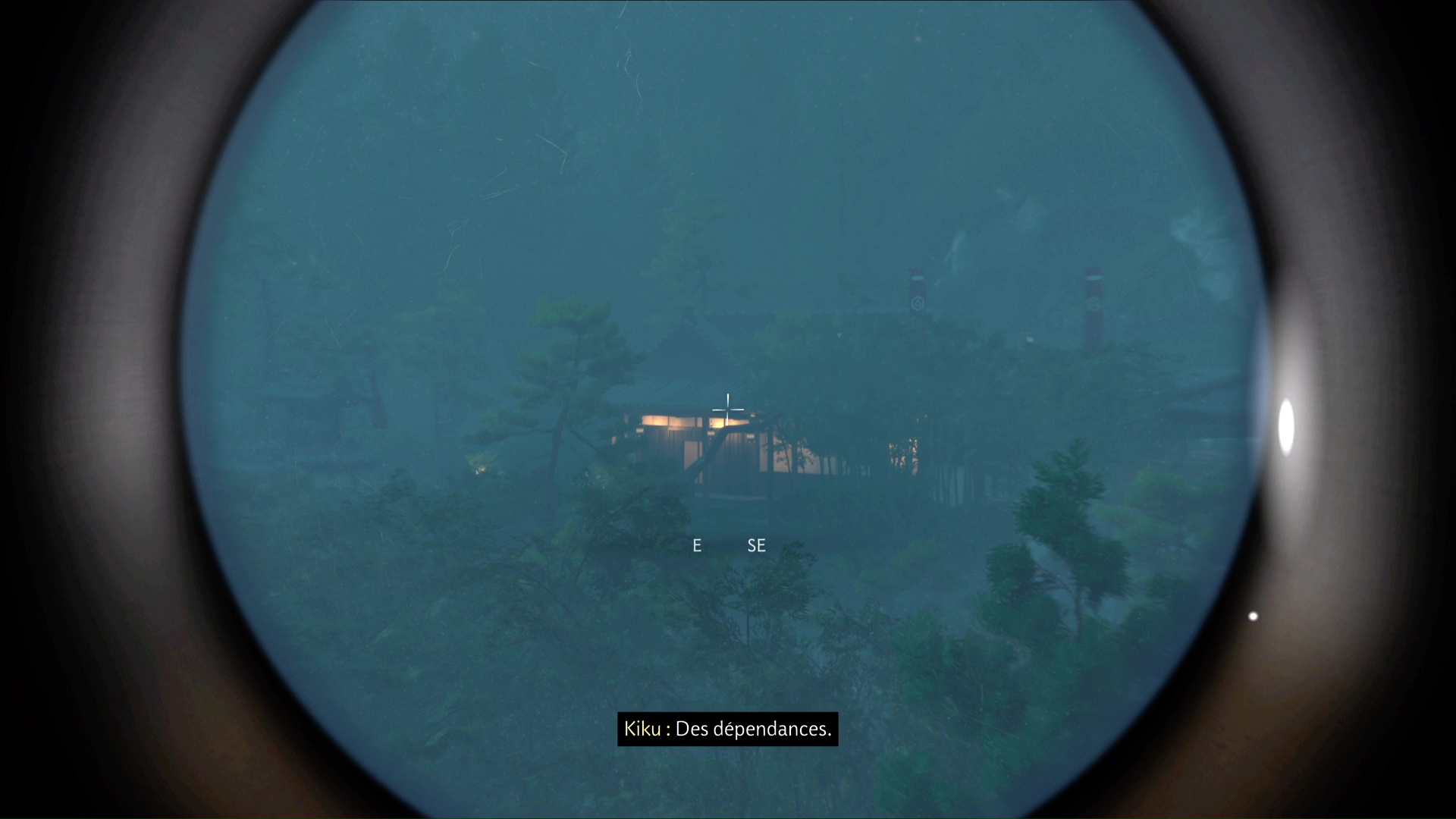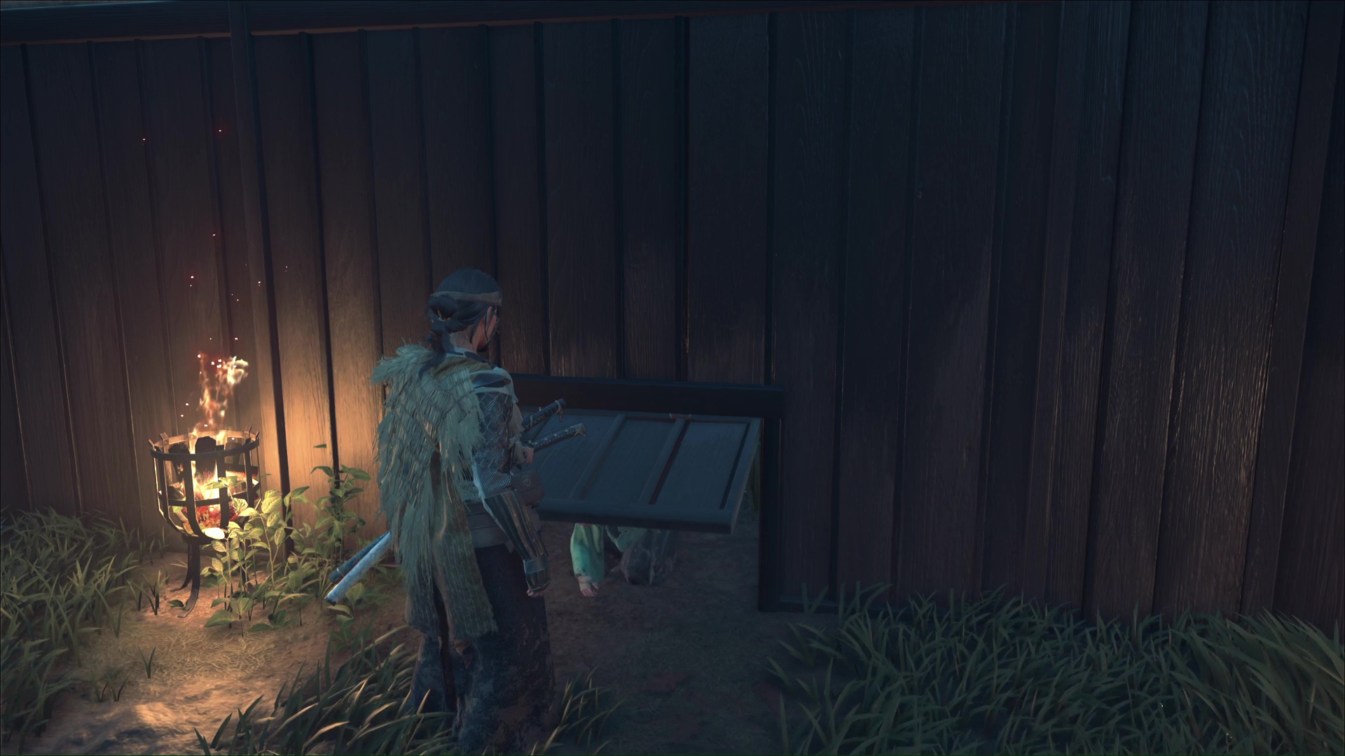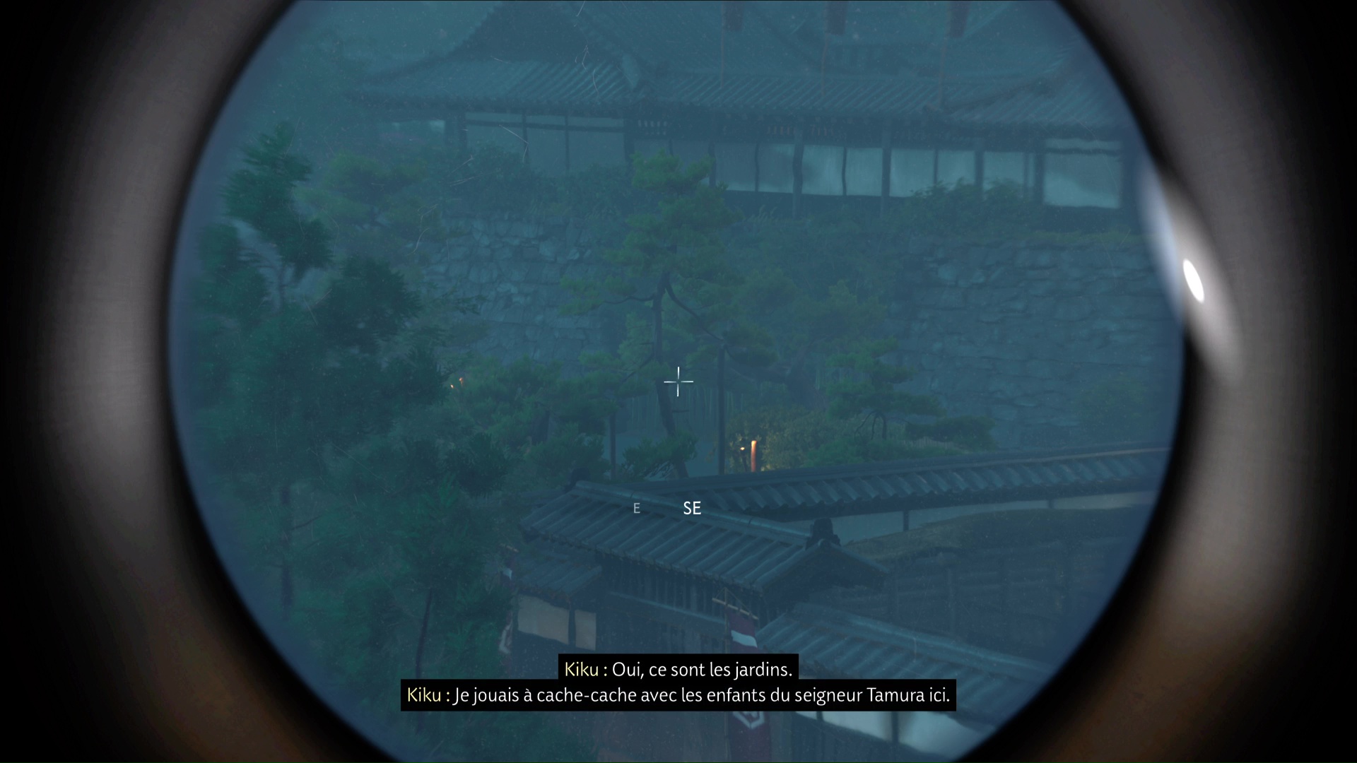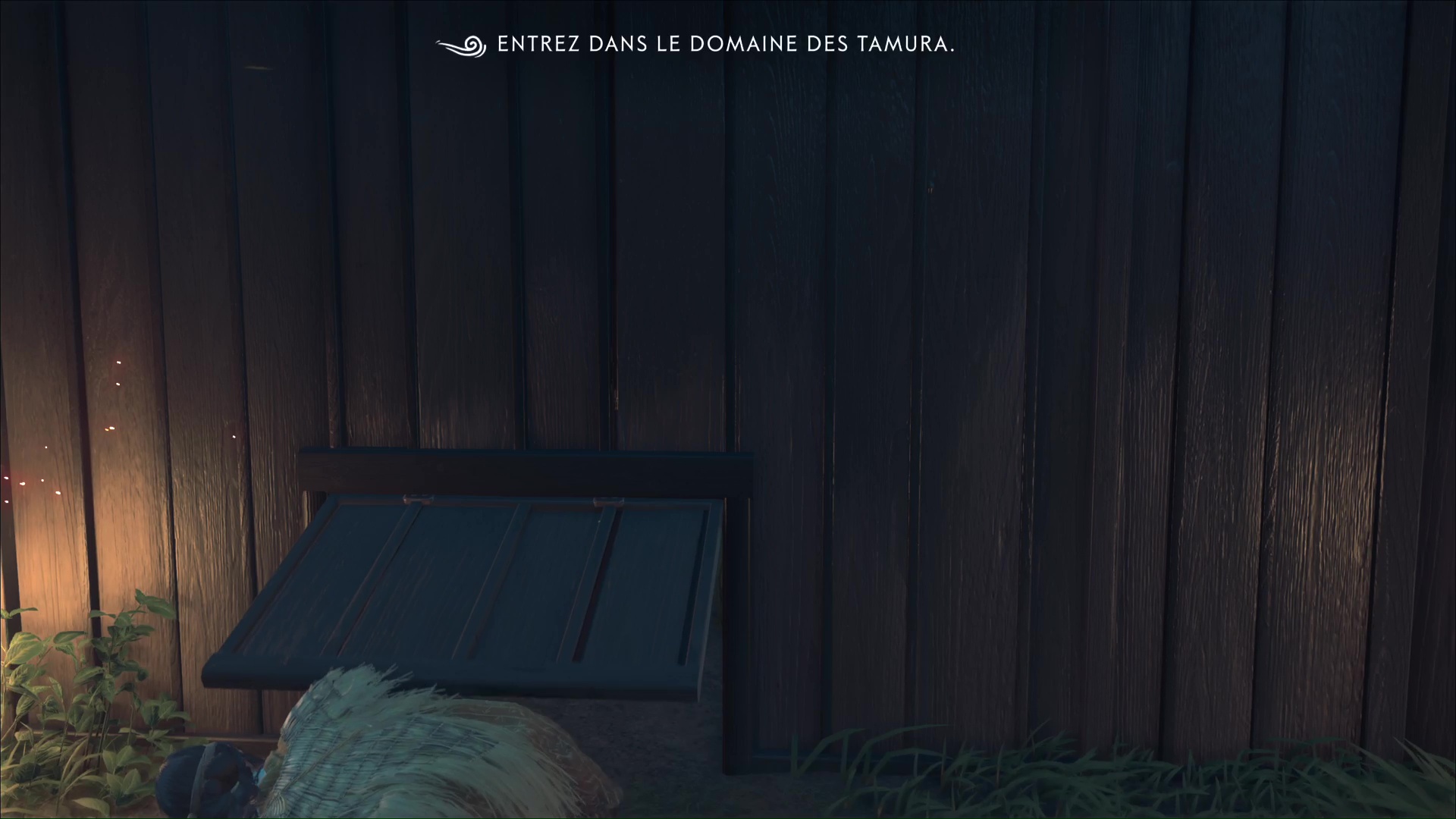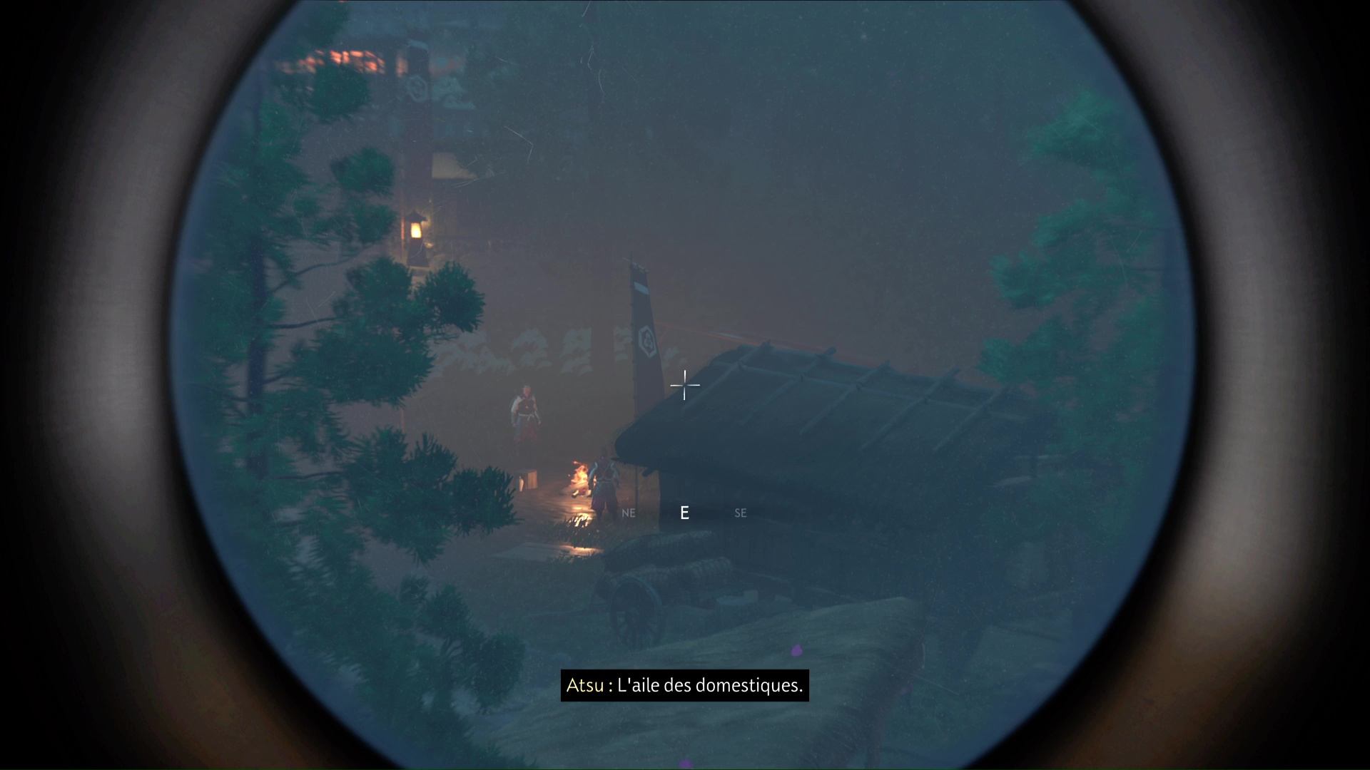 Vous n’aurez plus qu’à jeter un œil, à l’est, à l’aile des domestiques, votre point d’entrée. Kiku vous y emmène. Glissez le long de la pente, franchissez le pont permis par un arbre couché et montez le petit chemin menant à une trappe secrète, hélas fermée depuis l’autre côté.