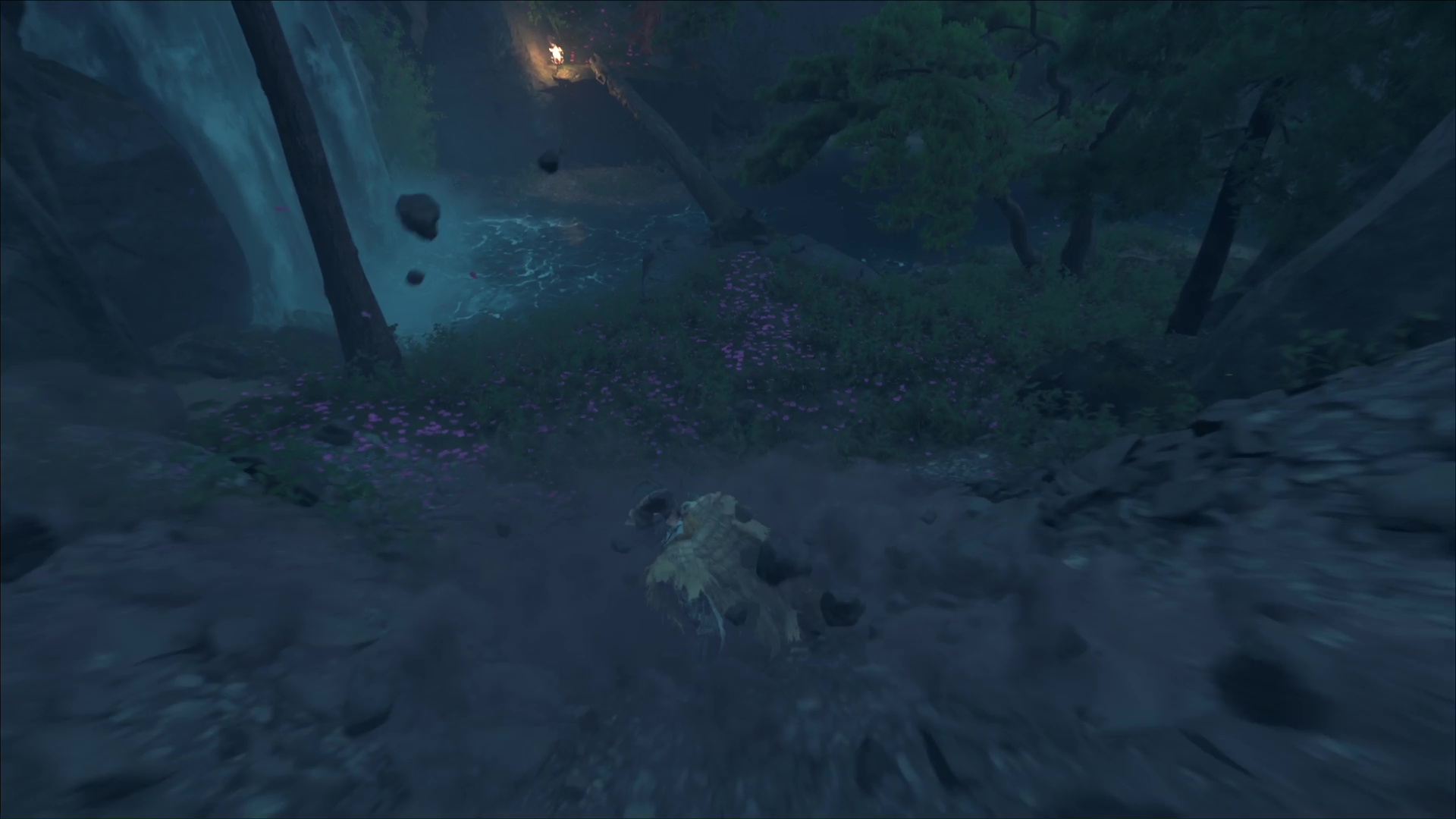 Allez pile en face vers la rivière et serrez à droite en progressant dans les hautes herbes. Longez la cascade et rejoignez de nouvelles hautes herbes.
