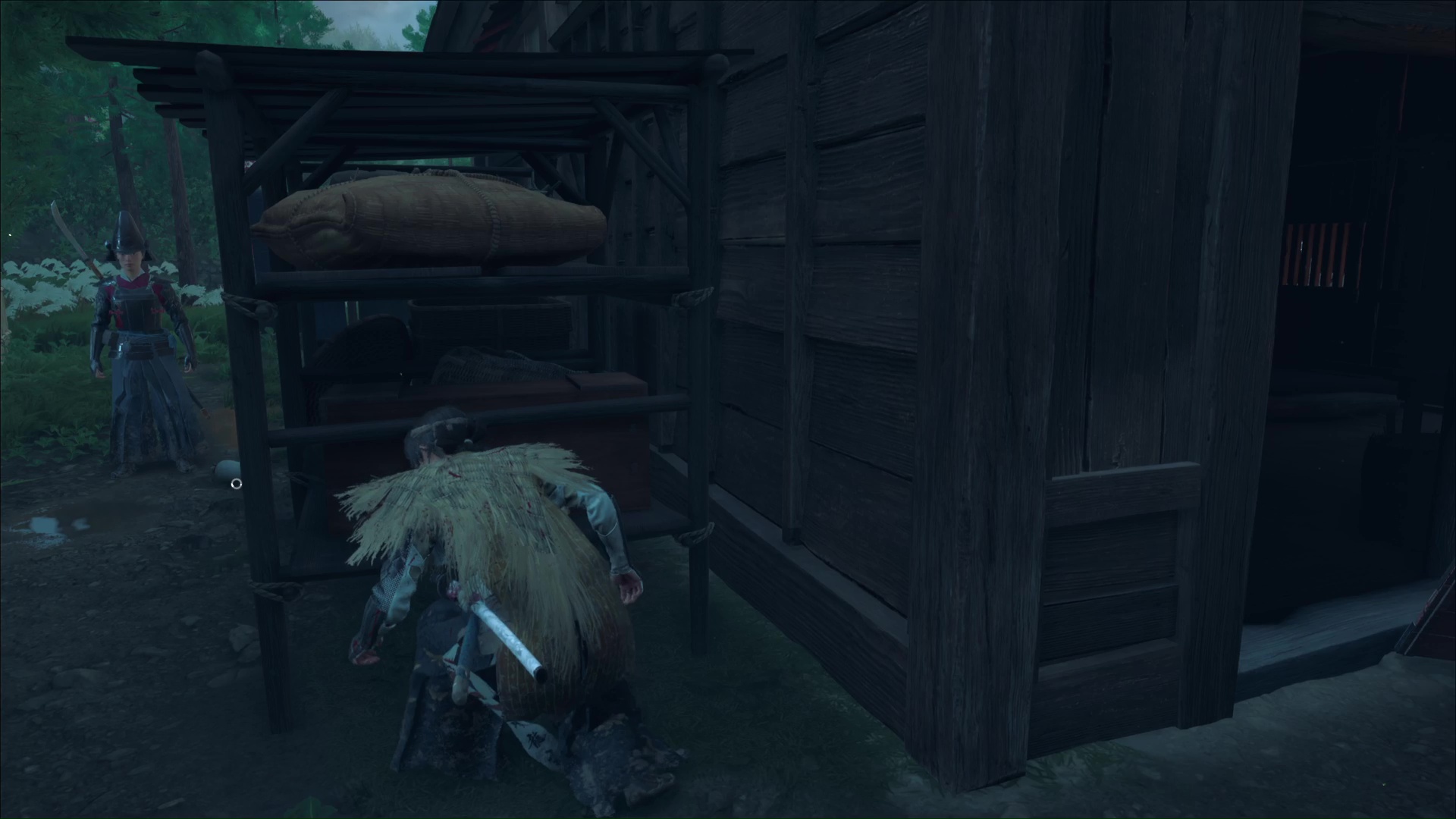 À présent, entrez par la trappe. De l’autre côté, vous serez dans des herbes hautes. Dès le passage d’un garde, et si vous avez le kusarigama et la bonne compétence, assassinez-le à distance. Avancez tout en restant collé à la maison sur votre droite. Caché par des provisions, observez la tireuse en train de patrouiller.