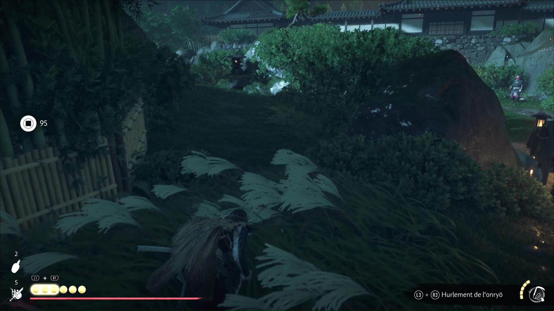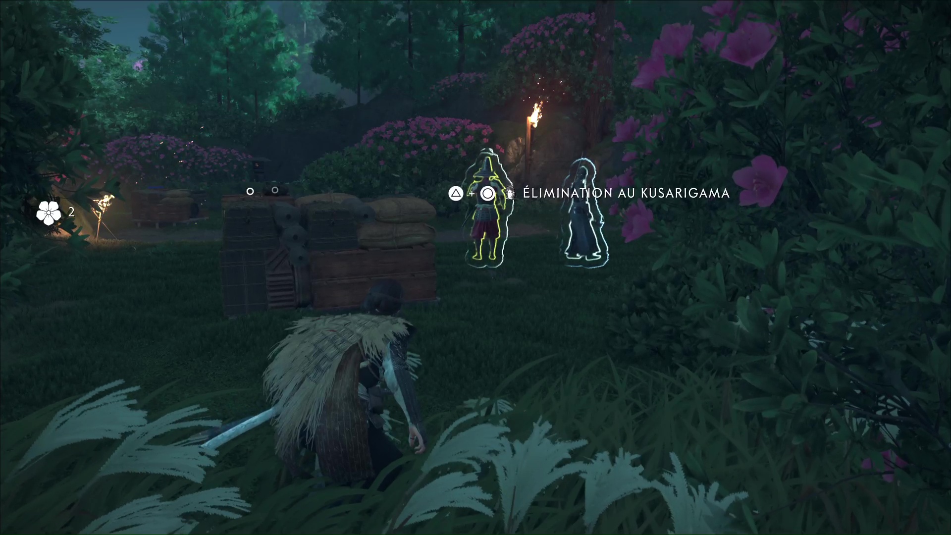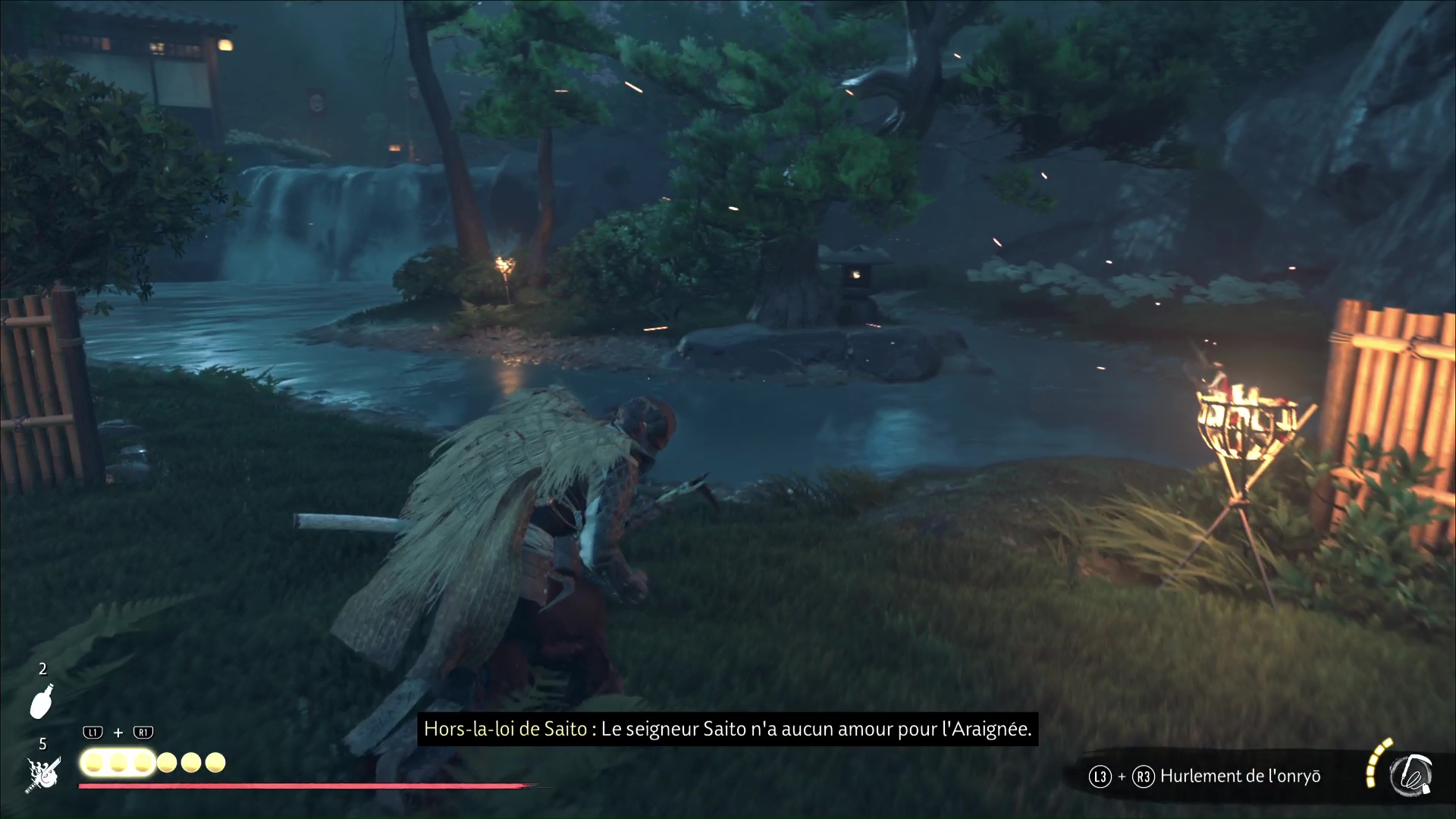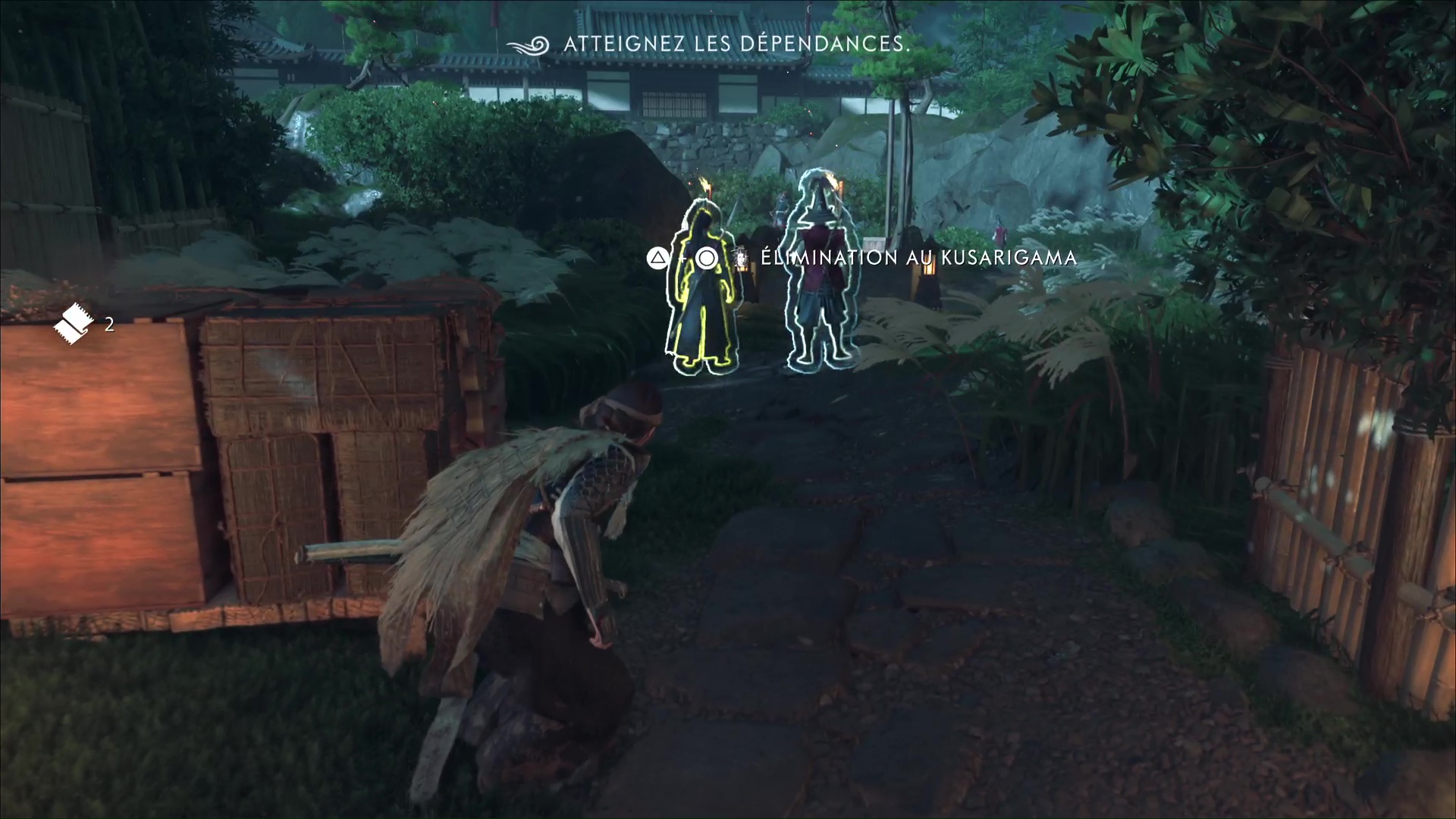 Vous débarquez alors rapidement derrière un duo de gardes. Vous connaissez la démarche, faites un double assassinat au kusarigama pour démarrer tranquillement cette nouvelle zone. Face au pont, prenez le chemin de gauche, au bout duquel un garde patrouille. Un petit coup de kusarigama discret et vous pourrez reprendre votre route.