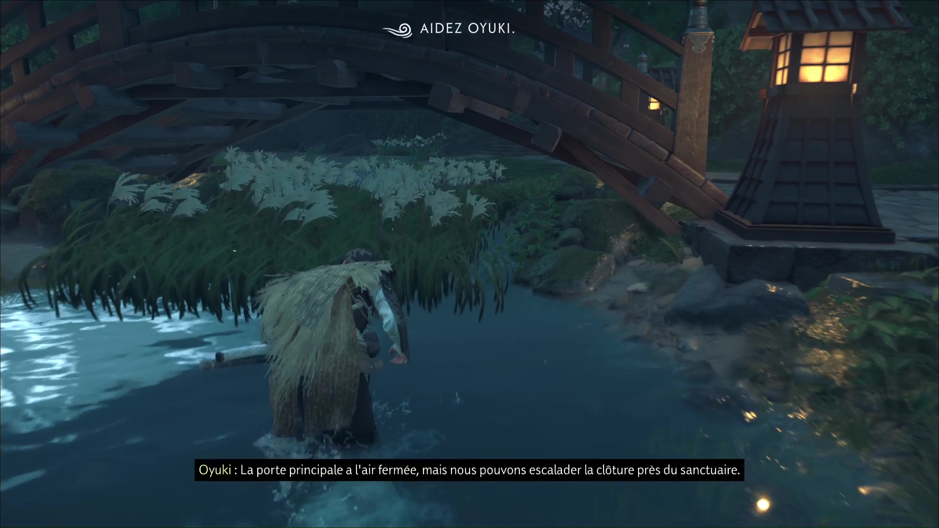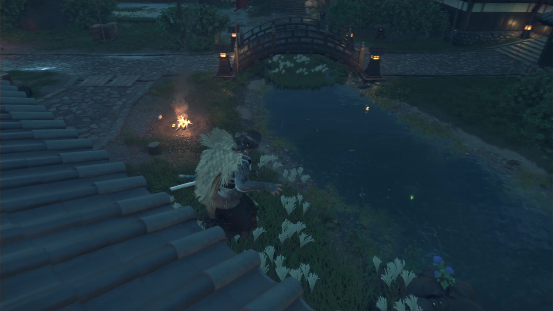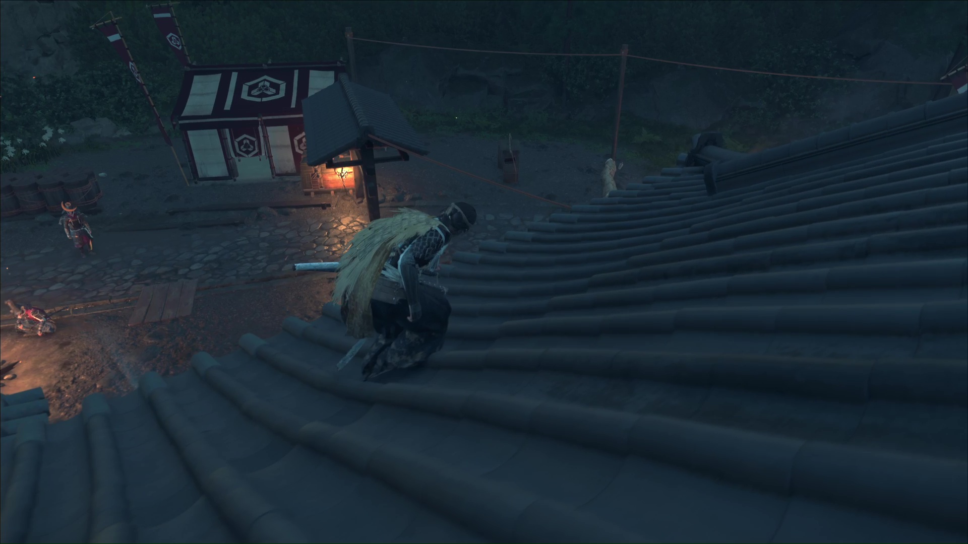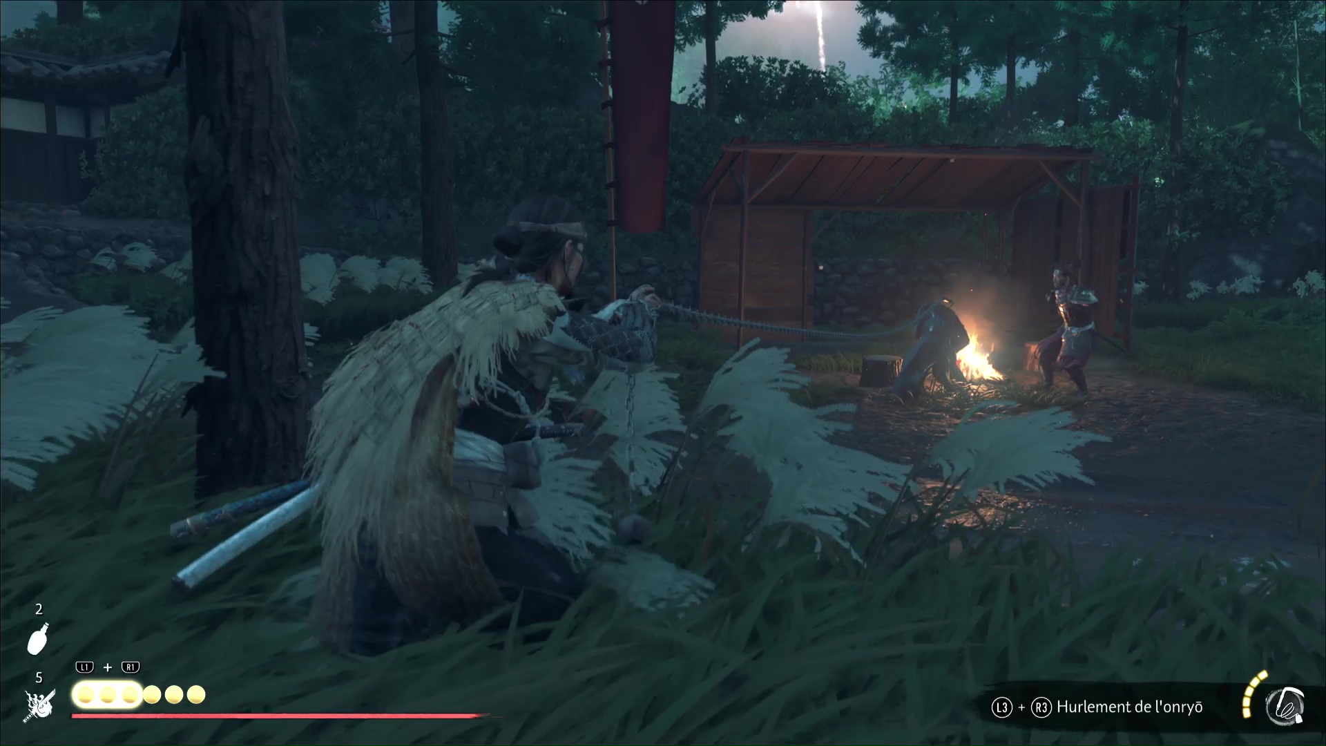 Vous débarquez alors rapidement derrière un duo de gardes. Vous connaissez la démarche, faites un double assassinat au kusarigama pour démarrer tranquillement cette nouvelle zone. Face au pont, prenez le chemin de gauche, au bout duquel un garde patrouille. Un petit coup de kusarigama discret et vous pourrez reprendre votre route.