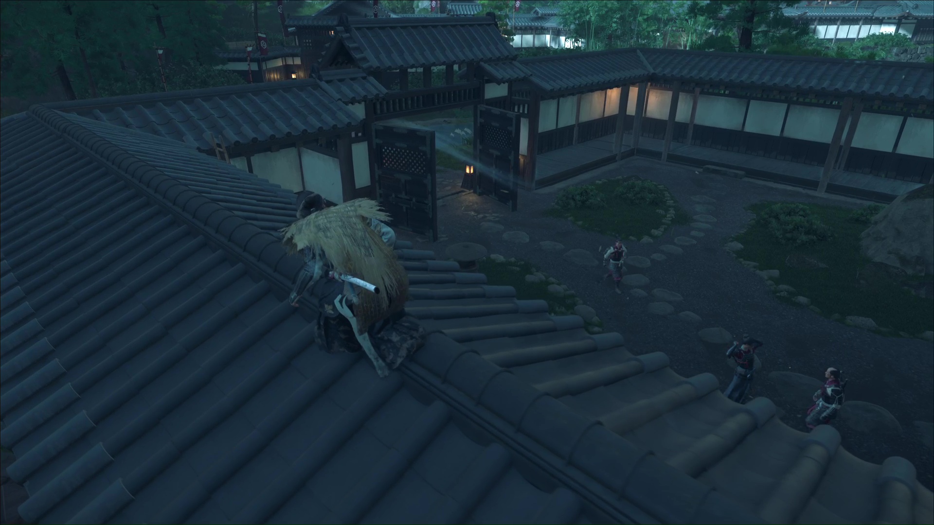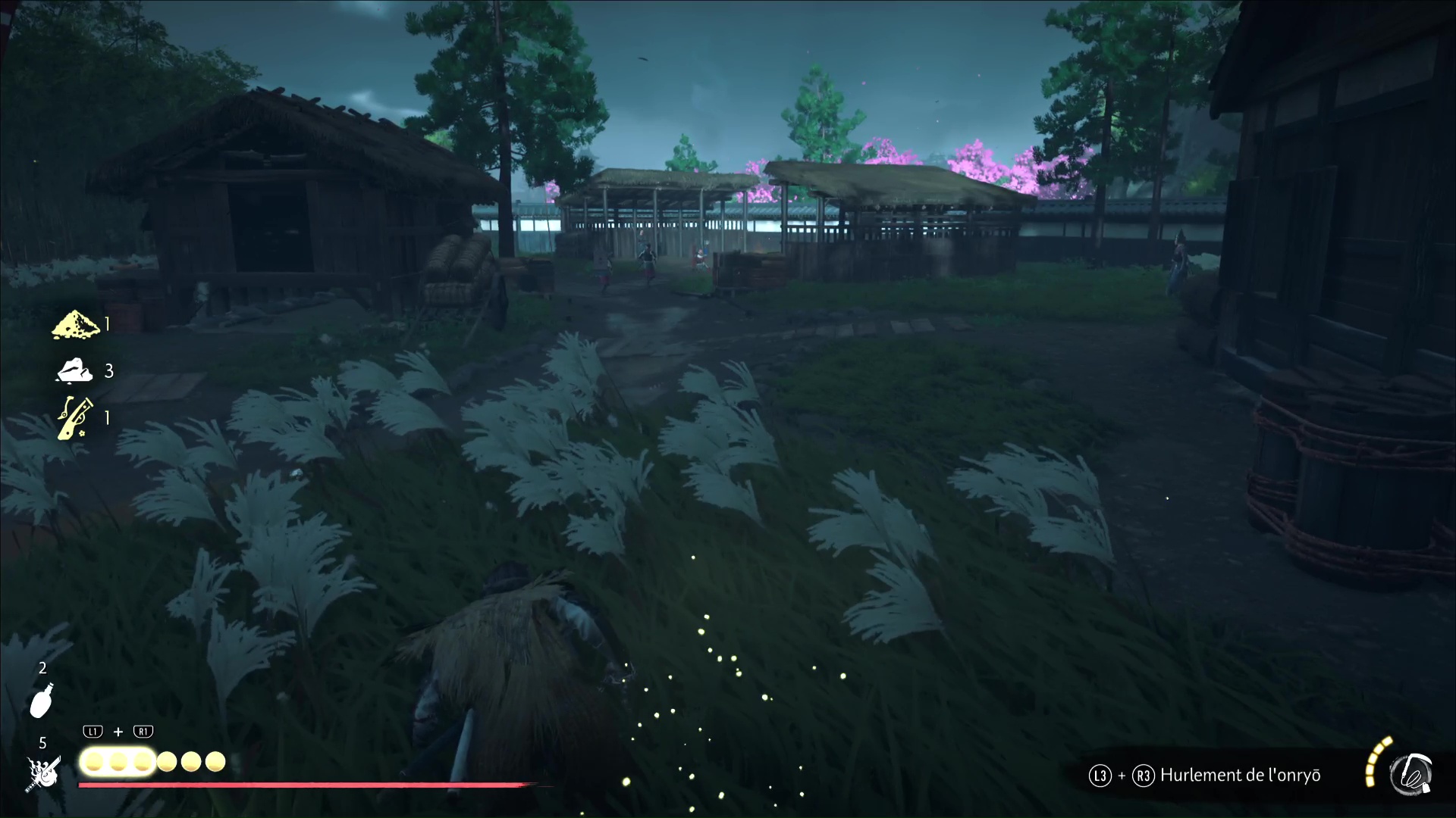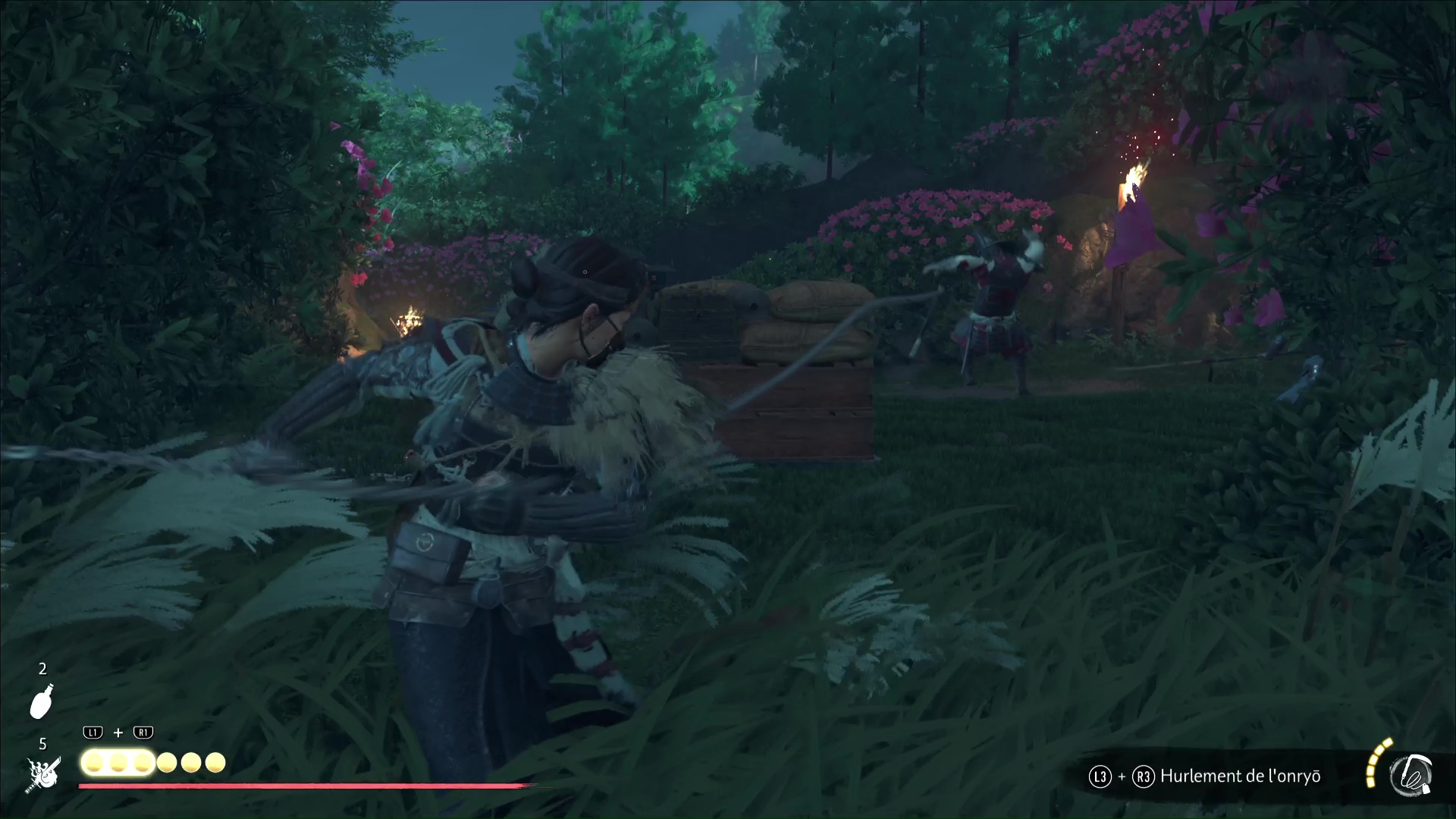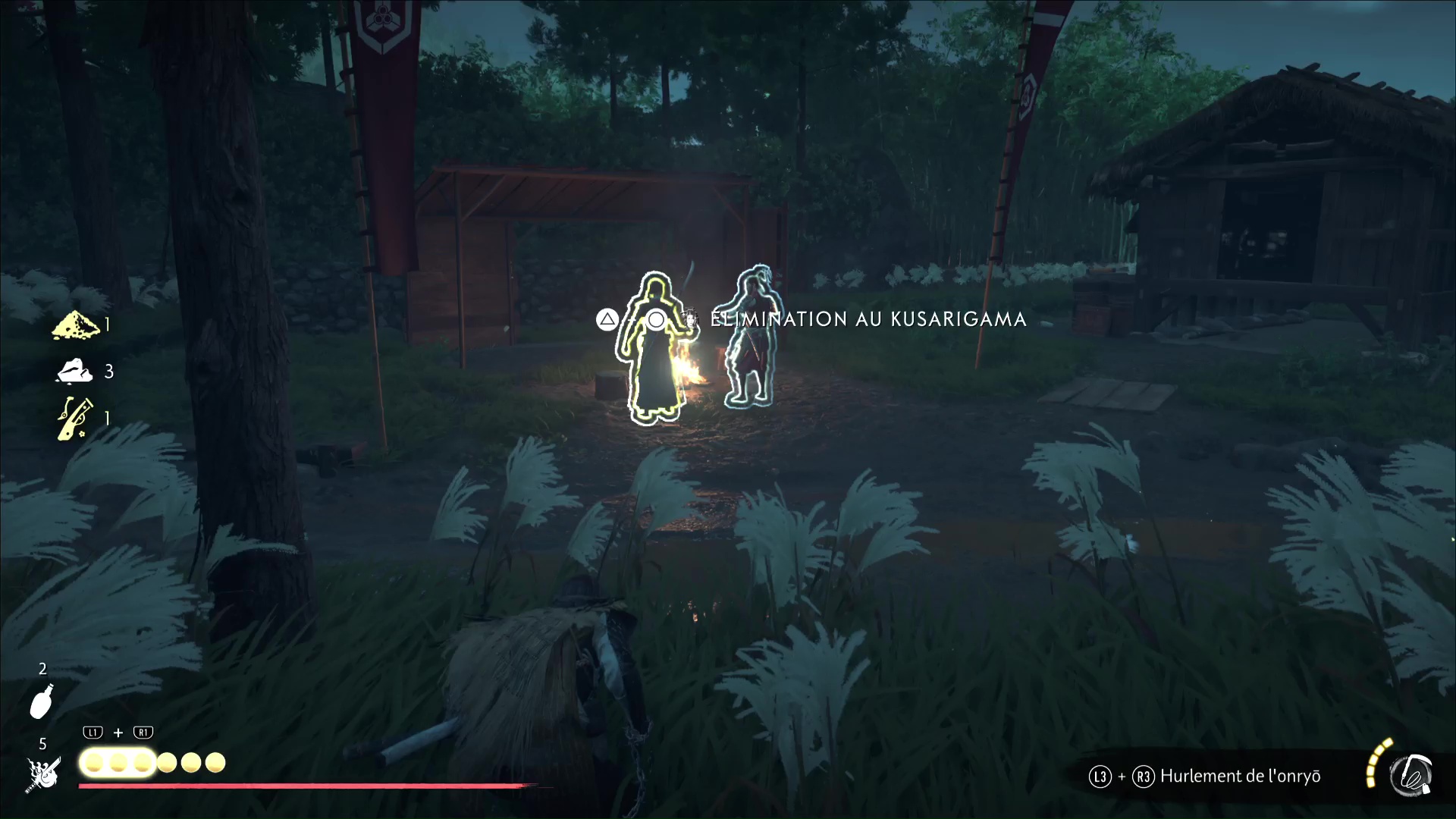 Vous débarquez alors rapidement derrière un duo de gardes. Vous connaissez la démarche, faites un double assassinat au kusarigama pour démarrer tranquillement cette nouvelle zone. Face au pont, prenez le chemin de gauche, au bout duquel un garde patrouille. Un petit coup de kusarigama discret et vous pourrez reprendre votre route.
