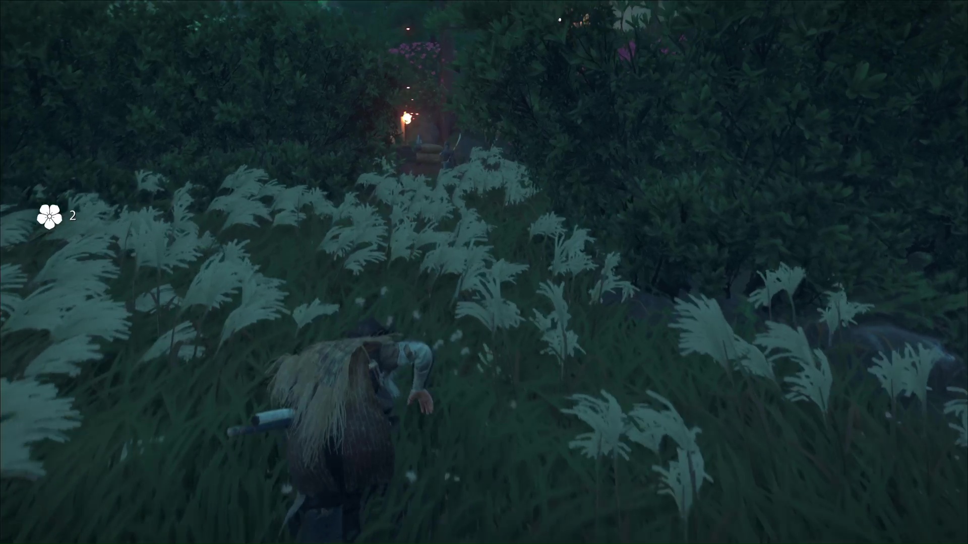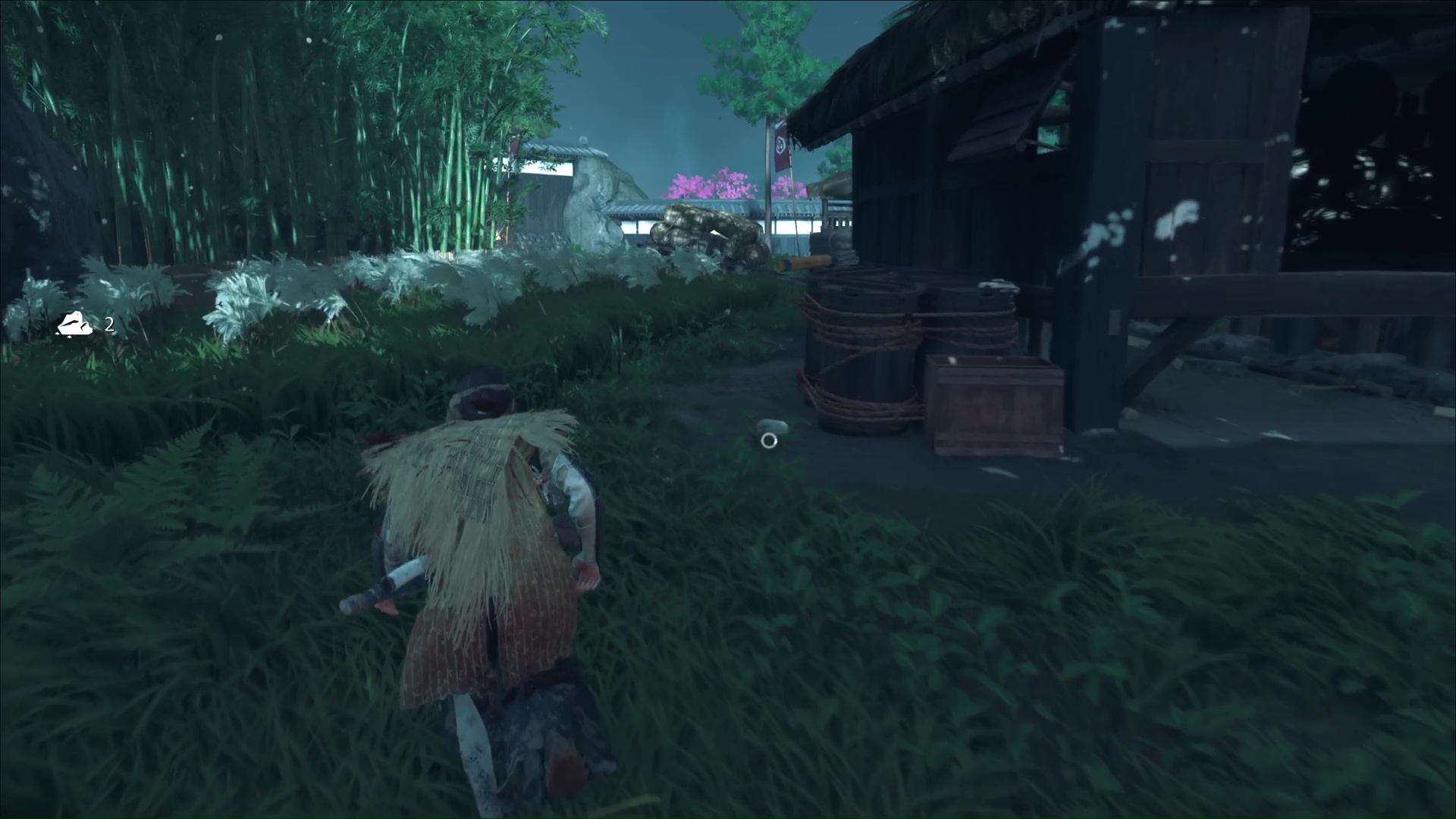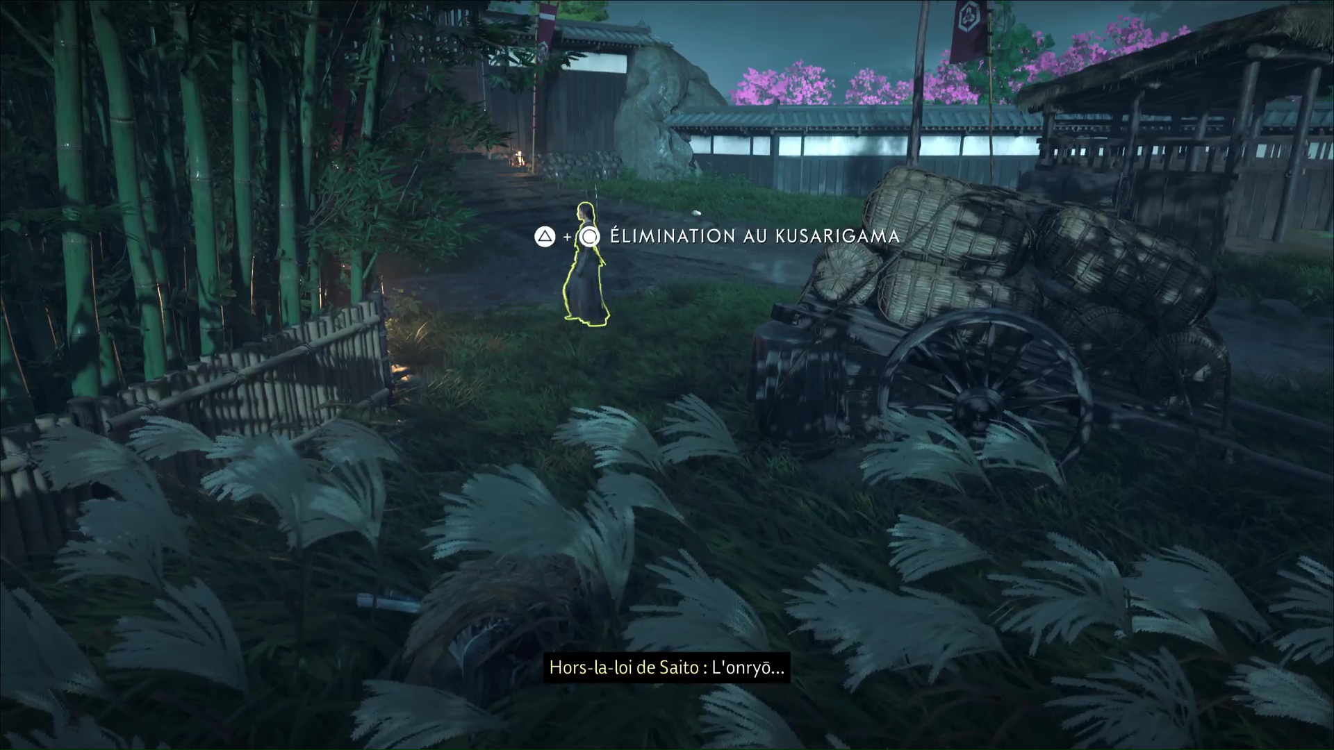 Sans plus attendre, rejoignez d’autres herbes hautes en face, jusqu’à atteindre une charrette de paniers de riz. Attendez qu’une autre tireuse soit à votre portée et éliminez-la au kusarigama en veillant à ce que la surbrillance autour d’elle soit bien jaune. Sinon, attendez qu’elle fasse demi-tour. Dans tous les cas, foncez vers la gauche pour atteindre un chemin au milieu de bambous.