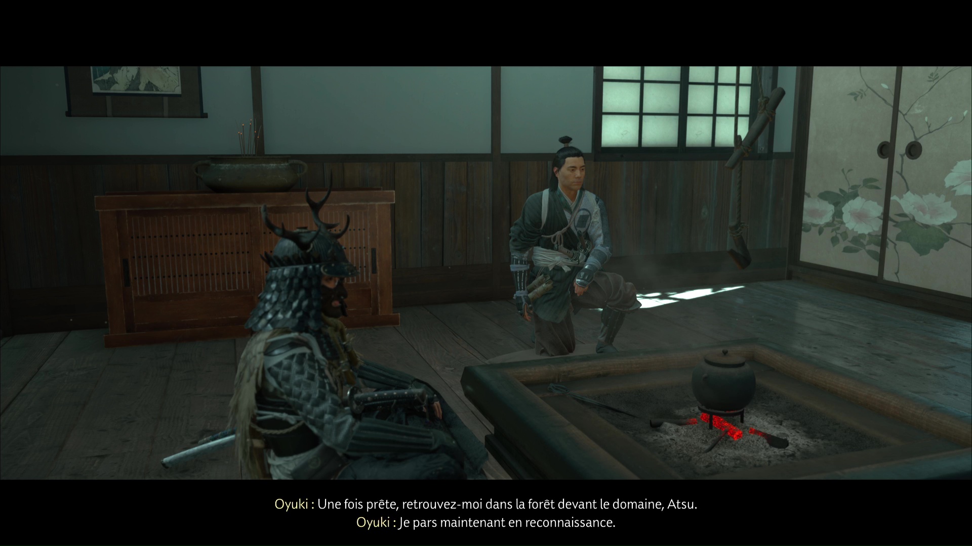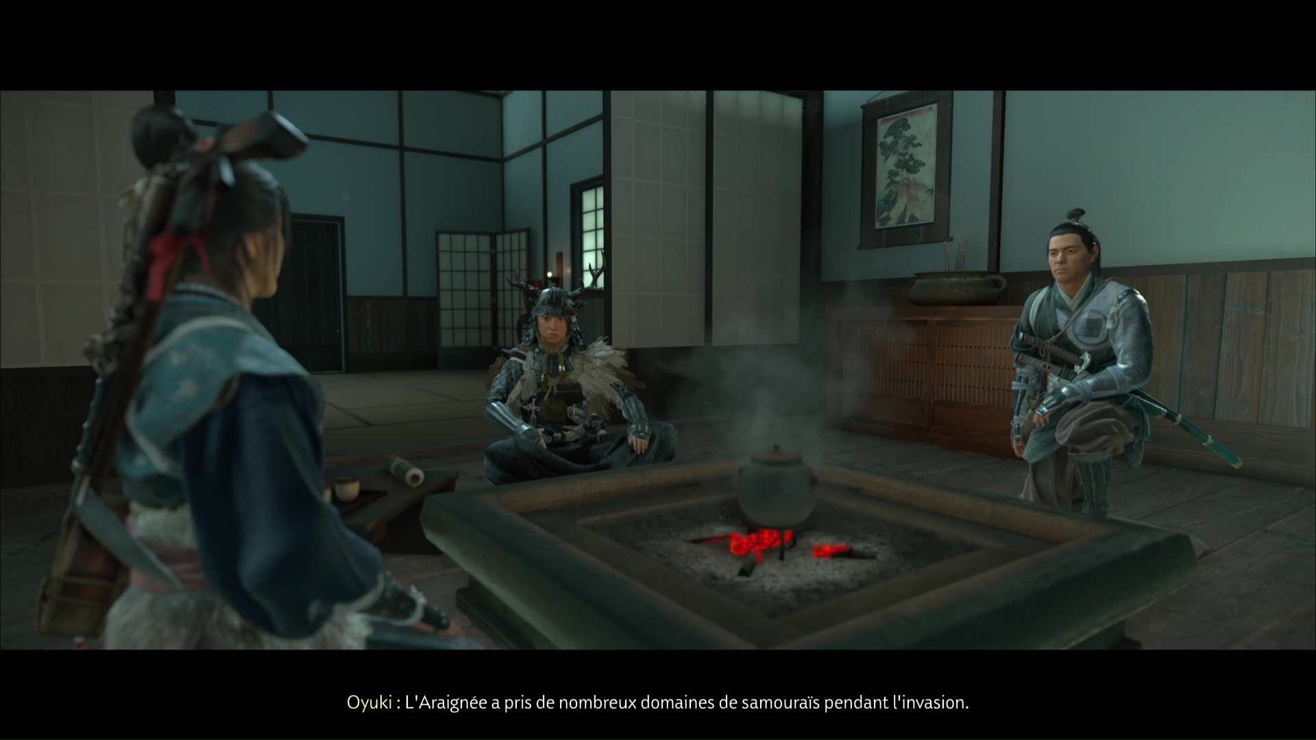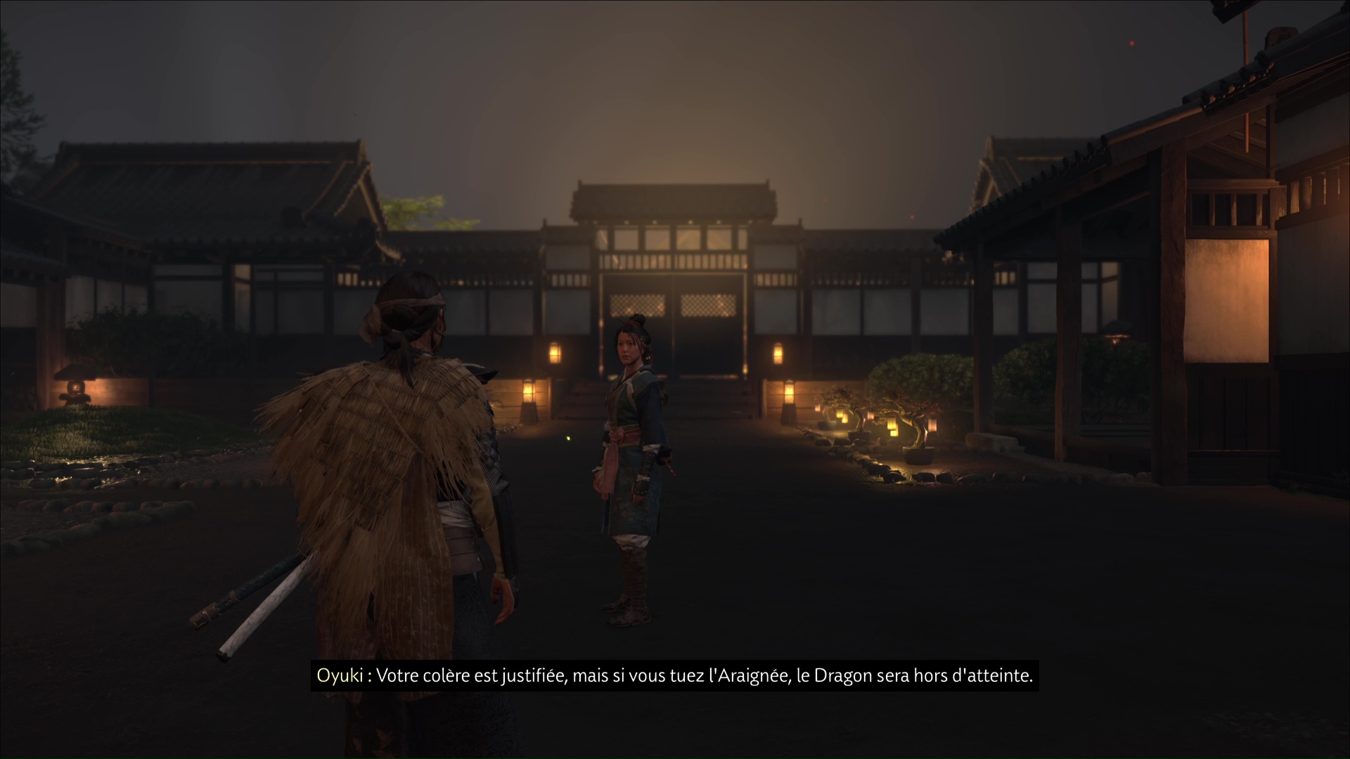 Entrez et vous allez être briefé par Jubei et Oyuki. L’Araignée a pris possession de certains domaines durant l’invasion. Il se cacherait actuellement dans le domaine des Tamura. Le plan consiste à le capturer pour attirer le Dragon. Pour ce faire, Oyuki et Atsu iront au domaine et s’infiltreront pour mettre la main sur l’Araignée.