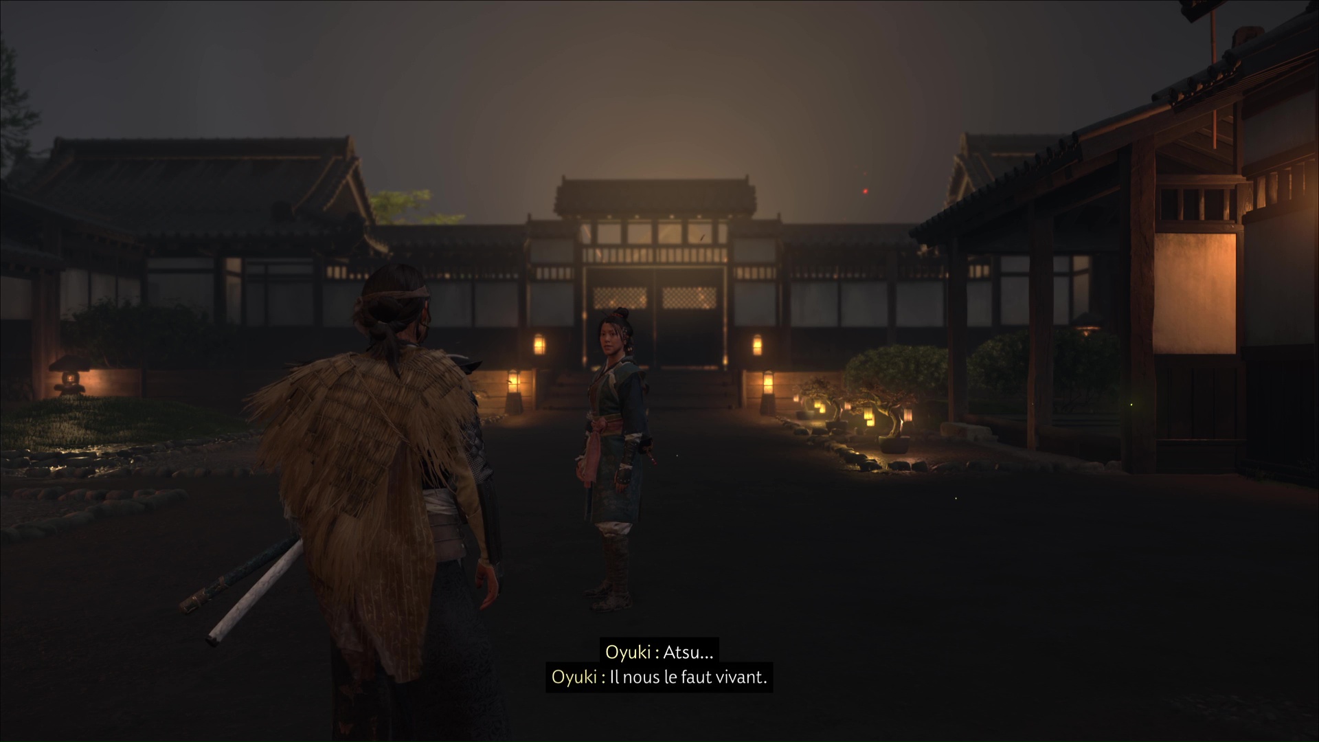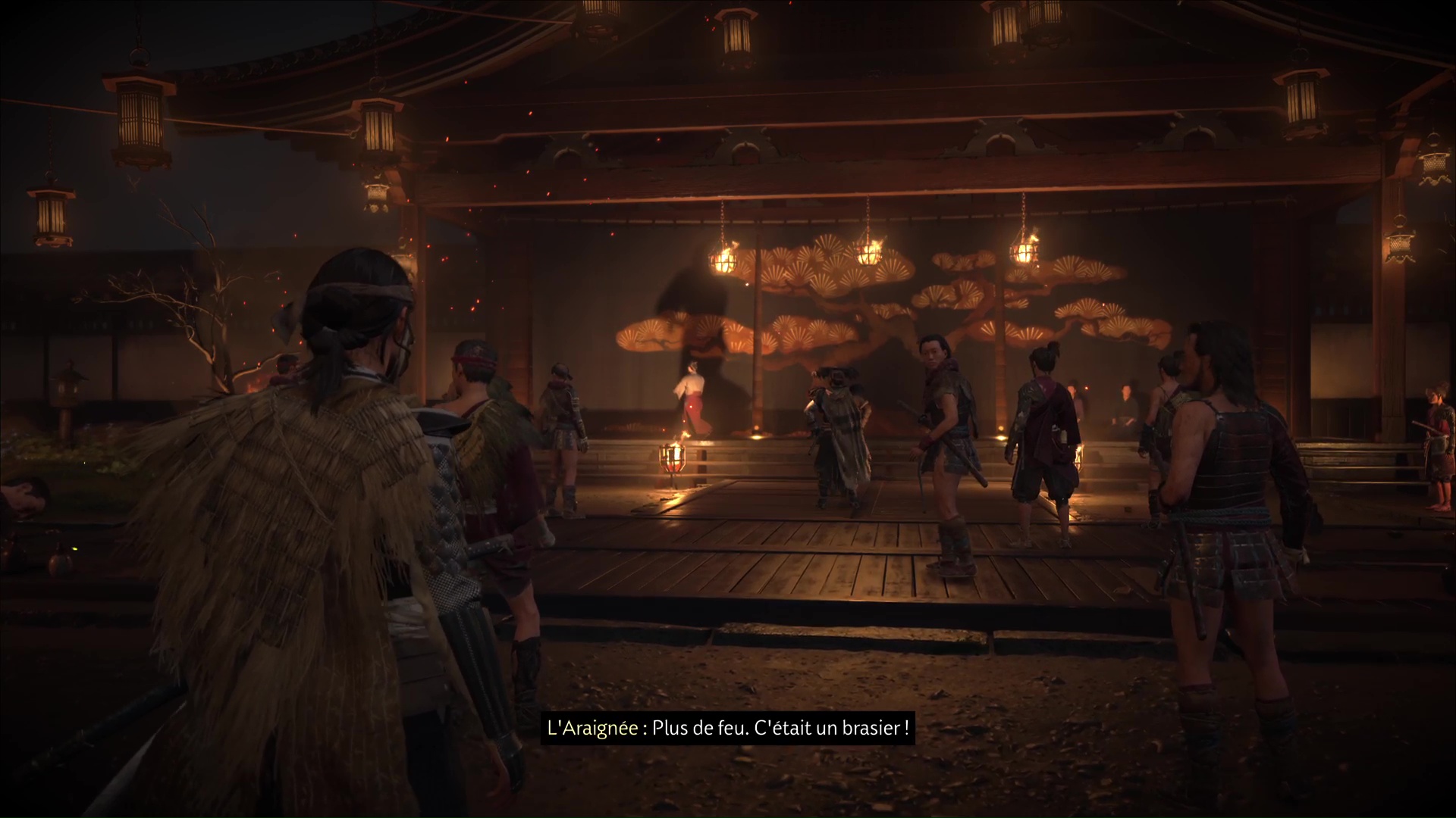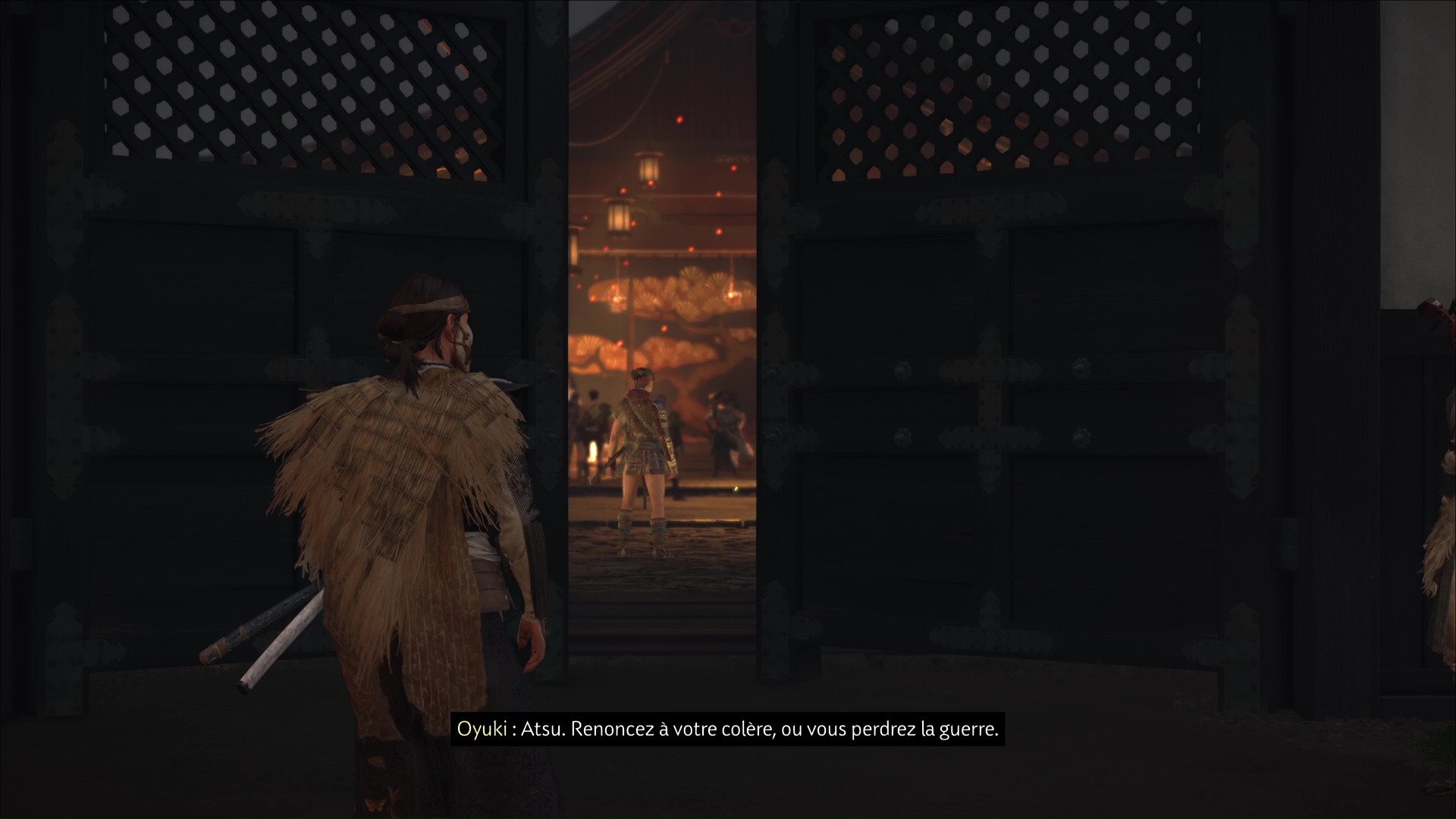 Vous voici à présent dehors, à quelques mètres de la représentation. Oyuki est consciente de l’état d’esprit d’Atsu, et lui demande de se retenir. L’Araignée doit être capturé vivant. Présentez-vous devant la porte, et entrez.