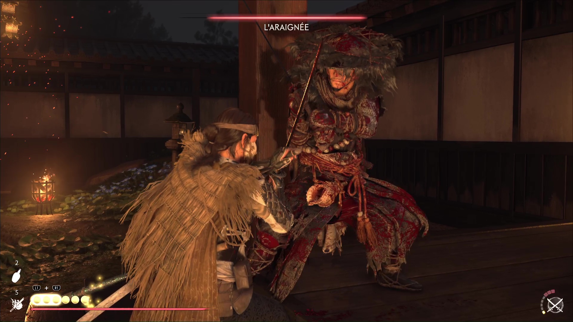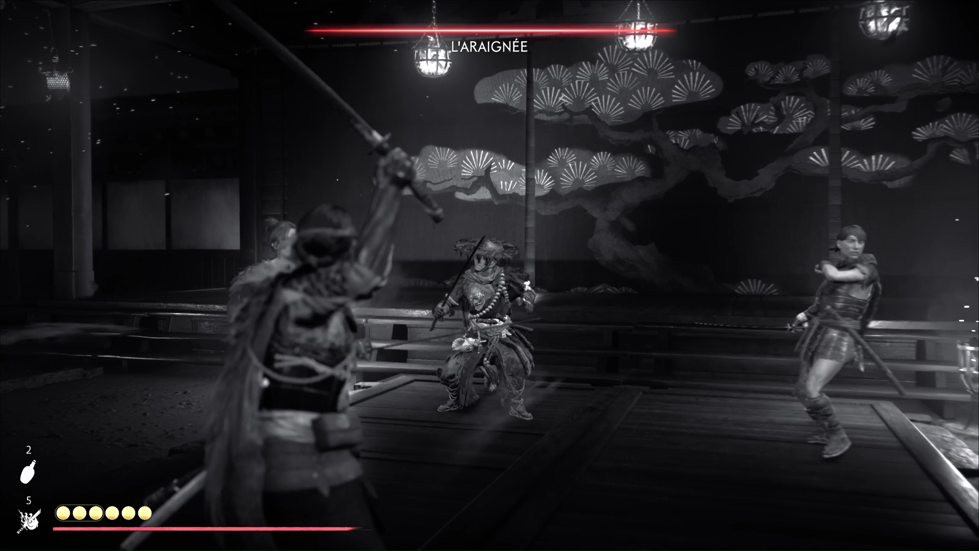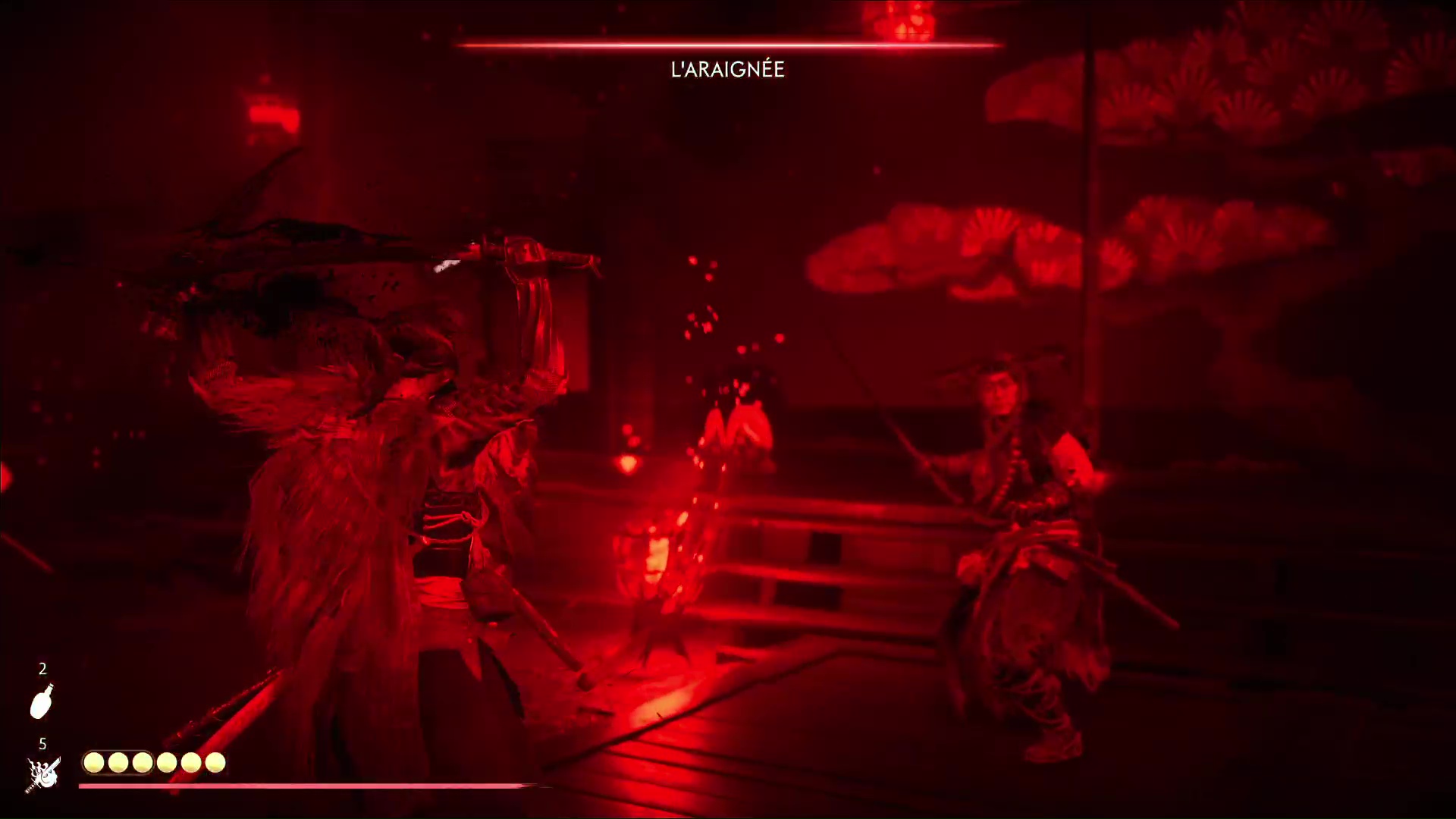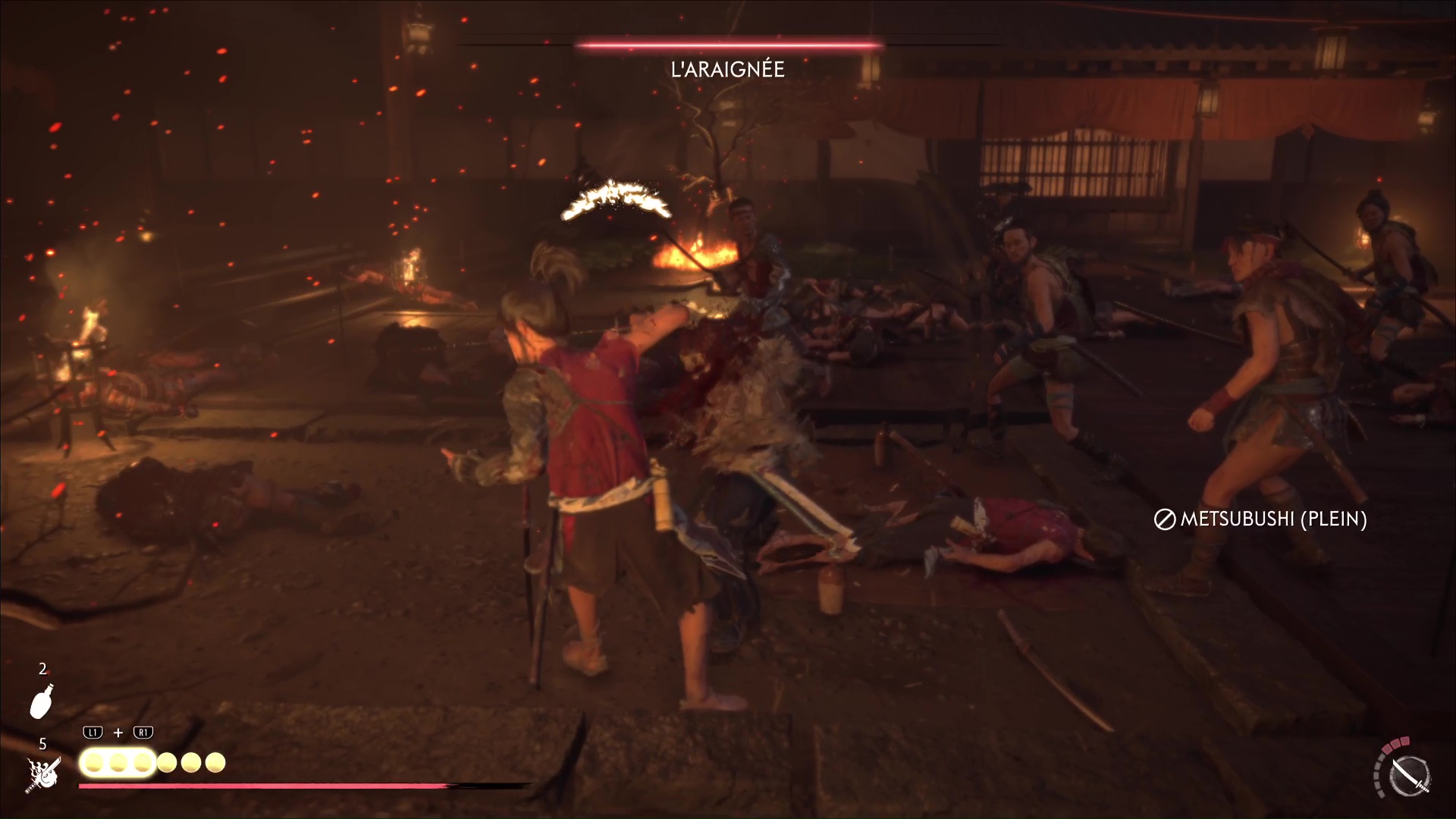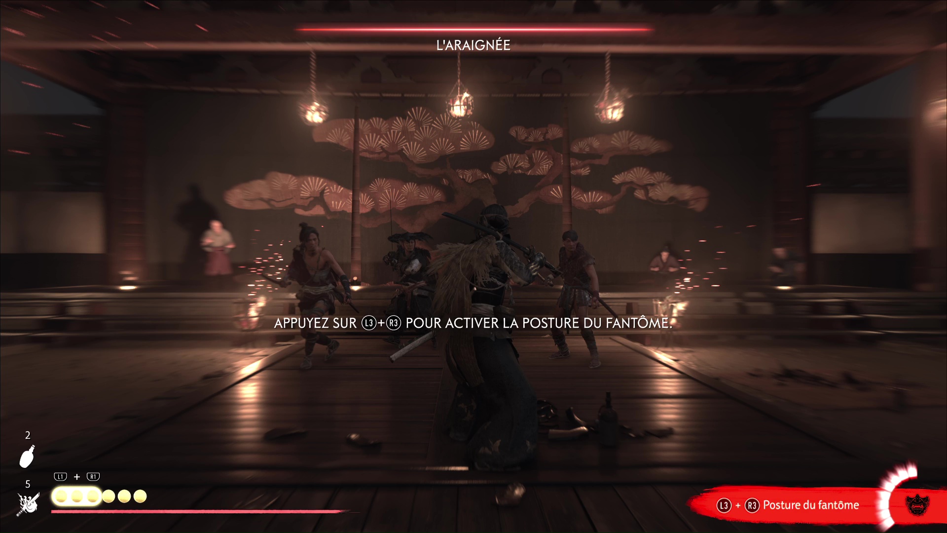 Tuer des ennemis sans se faire toucher fait donc monter cette jauge et il y a justement des sbires qui accompagnent l’Araignée. Si jamais vous arrivez à nouveau à utiliser une fois ou deux la posture de fantôme, n’hésitez surtout pas. Il y a énormément d’ennemis, mais rassurez-vous. Premièrement, il s’agit d’ennemis simples, sans protection particulière et uniquement un sabre. Deuxièmement, ils n’apparaissent pas à l’infini.